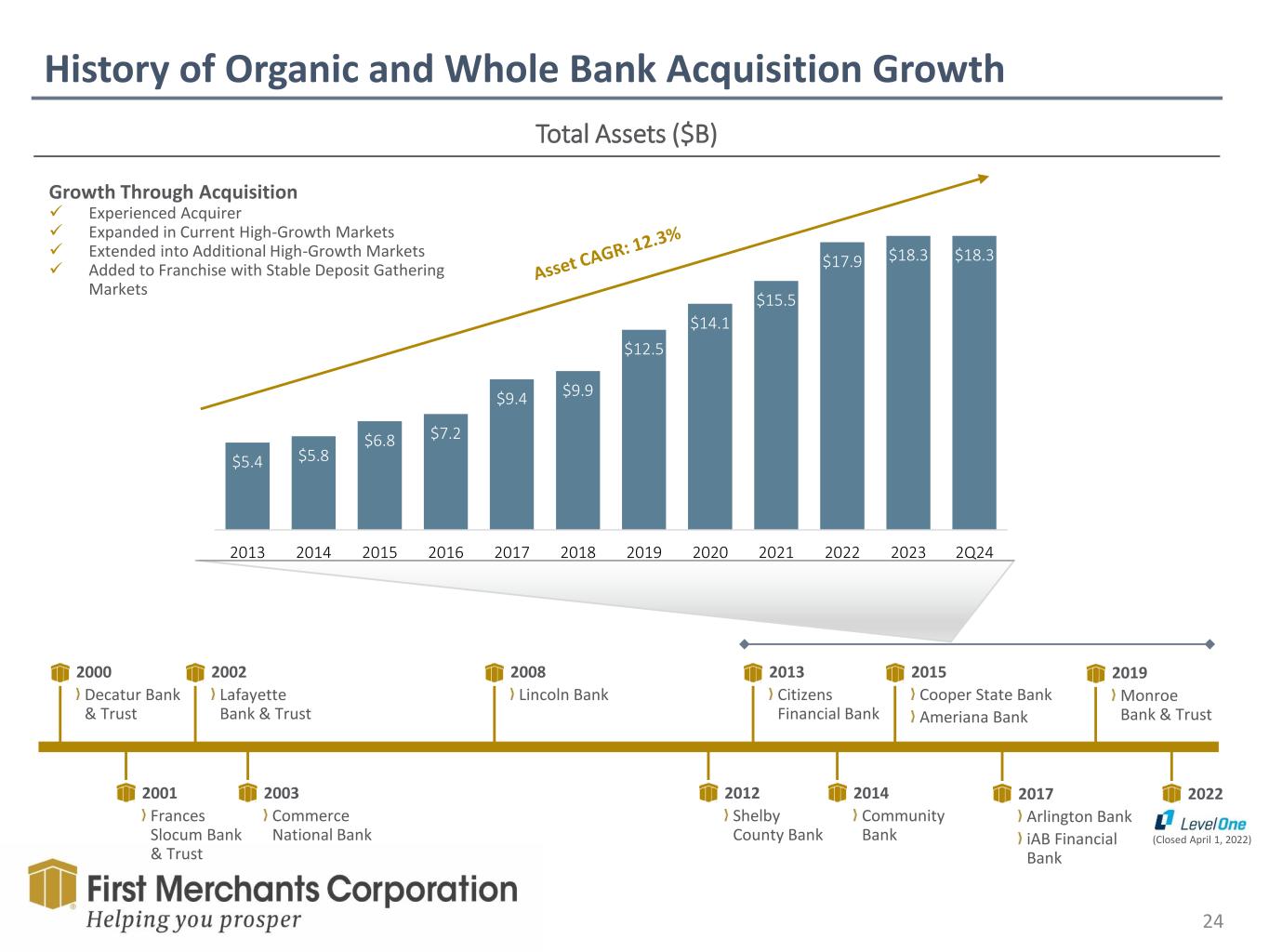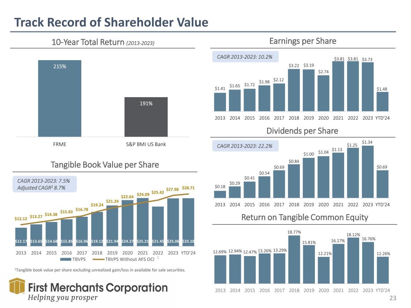 Track Record of Shareholder Value 23 10-Year Total Return (2013-2023) Earnings per Share Tangible Book Value per Share Dividends per Share CAGR 2013-2023: 10.2% CAGR 2013-2023: 7.5% Adjusted CAGR1 8.7% Return on Tangible Common Equity 1Tangible book value per share excluding unrealized gain/loss in available for sale securities. CAGR 2013-2023: 22.2% 1 215% 191% FRME S&P BMI US Bank $1.41 $1.65 $1.72 $1.98 $2.12 $3.22 $3.19 $2.74 $3.81 $3.81 $3.73 $1.48 2013 2014 2015 2016 2017 2018 2019 2020 2021 2022 2023 YTD'24 $0.18 $0.29 $0.41 $0.54 $0.69 $0.84 $1.00 $1.04 $1.13 $1.25 $1.34 $0.69 2013 2014 2015 2016 2017 2018 2019 2020 2021 2022 2023 YTD'24 12.69% 12.94% 12.47% 13.26% 13.29% 18.77% 15.81% 12.21% 16.17% 18.12% 16.76% 12.26% 2013 2014 2015 2016 2017 2018 2019 2020 2021 2022 2023 YTD'24 $12.17 $13.65 $14.68 $15.85 $16.96 $19.12 $21.94 $24.27 $25.21 $21.45 $25.06 $25.10 $12.12 $13.27 $14.38 $15.83 $16.78 $19.24 $21.24 $22.64 $24.09 $25.42 $27.98 $28.71 2013 2014 2015 2016 2017 2018 2019 2020 2021 2022 2023 YTD'24 TBVPS TBVPS Without AFS OCI