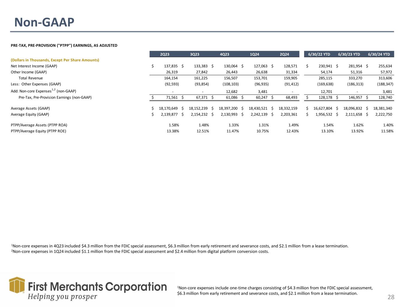 Non-GAAP 27 1Non-core expenses in 4Q23 included $4.3 million from the FDIC special assessment, $6.3 million from early retirement and severance costs, and $2.1 million from a lease termination. 2Non-core expenses in 1Q24 included $1.1 million from the FDIC special assessment and $2.4 million from digital platform conversion costs. ADJUSTED NET INCOME AND DILUTED EARNINGS PER COMMON SHARE 2Q23 3Q23 4Q23 1Q24 2Q24 6/30/22 YTD 6/30/23 YTD 6/30/24 YTD (Dollars in Thousands, Except Per Share Amounts) Net Income Available to Common Stockholders - GAAP 60,393$ 55,898$ 42,010$ 47,472$ 39,456$ 87,108$ 124,003$ 86,928$ Adjustments: PPP loan income (9) (8) (7) - - (2,775) (34) - Acquisition-related expenses - - - - - 12,701 - - Acquisition-related provision expense - - - - - 16,755 - - Non-core expenses1,2 - - 12,682 3,481 - - - 3,481 Tax on adjustments 2 2 (3,088) (848) - (6,542) 8 (848) Adjusted Net Income Available to Common Stockholders - NON-GAAP 60,386$ 55,892$ 51,597$ 50,105$ 39,456$ 107,247$ 123,977$ 89,561$ Average Diluted Common Shares Outstanding 59,448 59,503 59,556 59,273 58,328 56,516 59,446 58,800 Diluted Earnings Per Common Share - GAAP 1.02$ 0.94$ 0.71$ 0.80$ 0.68$ 1.54$ 2.09$ 1.48$ Adjustments: PPP loan income - - - - - (0.05) - - Acquisition-related expenses - - - - - 0.22 - - Acquisition-related provision expense - - - - - 0.30 - - Non-core expenses 1,2 - - 0.21 0.06 - - - 0.06 Tax on adjustments - - (0.05) (0.01) - (0.12) - (0.01) Adjusted Diluted Earnings Per Common Share - NON-GAAP 1.02$ 0.94$ 0.87$ 0.85$ 0.68$ 1.89$ 2.09$ 1.53$