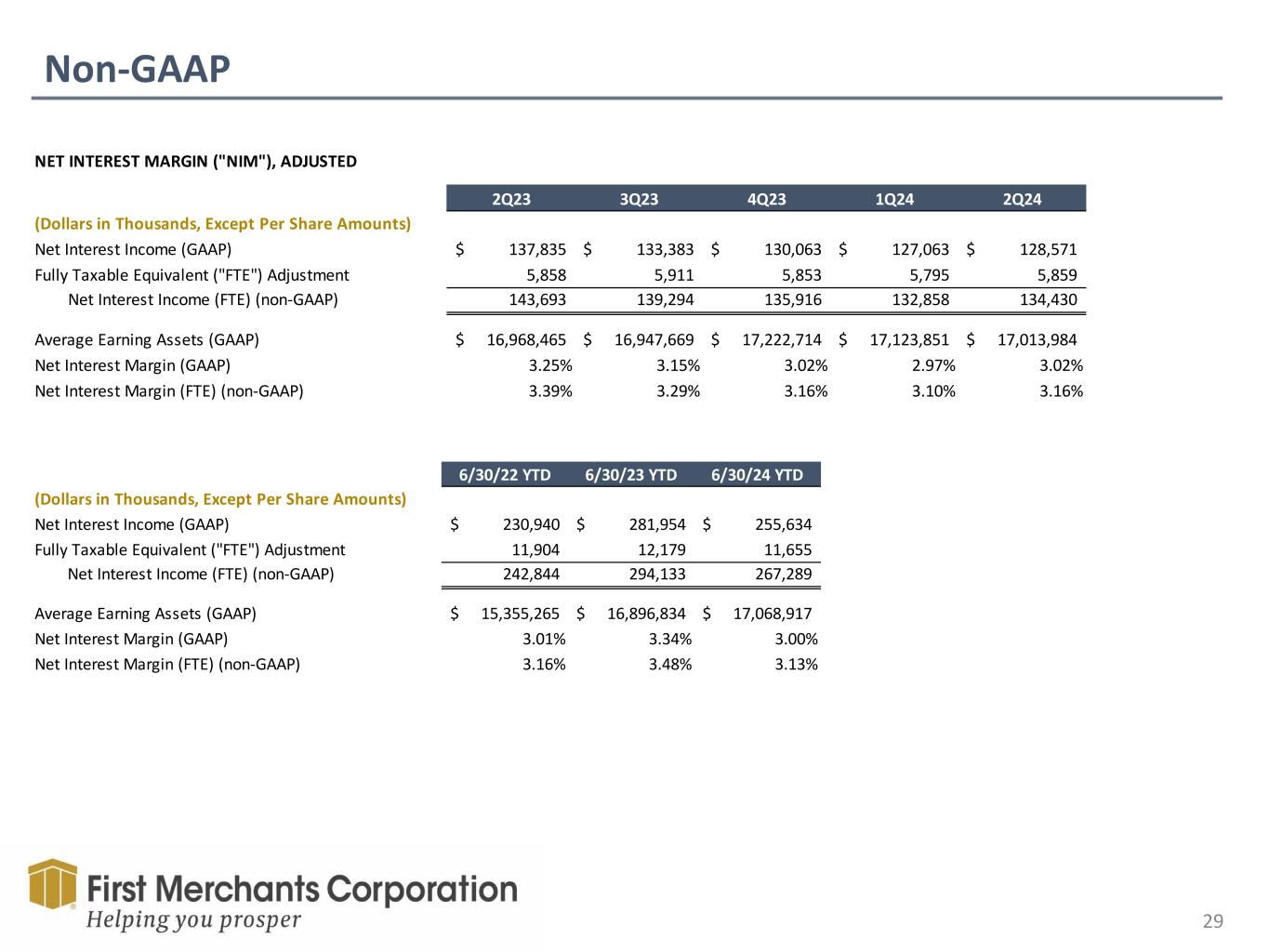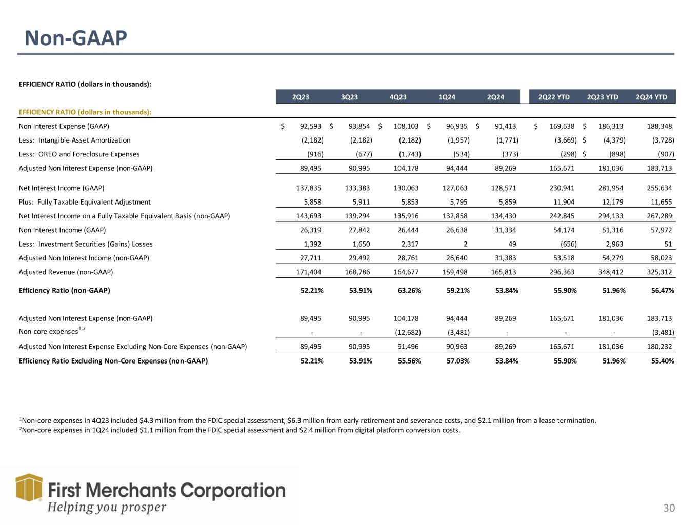 Non-GAAP 29 NET INTEREST MARGIN ("NIM"), ADJUSTED 2Q23 3Q23 4Q23 1Q24 2Q24 (Dollars in Thousands, Except Per Share Amounts) Net Interest Income (GAAP) 137,835$ 133,383$ 130,063$ 127,063$ 128,571$ Fully Taxable Equivalent ("FTE") Adjustment 5,858 5,911 5,853 5,795 5,859 Net Interest Income (FTE) (non-GAAP) 143,693 139,294 135,916 132,858 134,430 Average Earning Assets (GAAP) 16,968,465$ 16,947,669$ 17,222,714$ 17,123,851$ 17,013,984$ Net Interest Margin (GAAP) 3.25% 3.15% 3.02% 2.97% 3.02% Net Interest Margin (FTE) (non-GAAP) 3.39% 3.29% 3.16% 3.10% 3.16% 6/30/22 YTD 6/30/23 YTD 6/30/24 YTD (Dollars in Thousands, Except Per Share Amounts) Net Interest Income (GAAP) 230,940$ 281,954$ 255,634$ Fully Taxable Equivalent ("FTE") Adjustment 11,904 12,179 11,655 Net Interest Income (FTE) (non-GAAP) 242,844 294,133 267,289 Average Earning Assets (GAAP) 15,355,265$ 16,896,834$ 17,068,917$ Net Interest Margin (GAAP) 3.01% 3.34% 3.00% Net Interest Margin (FTE) (non-GAAP) 3.16% 3.48% 3.13%