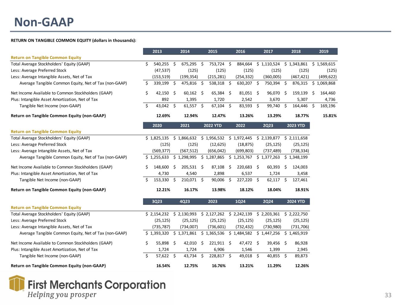 Non-GAAP 32 TANGIBLE COMMON EQUITY RATIO (dollars in thousands): 2Q22 2Q23 3Q23 4Q23 1Q24 2Q24 Tangible Common Equity Ratio (dollars in thousands) Total Stockholders' Equity (GAAP) 1,977,641$ 2,145,565$ 2,092,644$ 2,247,713$ 2,224,803$ 2,212,525$ Less: Preferred Stock (25,125) (25,125) (25,125) (25,125) (25,125) (25,125) Less: Intangible Assets (753,649) (743,465) (741,283) (739,101) (737,144) (735,373) Tangible Common Equity (non-GAAP) 1,198,867$ 1,376,975$ 1,326,236$ 1,483,487$ 1,462,534$ 1,452,027$ Total Assets (GAAP) 17,780,492$ 18,032,256$ 18,078,263$ 18,405,887$ 18,317,803$ 18,303,423$ Less: Intangible Assets (753,649) (743,465) (741,283) (739,101) (737,144) (735,373) Tangible Assets (non-GAAP) 17,026,843$ 17,288,791$ 17,336,980$ 17,666,786$ 17,580,659$ 17,568,050$ Tangible Common Equity Ratio (non-GAAP) 7.04% 7.96% 7.65% 8.40% 8.32% 8.27% TANGIBLE COMMON EQUITY PER SHARE (dollars in thousands): 4Q13 4Q14 4Q15 4Q16 4Q17 4Q18 4Q19 4Q20 Tangible Common Equity Per Share Total Stockholders' Equity (GAAP) 634,923$ 726,827$ 850,509$ 901,657$ 1,303,463$ 1,408,260$ 1,786,437$ 1,875,645$ Less: Preferred Stock (125) (125) (125) (125) (125) (125) (125) (125) Less: Intangible Assets (202,767) (218,755) (259,764) (258,866) (476,503) (469,784) (578,881) (572,893) Tax Benefit 4,973 6,085 6,278 5,930 6,788 5,017 7,257 5,989 Tangible Common Equity, Net of Tax (non-GAAP) 437,004$ 514,032$ 596,898$ 648,596$ 833,623$ 943,368$ 1,214,688$ 1,308,616$ Common Shares Outstanding 35,921,761 37,669,948 40,664,258 40,912,697 49,158,238 49,349,800 55,368,482 53,922,359 Tangible Common Equity per Share (non-GAAP) 12.17$ 13.65$ 14.68$ 15.85$ 16.96$ 19.12$ 21.94$ 24.27$ 4Q21 2Q22 4Q22 2Q23 3Q23 4Q23 1Q24 2Q24 Tangible Common Equity Per Share Total Stockholders' Equity (GAAP) 1,912,571$ 1,977,641$ 2,034,770$ 2,145,565$ 2,092,644$ 2,247,713$ 2,224,803$ 2,212,525$ Less: Preferred Stock (125) (25,125) (25,125) (25,125) (25,125) (25,125) (25,125) (25,125) Less: Intangible Assets (570,860) (753,649) (747,844) (743,465) (741,283) (739,101) (737,144) (735,373) Tax Benefit 4,875 8,692 7,702 6,760 6,290 5,819 5,398 5,020 Tangible Common Equity, Net of Tax (non-GAAP) 1,346,461$ 1,207,559$ 1,269,503$ 1,383,735$ 1,332,526$ 1,489,306$ 1,467,932$ 1,457,047$ Common Shares Outstanding 53,410,411 59,059,866 59,170,583 59,297,148 59,398,022 59,424,122 58,564,819 58,045,653 Tangible Common Equity per Share (non-GAAP) 25.21$ 20.45$ 21.45$ 23.34$ 22.43$ 25.06$ 25.07$ 25.10$
