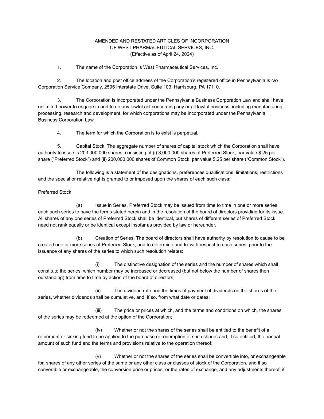 AMENDED AND RESTATED ARTICLES OF INCORPORATION OF WEST PHARMACEUTICAL SERVICES, INC. (Effective as of April 24, 2024) 1. The name of the Corporation is West Pharmaceutical Services, Inc. 2. The location and post office address of the Corporation’s registered office in Pennsylvania is c/o Corporation Service Company, 2595 Interstate Drive, Suite 103, Harrisburg, PA 17110. 3. The Corporation is incorporated under the Pennsylvania Business Corporation Law and shall have unlimited power to engage in and to do any lawful act concerning any or all lawful business, including manufacturing, processing, research and development, for which corporations may be incorporated under the Pennsylvania Business Corporation Law. 4. The term for which the Corporation is to exist is perpetual. 5. Capital Stock. The aggregate number of shares of capital stock which the Corporation shall have authority to issue is 203,000,000 shares, consisting of (i) 3,000,000 shares of Preferred Stock, par value $.25 per share (“Preferred Stock”) and (ii) 200,000,000 shares of Common Stock, par value $.25 per share (“Common Stock”). The following is a statement of the designations, preferences qualifications, limitations, restrictions and the special or relative rights granted to or imposed upon the shares of each such class: Preferred Stock (a) Issue in Series. Preferred Stock may be issued from time to time in one or more series, each such series to have the terms stated herein and in the resolution of the board of directors providing for its issue. All shares of any one series of Preferred Stock shall be identical, but shares of different series of Preferred Stock need not rank equally or be identical except insofar as provided by law or hereunder. (b) Creation of Series. The board of directors shall have authority by resolution to cause to be created one or more series of Preferred Stock, and to determine and fix with respect to each series, prior to the issuance of any shares of the series to which such resolution relates: (i) The distinctive designation of the series and the number of shares which shall constitute the series, which number may be increased or decreased (but not below the number of shares then outstanding) from time to time by action of the board of directors; (ii) The dividend rate and the times of payment of dividends on the shares of the series, whether dividends shall be cumulative, and, if so, from what date or dates; (iii) The price or prices at which, and the terms and conditions on which, the shares of the series may be redeemed at the option of the Corporation; (iv) Whether or not the shares of the series shall be entitled to the benefit of a retirement or sinking fund to be applied to the purchase or redemption of such shares and, if so entitled, the annual amount of such fund and the terms and provisions relative to the operation thereof; (v) Whether or not the shares of the series shall be convertible into, or exchangeable for, shares of any other series of the same or any other class or classes of stock of the Corporation, and if so convertible or exchangeable, the conversion price or prices, or the rates of exchange, and any adjustments thereof, if