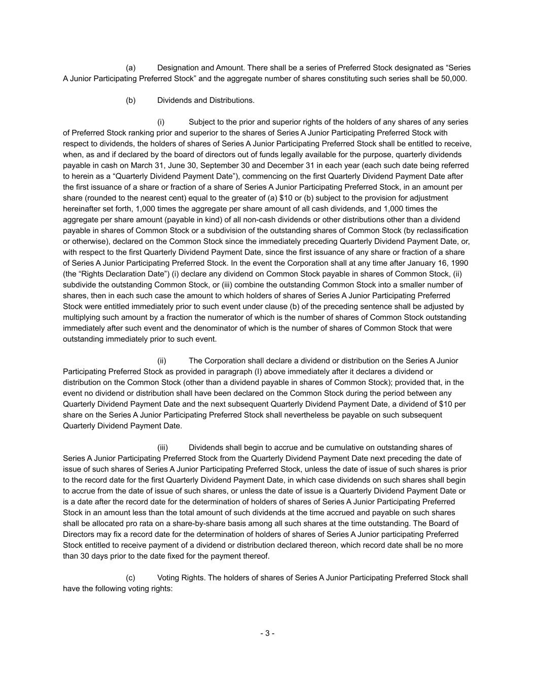- 3 - (a) Designation and Amount. There shall be a series of Preferred Stock designated as “Series A Junior Participating Preferred Stock” and the aggregate number of shares constituting such series shall be 50,000. (b) Dividends and Distributions. (i) Subject to the prior and superior rights of the holders of any shares of any series of Preferred Stock ranking prior and superior to the shares of Series A Junior Participating Preferred Stock with respect to dividends, the holders of shares of Series A Junior Participating Preferred Stock shall be entitled to receive, when, as and if declared by the board of directors out of funds legally available for the purpose, quarterly dividends payable in cash on March 31, June 30, September 30 and December 31 in each year (each such date being referred to herein as a “Quarterly Dividend Payment Date”), commencing on the first Quarterly Dividend Payment Date after the first issuance of a share or fraction of a share of Series A Junior Participating Preferred Stock, in an amount per share (rounded to the nearest cent) equal to the greater of (a) $10 or (b) subject to the provision for adjustment hereinafter set forth, 1,000 times the aggregate per share amount of all cash dividends, and 1,000 times the aggregate per share amount (payable in kind) of all non-cash dividends or other distributions other than a dividend payable in shares of Common Stock or a subdivision of the outstanding shares of Common Stock (by reclassification or otherwise), declared on the Common Stock since the immediately preceding Quarterly Dividend Payment Date, or, with respect to the first Quarterly Dividend Payment Date, since the first issuance of any share or fraction of a share of Series A Junior Participating Preferred Stock. In the event the Corporation shall at any time after January 16, 1990 (the “Rights Declaration Date”) (i) declare any dividend on Common Stock payable in shares of Common Stock, (ii) subdivide the outstanding Common Stock, or (iii) combine the outstanding Common Stock into a smaller number of shares, then in each such case the amount to which holders of shares of Series A Junior Participating Preferred Stock were entitled immediately prior to such event under clause (b) of the preceding sentence shall be adjusted by multiplying such amount by a fraction the numerator of which is the number of shares of Common Stock outstanding immediately after such event and the denominator of which is the number of shares of Common Stock that were outstanding immediately prior to such event. (ii) The Corporation shall declare a dividend or distribution on the Series A Junior Participating Preferred Stock as provided in paragraph (I) above immediately after it declares a dividend or distribution on the Common Stock (other than a dividend payable in shares of Common Stock); provided that, in the event no dividend or distribution shall have been declared on the Common Stock during the period between any Quarterly Dividend Payment Date and the next subsequent Quarterly Dividend Payment Date, a dividend of $10 per share on the Series A Junior Participating Preferred Stock shall nevertheless be payable on such subsequent Quarterly Dividend Payment Date. (iii) Dividends shall begin to accrue and be cumulative on outstanding shares of Series A Junior Participating Preferred Stock from the Quarterly Dividend Payment Date next preceding the date of issue of such shares of Series A Junior Participating Preferred Stock, unless the date of issue of such shares is prior to the record date for the first Quarterly Dividend Payment Date, in which case dividends on such shares shall begin to accrue from the date of issue of such shares, or unless the date of issue is a Quarterly Dividend Payment Date or is a date after the record date for the determination of holders of shares of Series A Junior Participating Preferred Stock in an amount less than the total amount of such dividends at the time accrued and payable on such shares shall be allocated pro rata on a share-by-share basis among all such shares at the time outstanding. The Board of Directors may fix a record date for the determination of holders of shares of Series A Junior participating Preferred Stock entitled to receive payment of a dividend or distribution declared thereon, which record date shall be no more than 30 days prior to the date fixed for the payment thereof. (c) Voting Rights. The holders of shares of Series A Junior Participating Preferred Stock shall have the following voting rights:
