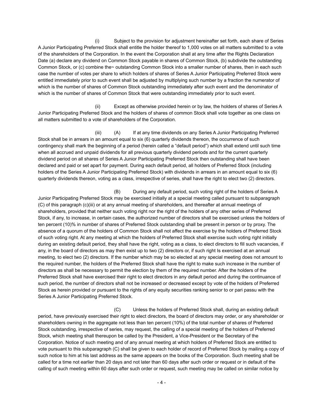 - 4 - (i) Subject to the provision for adjustment hereinafter set forth, each share of Series A Junior Participating Preferred Stock shall entitle the holder thereof to 1,000 votes on all matters submitted to a vote of the shareholders of the Corporation. In the event the Corporation shall at any time after the Rights Declaration Date (a) declare any dividend on Common Stock payable in shares of Common Stock, (b) subdivide the outstanding Common Stock, or (c) combine the~ outstanding Common Stock into a smaller number of shares, then in each such case the number of votes per share to which holders of shares of Series A Junior Participating Preferred Stock were entitled immediately prior to such event shall be adjusted by multiplying such number by a fraction the numerator of which is the number of shares of Common Stock outstanding immediately after such event and the denominator of which is the number of shares of Common Stock that were outstanding immediately prior to such event. (ii) Except as otherwise provided herein or by law, the holders of shares of Series A Junior Participating Preferred Stock and the holders of shares of common Stock shall vote together as one class on all matters submitted to a vote of shareholders of the Corporation. (iii) (A) If at any time dividends on any Series A Junior Participating Preferred Stock shall be in arrears in an amount equal to six (6) quarterly dividends thereon, the occurrence of such contingency shall mark the beginning of a period (herein called a “default period”) which shall extend until such time when all accrued and unpaid dividends for all previous quarterly dividend periods and for the current quarterly dividend period on all shares of Series A Junior Participating Preferred Stock then outstanding shall have been declared and paid or set apart for payment. During each default period, all holders of Preferred Stock (including holders of the Series A Junior Participating Preferred Stock) with dividends in arrears in an amount equal to six (6) quarterly dividends thereon, voting as a class, irrespective of series, shall have the right to elect two (2) directors. (B) During any default period, such voting right of the holders of Series A Junior Participating Preferred Stock may be exercised initially at a special meeting called pursuant to subparagraph (C) of this paragraph (c)(iii) or at any annual meeting of shareholders, and thereafter at annual meetings of shareholders, provided that neither such voting right nor the right of the holders of any other series of Preferred Stock, if any, to increase, in certain cases, the authorized number of directors shall be exercised unless the holders of ten percent (10)% in number of shares of Preferred Stock outstanding shall be present in person or by proxy. The absence of a quorum of the holders of Common Stock shall not affect the exercise by the holders of Preferred Stock of such voting right. At any meeting at which the holders of Preferred Stock shall exercise such voting right initially during an existing default period, they shall have the right, voting as a class, to elect directors to fill such vacancies, if any, in the board of directors as may then exist up to two (2) directors or, if such right Is exercised at an annual meeting, to elect two (2) directors. If the number which may be so elected at any special meeting does not amount to the required number, the holders of the Preferred Stock shall have the right to make such increase in the number of directors as shall be necessary to permit the election by them of the required number. After the holders of the Preferred Stock shall have exercised their right to elect directors in any default period and during the continuance of such period, the number of directors shall not be increased or decreased except by vote of the holders of Preferred Stock as herein provided or pursuant to the rights of any equity securities ranking senior to or pari passu with the Series A Junior Participating Preferred Stock. (C) Unless the holders of Preferred Stock shall, during an existing default period, have previously exercised their right to elect directors, the board of directors may order, or any shareholder or shareholders owning in the aggregate not less than ten percent (10%) of the total number of shares of Preferred Stock outstanding, irrespective of series, may request, the calling of a special meeting of the holders of Preferred Stock, which meeting shall thereupon be called by the President, a Vice-President or the Secretary of the Corporation. Notice of such meeting and of any annual meeting at which holders of Preferred Stock are entitled to vote pursuant to this subparagraph (C) shall be given to each holder of record of Preferred Stock by mailing a copy of such notice to him at his last address as the same appears on the books of the Corporation. Such meeting shall be called for a time not earlier than 20 days and not later than 60 days after such order or request or in default of the calling of such meeting within 60 days after such order or request, such meeting may be called on similar notice by