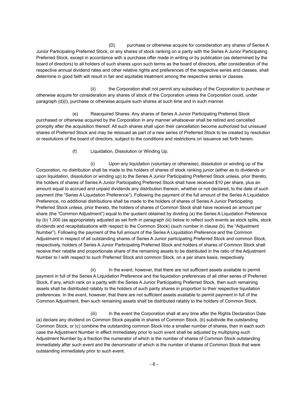 - 6 - (D) purchase or otherwise acquire for consideration any shares of Series A Junior Participating Preferred Stock, or any shares of stock ranking on a parity with the Series A Junior Participating Preferred Stock, except in accordance with a purchase offer made in writing or by publication (as determined by the board of directors) to all holders of such shares upon such terms as the board of directors, after consideration of the respective annual dividend rates and other relative rights and preferences of the respective series and classes, shall determine in good faith will result in fair and equitable treatment among the respective series or classes. (ii) the Corporation shall not permit any subsidiary of the Corporation to purchase or otherwise acquire for consideration any shares of stock of the Corporation unless the Corporation could, under paragraph (d)(i), purchase or otherwise acquire such shares at such time and in such manner. (e) Reacquired Shares. Any shares of Series A Junior Participating Preferred Stock purchased or otherwise acquired by the Corporation in any manner whatsoever shall be retired and cancelled promptly after the acquisition thereof. All such shares shall upon their cancellation become authorized but unissued shares of Preferred Stock and may be reissued as part of a new series of Preferred Stock to be created by resolution or resolutions of the board of directors, subject to the conditions and restrictions on issuance set forth herein. (f) Liquidation, Dissolution or Winding Up. (i) Upon any liquidation (voluntary or otherwise), dissolution or winding up of the Corporation, no distribution shall be made to the holders of shares of stock ranking junior (either as to dividends or upon liquidation, dissolution or winding up) to the Series A Junior Participating Preferred Stock unless, prior thereto, the holders of shares of Series A Junior Participating Preferred Stock shall have received $10 per share, plus an amount equal to accrued and unpaid dividends any distribution thereon, whether or not declared, to the date of such payment (the “Series A Liquidation Preference”). Following the payment of the full amount of the Series A Liquidation Preference, no additional distributions shall be made to the holders of shares of Series A Junior Participating Preferred Stock unless, prior thereto, the holders of shares of Common Stock shall have received an amount per share (the “Common Adjustment”) equal to the quotient obtained by dividing (a) the Series A Liquidation Preference by (b) 1,000 (as appropriately adjusted as set forth in paragraph (iii) below to reflect such events as stock splits, stock dividends and recapitalizations with respect to the Common Stock) (such number in clause (b), the “Adjustment Number”). Following the payment of the full amount of the Series A Liquidation Preference and the Common Adjustment in respect of all outstanding shares of Series A Junior participating Preferred Stock and common Stock, respectively, holders of Series A Junior Participating Preferred Stock and holders of shares of Common Stock shall receive their ratable and proportionate share of the remaining assets to be distributed in the ratio of the Adjustment Number to I with respect to such Preferred Stock and common Stock, on a per share basis, respectively. (ii) In the event, however, that there are not sufficient assets available to permit payment in full of the Series A Liquidation Preference and the liquidation preferences of all other series of Preferred Stock, if any, which rank on a parity with the Series A Junior Participating Preferred Stock, then such remaining assets shall be distributed ratably to the holders of such parity shares in proportion to their respective liquidation preferences. In the event, however, that there are not sufficient assets available to permit payment in full of the Common Adjustment, then such remaining assets shall be distributed ratably to the holders of Common Stock. (iii) In the event the Corporation shall at any time after the Rights Declaration Date (a) declare any dividend on Common Stock payable in shares of Common Stock, (b) subdivide the outstanding Common Stock, or (c) combine the outstanding common Stock into a smaller number of shares, then in each such case the Adjustment Number in effect immediately prior to such event shall be adjusted by multiplying such Adjustment Number by a fraction the numerator of which is the number of shares of Common Stock outstanding immediately after such event and the denominator of which is the number of shares of Common Stock that were outstanding immediately prior to such event.