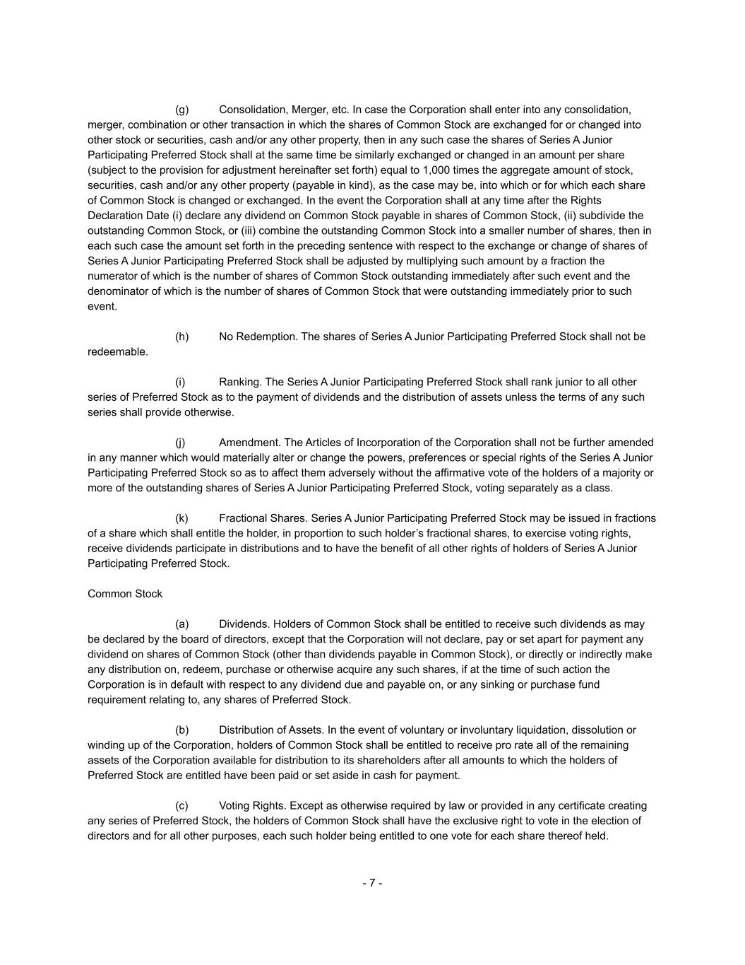 - 7 - (g) Consolidation, Merger, etc. In case the Corporation shall enter into any consolidation, merger, combination or other transaction in which the shares of Common Stock are exchanged for or changed into other stock or securities, cash and/or any other property, then in any such case the shares of Series A Junior Participating Preferred Stock shall at the same time be similarly exchanged or changed in an amount per share (subject to the provision for adjustment hereinafter set forth) equal to 1,000 times the aggregate amount of stock, securities, cash and/or any other property (payable in kind), as the case may be, into which or for which each share of Common Stock is changed or exchanged. In the event the Corporation shall at any time after the Rights Declaration Date (i) declare any dividend on Common Stock payable in shares of Common Stock, (ii) subdivide the outstanding Common Stock, or (iii) combine the outstanding Common Stock into a smaller number of shares, then in each such case the amount set forth in the preceding sentence with respect to the exchange or change of shares of Series A Junior Participating Preferred Stock shall be adjusted by multiplying such amount by a fraction the numerator of which is the number of shares of Common Stock outstanding immediately after such event and the denominator of which is the number of shares of Common Stock that were outstanding immediately prior to such event. (h) No Redemption. The shares of Series A Junior Participating Preferred Stock shall not be redeemable. (i) Ranking. The Series A Junior Participating Preferred Stock shall rank junior to all other series of Preferred Stock as to the payment of dividends and the distribution of assets unless the terms of any such series shall provide otherwise. (j) Amendment. The Articles of Incorporation of the Corporation shall not be further amended in any manner which would materially alter or change the powers, preferences or special rights of the Series A Junior Participating Preferred Stock so as to affect them adversely without the affirmative vote of the holders of a majority or more of the outstanding shares of Series A Junior Participating Preferred Stock, voting separately as a class. (k) Fractional Shares. Series A Junior Participating Preferred Stock may be issued in fractions of a share which shall entitle the holder, in proportion to such holder’s fractional shares, to exercise voting rights, receive dividends participate in distributions and to have the benefit of all other rights of holders of Series A Junior Participating Preferred Stock. Common Stock (a) Dividends. Holders of Common Stock shall be entitled to receive such dividends as may be declared by the board of directors, except that the Corporation will not declare, pay or set apart for payment any dividend on shares of Common Stock (other than dividends payable in Common Stock), or directly or indirectly make any distribution on, redeem, purchase or otherwise acquire any such shares, if at the time of such action the Corporation is in default with respect to any dividend due and payable on, or any sinking or purchase fund requirement relating to, any shares of Preferred Stock. (b) Distribution of Assets. In the event of voluntary or involuntary liquidation, dissolution or winding up of the Corporation, holders of Common Stock shall be entitled to receive pro rate all of the remaining assets of the Corporation available for distribution to its shareholders after all amounts to which the holders of Preferred Stock are entitled have been paid or set aside in cash for payment. (c) Voting Rights. Except as otherwise required by law or provided in any certificate creating any series of Preferred Stock, the holders of Common Stock shall have the exclusive right to vote in the election of directors and for all other purposes, each such holder being entitled to one vote for each share thereof held.