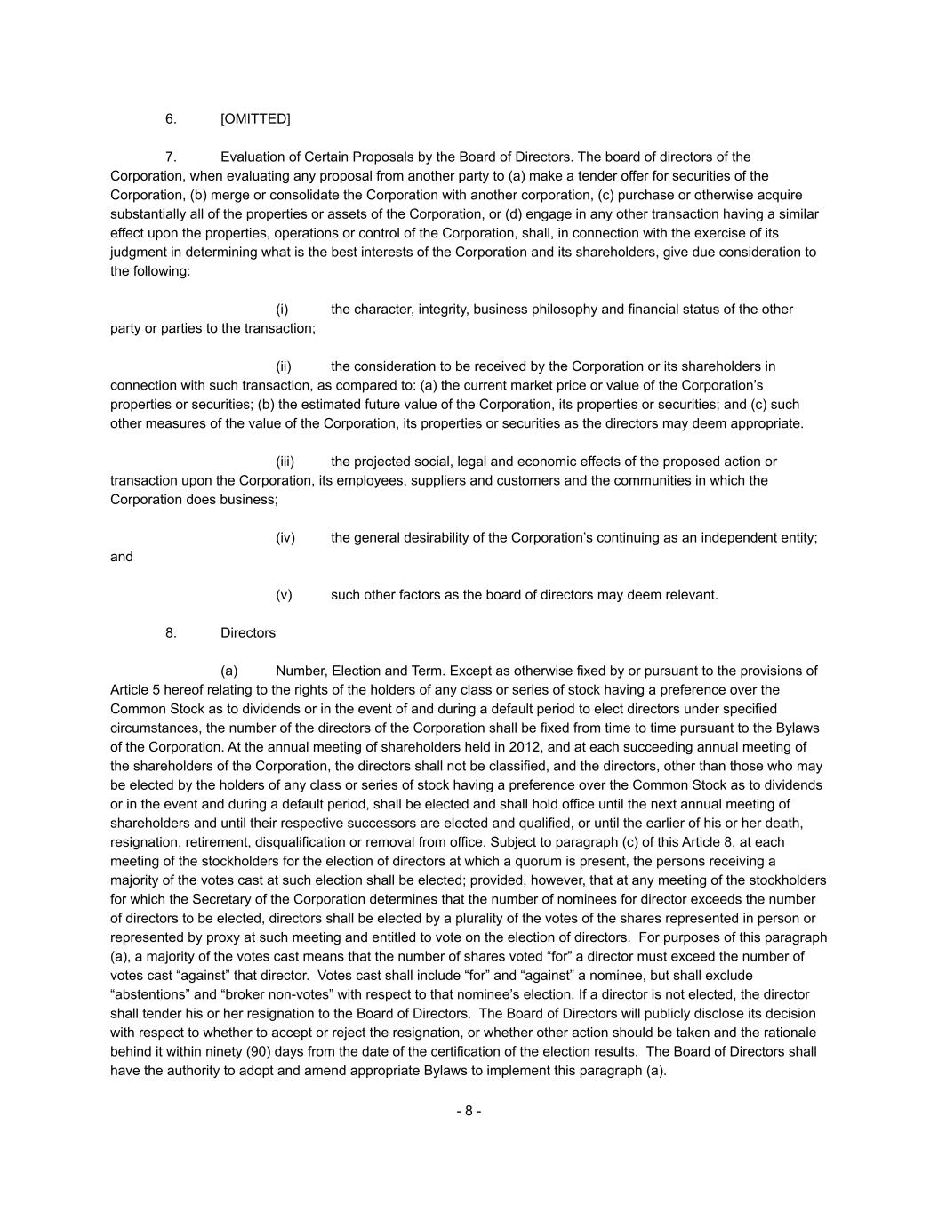 - 8 - 6. [OMITTED] 7. Evaluation of Certain Proposals by the Board of Directors. The board of directors of the Corporation, when evaluating any proposal from another party to (a) make a tender offer for securities of the Corporation, (b) merge or consolidate the Corporation with another corporation, (c) purchase or otherwise acquire substantially all of the properties or assets of the Corporation, or (d) engage in any other transaction having a similar effect upon the properties, operations or control of the Corporation, shall, in connection with the exercise of its judgment in determining what is the best interests of the Corporation and its shareholders, give due consideration to the following: (i) the character, integrity, business philosophy and financial status of the other party or parties to the transaction; (ii) the consideration to be received by the Corporation or its shareholders in connection with such transaction, as compared to: (a) the current market price or value of the Corporation’s properties or securities; (b) the estimated future value of the Corporation, its properties or securities; and (c) such other measures of the value of the Corporation, its properties or securities as the directors may deem appropriate. (iii) the projected social, legal and economic effects of the proposed action or transaction upon the Corporation, its employees, suppliers and customers and the communities in which the Corporation does business; (iv) the general desirability of the Corporation’s continuing as an independent entity; and (v) such other factors as the board of directors may deem relevant. 8. Directors (a) Number, Election and Term. Except as otherwise fixed by or pursuant to the provisions of Article 5 hereof relating to the rights of the holders of any class or series of stock having a preference over the Common Stock as to dividends or in the event of and during a default period to elect directors under specified circumstances, the number of the directors of the Corporation shall be fixed from time to time pursuant to the Bylaws of the Corporation. At the annual meeting of shareholders held in 2012, and at each succeeding annual meeting of the shareholders of the Corporation, the directors shall not be classified, and the directors, other than those who may be elected by the holders of any class or series of stock having a preference over the Common Stock as to dividends or in the event and during a default period, shall be elected and shall hold office until the next annual meeting of shareholders and until their respective successors are elected and qualified, or until the earlier of his or her death, resignation, retirement, disqualification or removal from office. Subject to paragraph (c) of this Article 8, at each meeting of the stockholders for the election of directors at which a quorum is present, the persons receiving a majority of the votes cast at such election shall be elected; provided, however, that at any meeting of the stockholders for which the Secretary of the Corporation determines that the number of nominees for director exceeds the number of directors to be elected, directors shall be elected by a plurality of the votes of the shares represented in person or represented by proxy at such meeting and entitled to vote on the election of directors. For purposes of this paragraph (a), a majority of the votes cast means that the number of shares voted “for” a director must exceed the number of votes cast “against” that director. Votes cast shall include “for” and “against” a nominee, but shall exclude “abstentions” and “broker non-votes” with respect to that nominee’s election. If a director is not elected, the director shall tender his or her resignation to the Board of Directors. The Board of Directors will publicly disclose its decision with respect to whether to accept or reject the resignation, or whether other action should be taken and the rationale behind it within ninety (90) days from the date of the certification of the election results. The Board of Directors shall have the authority to adopt and amend appropriate Bylaws to implement this paragraph (a).