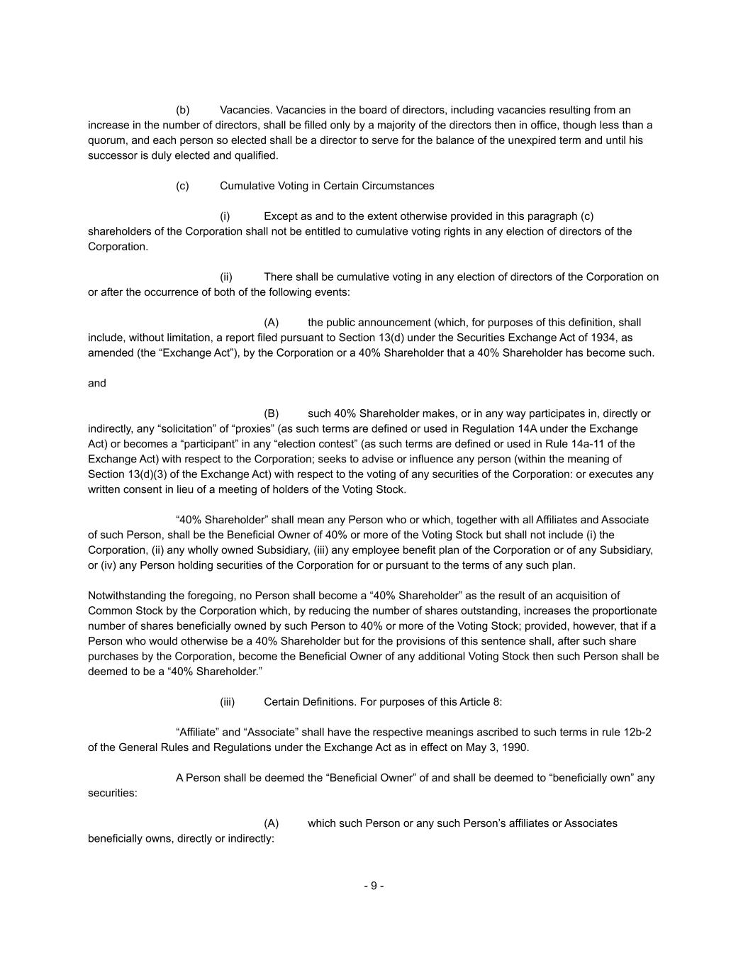 - 9 - (b) Vacancies. Vacancies in the board of directors, including vacancies resulting from an increase in the number of directors, shall be filled only by a majority of the directors then in office, though less than a quorum, and each person so elected shall be a director to serve for the balance of the unexpired term and until his successor is duly elected and qualified. (c) Cumulative Voting in Certain Circumstances (i) Except as and to the extent otherwise provided in this paragraph (c) shareholders of the Corporation shall not be entitled to cumulative voting rights in any election of directors of the Corporation. (ii) There shall be cumulative voting in any election of directors of the Corporation on or after the occurrence of both of the following events: (A) the public announcement (which, for purposes of this definition, shall include, without limitation, a report filed pursuant to Section 13(d) under the Securities Exchange Act of 1934, as amended (the “Exchange Act”), by the Corporation or a 40% Shareholder that a 40% Shareholder has become such. and (B) such 40% Shareholder makes, or in any way participates in, directly or indirectly, any “solicitation” of “proxies” (as such terms are defined or used in Regulation 14A under the Exchange Act) or becomes a “participant” in any “election contest” (as such terms are defined or used in Rule 14a-11 of the Exchange Act) with respect to the Corporation; seeks to advise or influence any person (within the meaning of Section 13(d)(3) of the Exchange Act) with respect to the voting of any securities of the Corporation: or executes any written consent in lieu of a meeting of holders of the Voting Stock. “40% Shareholder” shall mean any Person who or which, together with all Affiliates and Associate of such Person, shall be the Beneficial Owner of 40% or more of the Voting Stock but shall not include (i) the Corporation, (ii) any wholly owned Subsidiary, (iii) any employee benefit plan of the Corporation or of any Subsidiary, or (iv) any Person holding securities of the Corporation for or pursuant to the terms of any such plan. Notwithstanding the foregoing, no Person shall become a “40% Shareholder” as the result of an acquisition of Common Stock by the Corporation which, by reducing the number of shares outstanding, increases the proportionate number of shares beneficially owned by such Person to 40% or more of the Voting Stock; provided, however, that if a Person who would otherwise be a 40% Shareholder but for the provisions of this sentence shall, after such share purchases by the Corporation, become the Beneficial Owner of any additional Voting Stock then such Person shall be deemed to be a “40% Shareholder.” (iii) Certain Definitions. For purposes of this Article 8: “Affiliate” and “Associate” shall have the respective meanings ascribed to such terms in rule 12b-2 of the General Rules and Regulations under the Exchange Act as in effect on May 3, 1990. A Person shall be deemed the “Beneficial Owner” of and shall be deemed to “beneficially own” any securities: (A) which such Person or any such Person’s affiliates or Associates beneficially owns, directly or indirectly:
