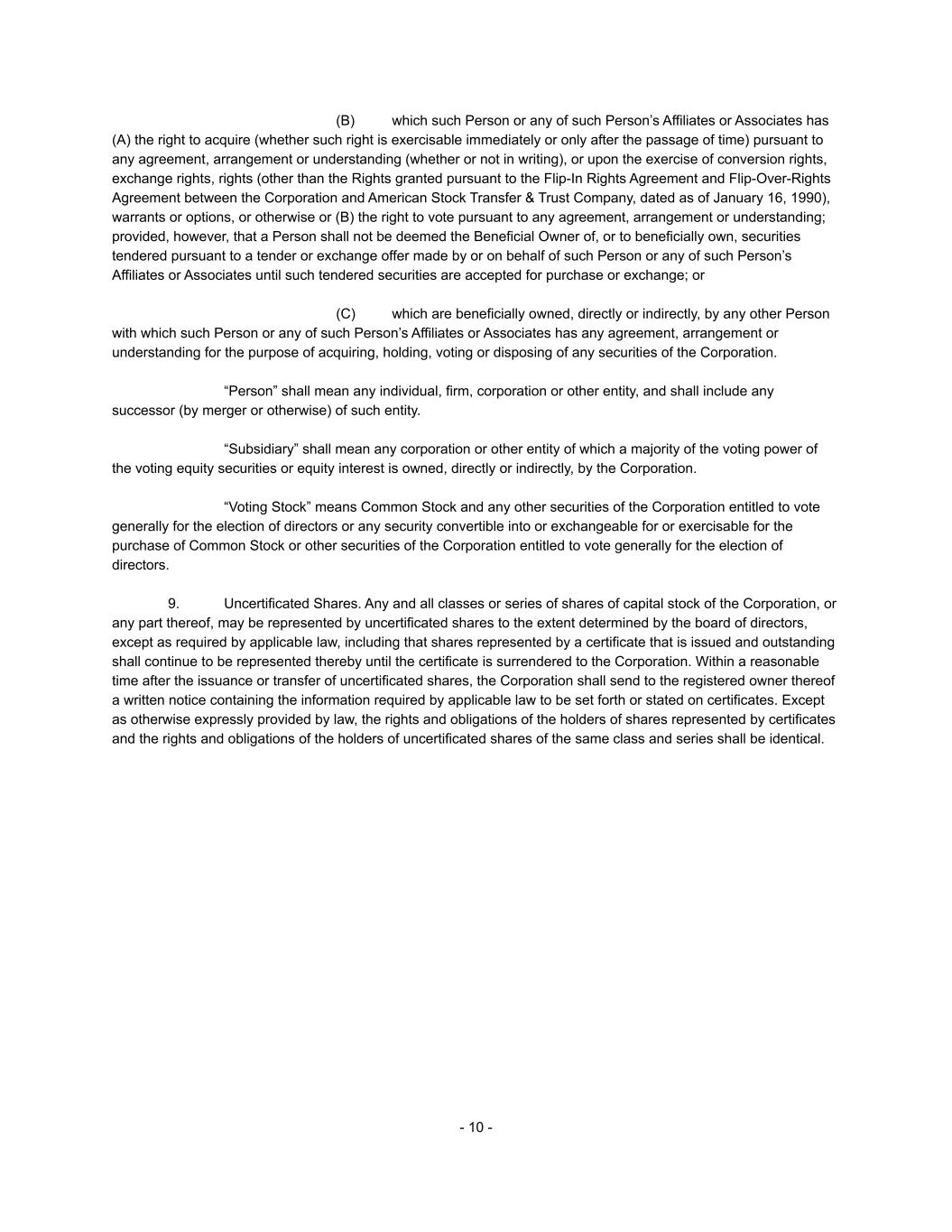 - 10 - (B) which such Person or any of such Person’s Affiliates or Associates has (A) the right to acquire (whether such right is exercisable immediately or only after the passage of time) pursuant to any agreement, arrangement or understanding (whether or not in writing), or upon the exercise of conversion rights, exchange rights, rights (other than the Rights granted pursuant to the Flip-In Rights Agreement and Flip-Over-Rights Agreement between the Corporation and American Stock Transfer & Trust Company, dated as of January 16, 1990), warrants or options, or otherwise or (B) the right to vote pursuant to any agreement, arrangement or understanding; provided, however, that a Person shall not be deemed the Beneficial Owner of, or to beneficially own, securities tendered pursuant to a tender or exchange offer made by or on behalf of such Person or any of such Person’s Affiliates or Associates until such tendered securities are accepted for purchase or exchange; or (C) which are beneficially owned, directly or indirectly, by any other Person with which such Person or any of such Person’s Affiliates or Associates has any agreement, arrangement or understanding for the purpose of acquiring, holding, voting or disposing of any securities of the Corporation. “Person” shall mean any individual, firm, corporation or other entity, and shall include any successor (by merger or otherwise) of such entity. “Subsidiary” shall mean any corporation or other entity of which a majority of the voting power of the voting equity securities or equity interest is owned, directly or indirectly, by the Corporation. “Voting Stock” means Common Stock and any other securities of the Corporation entitled to vote generally for the election of directors or any security convertible into or exchangeable for or exercisable for the purchase of Common Stock or other securities of the Corporation entitled to vote generally for the election of directors. 9. Uncertificated Shares. Any and all classes or series of shares of capital stock of the Corporation, or any part thereof, may be represented by uncertificated shares to the extent determined by the board of directors, except as required by applicable law, including that shares represented by a certificate that is issued and outstanding shall continue to be represented thereby until the certificate is surrendered to the Corporation. Within a reasonable time after the issuance or transfer of uncertificated shares, the Corporation shall send to the registered owner thereof a written notice containing the information required by applicable law to be set forth or stated on certificates. Except as otherwise expressly provided by law, the rights and obligations of the holders of shares represented by certificates and the rights and obligations of the holders of uncertificated shares of the same class and series shall be identical.