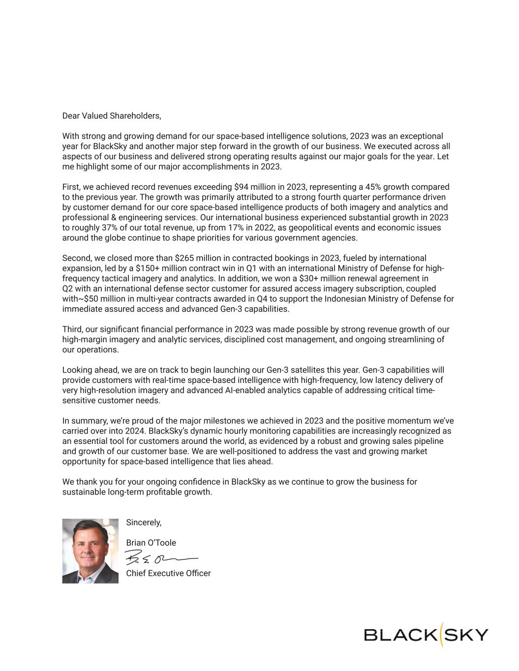 Dear Valued Shareholders, With strong and growing demand for our space-based intelligence solutions, 2023 was an exceptional year for BlackSky and another major step forward in the growth of our business. We executed across all aspects of our business and delivered strong operating results against our major goals for the year. Let me highlight some of our major accomplishments in 2023. First, we achieved record revenues exceeding $94 million in 2023, representing a 45% growth compared to the previous year. The growth was primarily attributed to a strong fourth quarter performance driven by customer demand for our core space-based intelligence products of both imagery and analytics and professional & engineering services. Our international business experienced substantial growth in 2023 to roughly 37% of our total revenue, up from 17% in 2022, as geopolitical events and economic issues around the globe continue to shape priorities for various government agencies. Second, we closed more than $265 million in contracted bookings in 2023, fueled by international expansion, led by a $150+ million contract win in Q1 with an international Ministry of Defense for high- frequency tactical imagery and analytics. In addition, we won a $30+ million renewal agreement in Q2 with an international defense sector customer for assured access imagery subscription, coupled with~$50 million in multi-year contracts awarded in Q4 to support the Indonesian Ministry of Defense for immediate assured access and advanced Gen-3 capabilities. Third, our significant financial performance in 2023 was made possible by strong revenue growth of our high-margin imagery and analytic services, disciplined cost management, and ongoing streamlining of our operations. Looking ahead, we are on track to begin launching our Gen-3 satellites this year. Gen-3 capabilities will provide customers with real-time space-based intelligence with high-frequency, low latency delivery of very high-resolution imagery and advanced AI-enabled analytics capable of addressing critical time- sensitive customer needs. In summary, we’re proud of the major milestones we achieved in 2023 and the positive momentum we’ve carried over into 2024. BlackSky’s dynamic hourly monitoring capabilities are increasingly recognized as an essential tool for customers around the world, as evidenced by a robust and growing sales pipeline and growth of our customer base. We are well-positioned to address the vast and growing market opportunity for space-based intelligence that lies ahead. We thank you for your ongoing confidence in BlackSky as we continue to grow the business for sustainable long-term profitable growth. Sincerely, Brian O’Toole Chief Executive Officer