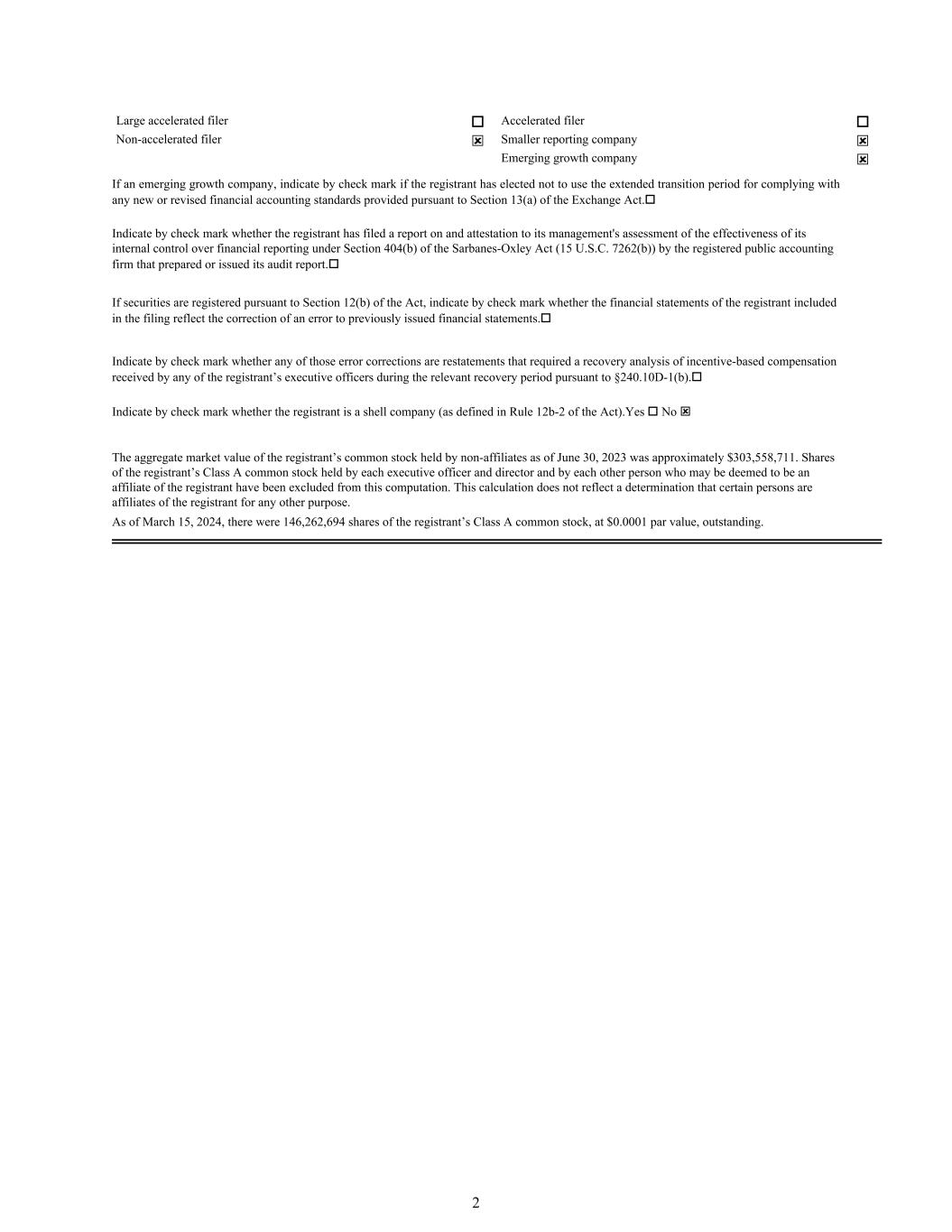 Large accelerated filer o Accelerated filer o Non-accelerated filer ☒ Smaller reporting company ☒ Emerging growth company ☒ If an emerging growth company, indicate by check mark if the registrant has elected not to use the extended transition period for complying with any new or revised financial accounting standards provided pursuant to Section 13(a) of the Exchange Act.o Indicate by check mark whether the registrant has filed a report on and attestation to its management's assessment of the effectiveness of its internal control over financial reporting under Section 404(b) of the Sarbanes-Oxley Act (15 U.S.C. 7262(b)) by the registered public accounting firm that prepared or issued its audit report.o If securities are registered pursuant to Section 12(b) of the Act, indicate by check mark whether the financial statements of the registrant included in the filing reflect the correction of an error to previously issued financial statements.o Indicate by check mark whether any of those error corrections are restatements that required a recovery analysis of incentive-based compensation received by any of the registrant’s executive officers during the relevant recovery period pursuant to §240.10D-1(b).o Indicate by check mark whether the registrant is a shell company (as defined in Rule 12b-2 of the Act).Yes o No ý The aggregate market value of the registrant’s common stock held by non-affiliates as of June 30, 2023 was approximately $303,558,711. Shares of the registrant’s Class A common stock held by each executive officer and director and by each other person who may be deemed to be an affiliate of the registrant have been excluded from this computation. This calculation does not reflect a determination that certain persons are affiliates of the registrant for any other purpose. As of March 15, 2024, there were 146,262,694 shares of the registrant’s Class A common stock, at $0.0001 par value, outstanding. 2