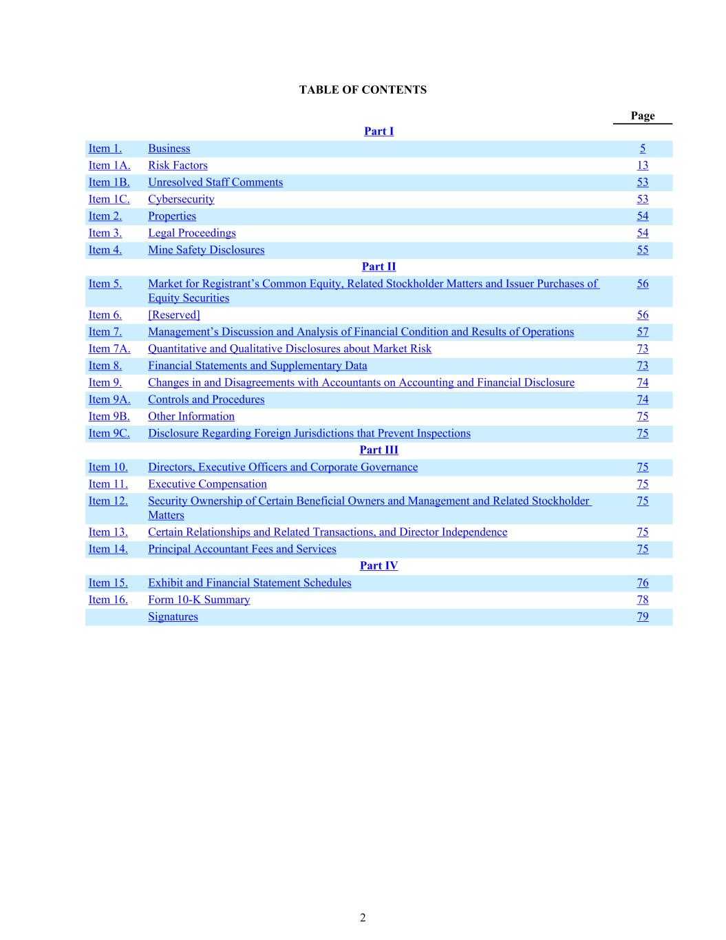 TABLE OF CONTENTS Page Part I Item 1. Business 5 Item 1A. Risk Factors 13 Item 1B. Unresolved Staff Comments 53 Item 1C. Cybersecurity 53 Item 2. Properties 54 Item 3. Legal Proceedings 54 Item 4. Mine Safety Disclosures 55 Part II Item 5. Market for Registrant’s Common Equity, Related Stockholder Matters and Issuer Purchases of Equity Securities 56 Item 6. [Reserved] 56 Item 7. Management’s Discussion and Analysis of Financial Condition and Results of Operations 57 Item 7A. Quantitative and Qualitative Disclosures about Market Risk 73 Item 8. Financial Statements and Supplementary Data 73 Item 9. Changes in and Disagreements with Accountants on Accounting and Financial Disclosure 74 Item 9A. Controls and Procedures 74 Item 9B. Other Information 75 Item 9C. Disclosure Regarding Foreign Jurisdictions that Prevent Inspections 75 Part III Item 10. Directors, Executive Officers and Corporate Governance 75 Item 11. Executive Compensation 75 Item 12. Security Ownership of Certain Beneficial Owners and Management and Related Stockholder Matters 75 Item 13. Certain Relationships and Related Transactions, and Director Independence 75 Item 14. Principal Accountant Fees and Services 75 Part IV Item 15. Exhibit and Financial Statement Schedules 76 Item 16. Form 10-K Summary 78 Signatures 79 2