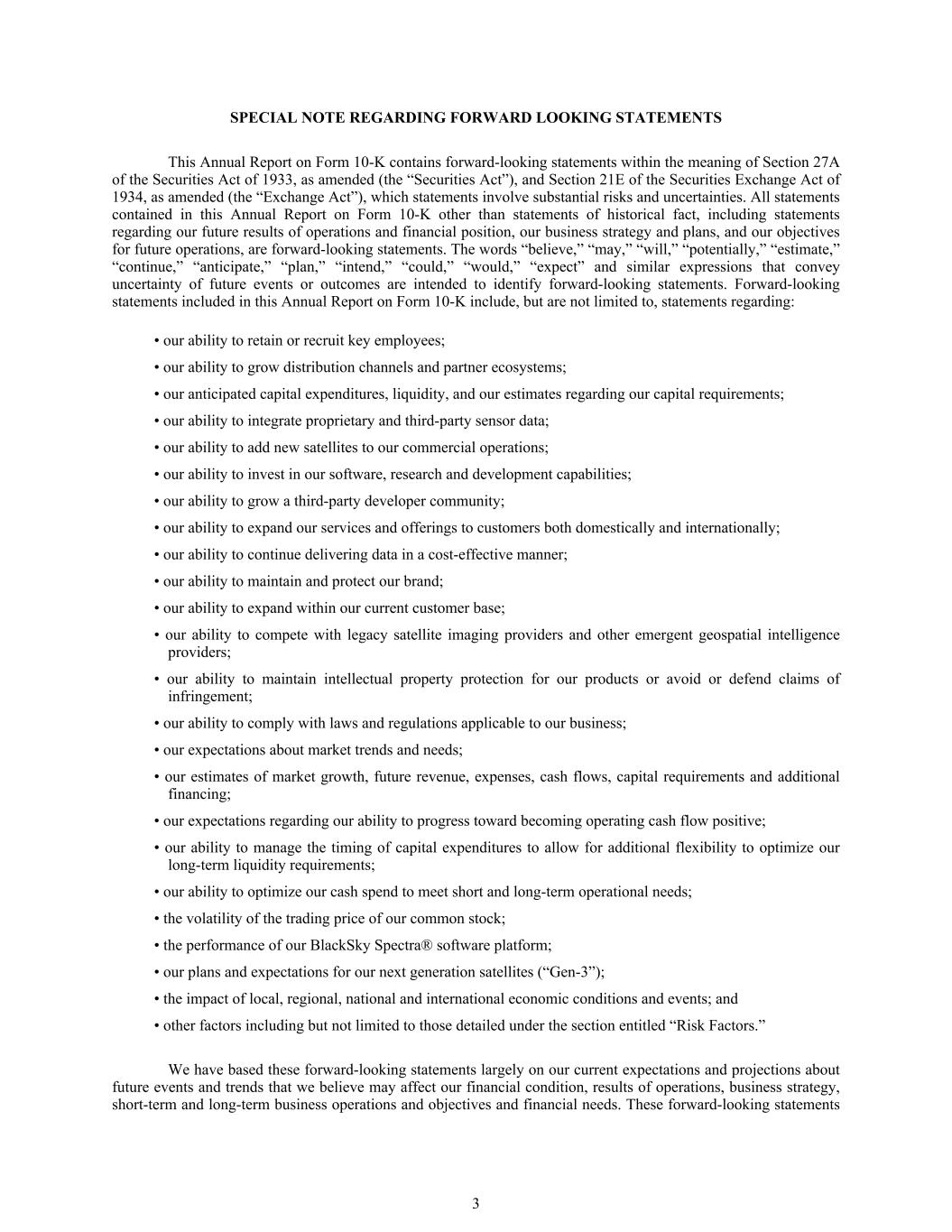 SPECIAL NOTE REGARDING FORWARD LOOKING STATEMENTS This Annual Report on Form 10-K contains forward-looking statements within the meaning of Section 27A of the Securities Act of 1933, as amended (the “Securities Act”), and Section 21E of the Securities Exchange Act of 1934, as amended (the “Exchange Act”), which statements involve substantial risks and uncertainties. All statements contained in this Annual Report on Form 10-K other than statements of historical fact, including statements regarding our future results of operations and financial position, our business strategy and plans, and our objectives for future operations, are forward-looking statements. The words “believe,” “may,” “will,” “potentially,” “estimate,” “continue,” “anticipate,” “plan,” “intend,” “could,” “would,” “expect” and similar expressions that convey uncertainty of future events or outcomes are intended to identify forward-looking statements. Forward-looking statements included in this Annual Report on Form 10-K include, but are not limited to, statements regarding: • our ability to retain or recruit key employees; • our ability to grow distribution channels and partner ecosystems; • our anticipated capital expenditures, liquidity, and our estimates regarding our capital requirements; • our ability to integrate proprietary and third-party sensor data; • our ability to add new satellites to our commercial operations; • our ability to invest in our software, research and development capabilities; • our ability to grow a third-party developer community; • our ability to expand our services and offerings to customers both domestically and internationally; • our ability to continue delivering data in a cost-effective manner; • our ability to maintain and protect our brand; • our ability to expand within our current customer base; • our ability to compete with legacy satellite imaging providers and other emergent geospatial intelligence providers; • our ability to maintain intellectual property protection for our products or avoid or defend claims of infringement; • our ability to comply with laws and regulations applicable to our business; • our expectations about market trends and needs; • our estimates of market growth, future revenue, expenses, cash flows, capital requirements and additional financing; • our expectations regarding our ability to progress toward becoming operating cash flow positive; • our ability to manage the timing of capital expenditures to allow for additional flexibility to optimize our long-term liquidity requirements; • our ability to optimize our cash spend to meet short and long-term operational needs; • the volatility of the trading price of our common stock; • the performance of our BlackSky Spectra® software platform; • our plans and expectations for our next generation satellites (“Gen-3”); • the impact of local, regional, national and international economic conditions and events; and • other factors including but not limited to those detailed under the section entitled “Risk Factors.” We have based these forward-looking statements largely on our current expectations and projections about future events and trends that we believe may affect our financial condition, results of operations, business strategy, short-term and long-term business operations and objectives and financial needs. These forward-looking statements 3