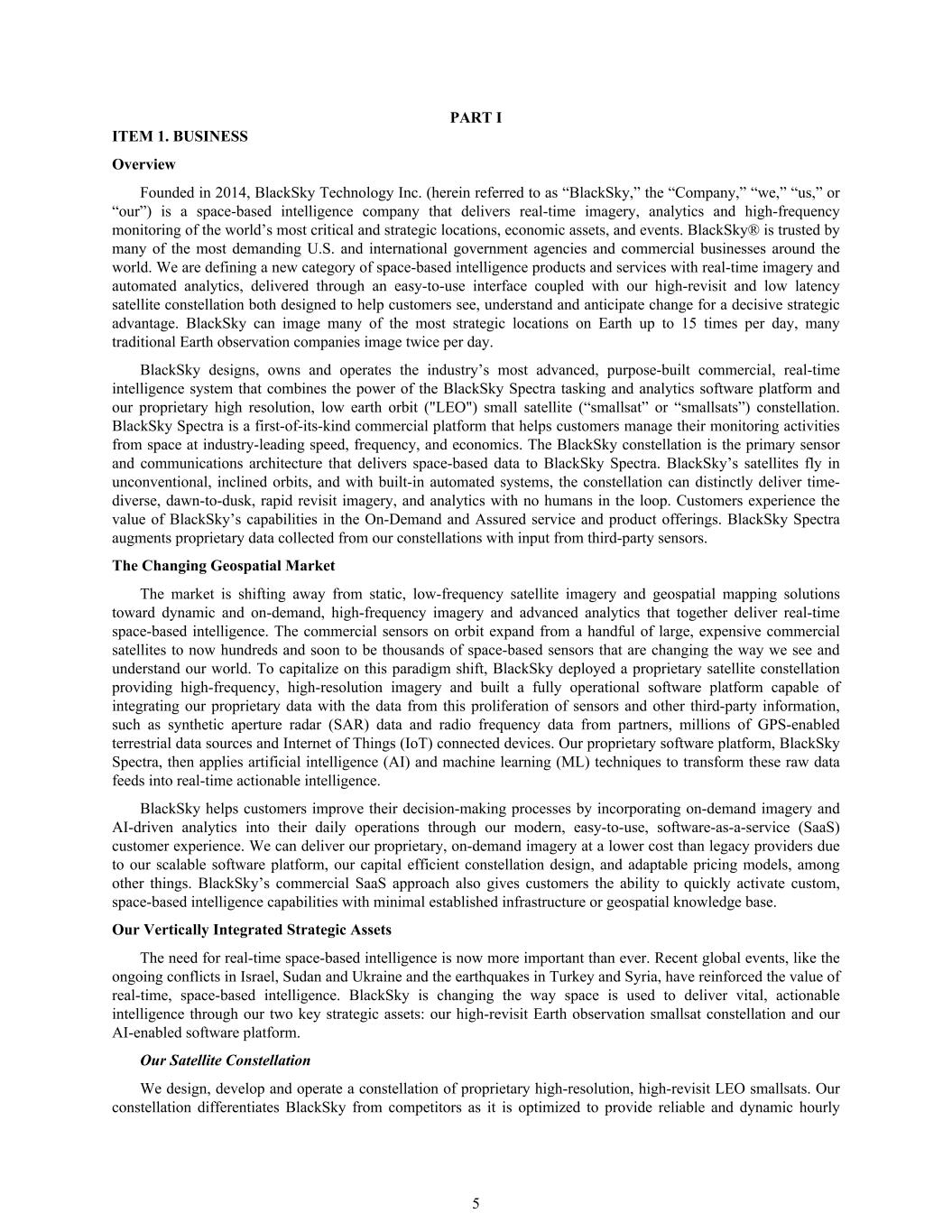 PART I ITEM 1. BUSINESS Overview Founded in 2014, BlackSky Technology Inc. (herein referred to as “BlackSky,” the “Company,” “we,” “us,” or “our”) is a space-based intelligence company that delivers real-time imagery, analytics and high-frequency monitoring of the world’s most critical and strategic locations, economic assets, and events. BlackSky® is trusted by many of the most demanding U.S. and international government agencies and commercial businesses around the world. We are defining a new category of space-based intelligence products and services with real-time imagery and automated analytics, delivered through an easy-to-use interface coupled with our high-revisit and low latency satellite constellation both designed to help customers see, understand and anticipate change for a decisive strategic advantage. BlackSky can image many of the most strategic locations on Earth up to 15 times per day, many traditional Earth observation companies image twice per day. BlackSky designs, owns and operates the industry’s most advanced, purpose-built commercial, real-time intelligence system that combines the power of the BlackSky Spectra tasking and analytics software platform and our proprietary high resolution, low earth orbit ("LEO") small satellite (“smallsat” or “smallsats”) constellation. BlackSky Spectra is a first-of-its-kind commercial platform that helps customers manage their monitoring activities from space at industry-leading speed, frequency, and economics. The BlackSky constellation is the primary sensor and communications architecture that delivers space-based data to BlackSky Spectra. BlackSky’s satellites fly in unconventional, inclined orbits, and with built-in automated systems, the constellation can distinctly deliver time- diverse, dawn-to-dusk, rapid revisit imagery, and analytics with no humans in the loop. Customers experience the value of BlackSky’s capabilities in the On-Demand and Assured service and product offerings. BlackSky Spectra augments proprietary data collected from our constellations with input from third-party sensors. The Changing Geospatial Market The market is shifting away from static, low-frequency satellite imagery and geospatial mapping solutions toward dynamic and on-demand, high-frequency imagery and advanced analytics that together deliver real-time space-based intelligence. The commercial sensors on orbit expand from a handful of large, expensive commercial satellites to now hundreds and soon to be thousands of space-based sensors that are changing the way we see and understand our world. To capitalize on this paradigm shift, BlackSky deployed a proprietary satellite constellation providing high-frequency, high-resolution imagery and built a fully operational software platform capable of integrating our proprietary data with the data from this proliferation of sensors and other third-party information, such as synthetic aperture radar (SAR) data and radio frequency data from partners, millions of GPS-enabled terrestrial data sources and Internet of Things (IoT) connected devices. Our proprietary software platform, BlackSky Spectra, then applies artificial intelligence (AI) and machine learning (ML) techniques to transform these raw data feeds into real-time actionable intelligence. BlackSky helps customers improve their decision-making processes by incorporating on-demand imagery and AI-driven analytics into their daily operations through our modern, easy-to-use, software-as-a-service (SaaS) customer experience. We can deliver our proprietary, on-demand imagery at a lower cost than legacy providers due to our scalable software platform, our capital efficient constellation design, and adaptable pricing models, among other things. BlackSky’s commercial SaaS approach also gives customers the ability to quickly activate custom, space-based intelligence capabilities with minimal established infrastructure or geospatial knowledge base. Our Vertically Integrated Strategic Assets The need for real-time space-based intelligence is now more important than ever. Recent global events, like the ongoing conflicts in Israel, Sudan and Ukraine and the earthquakes in Turkey and Syria, have reinforced the value of real-time, space-based intelligence. BlackSky is changing the way space is used to deliver vital, actionable intelligence through our two key strategic assets: our high-revisit Earth observation smallsat constellation and our AI-enabled software platform. Our Satellite Constellation We design, develop and operate a constellation of proprietary high-resolution, high-revisit LEO smallsats. Our constellation differentiates BlackSky from competitors as it is optimized to provide reliable and dynamic hourly 5