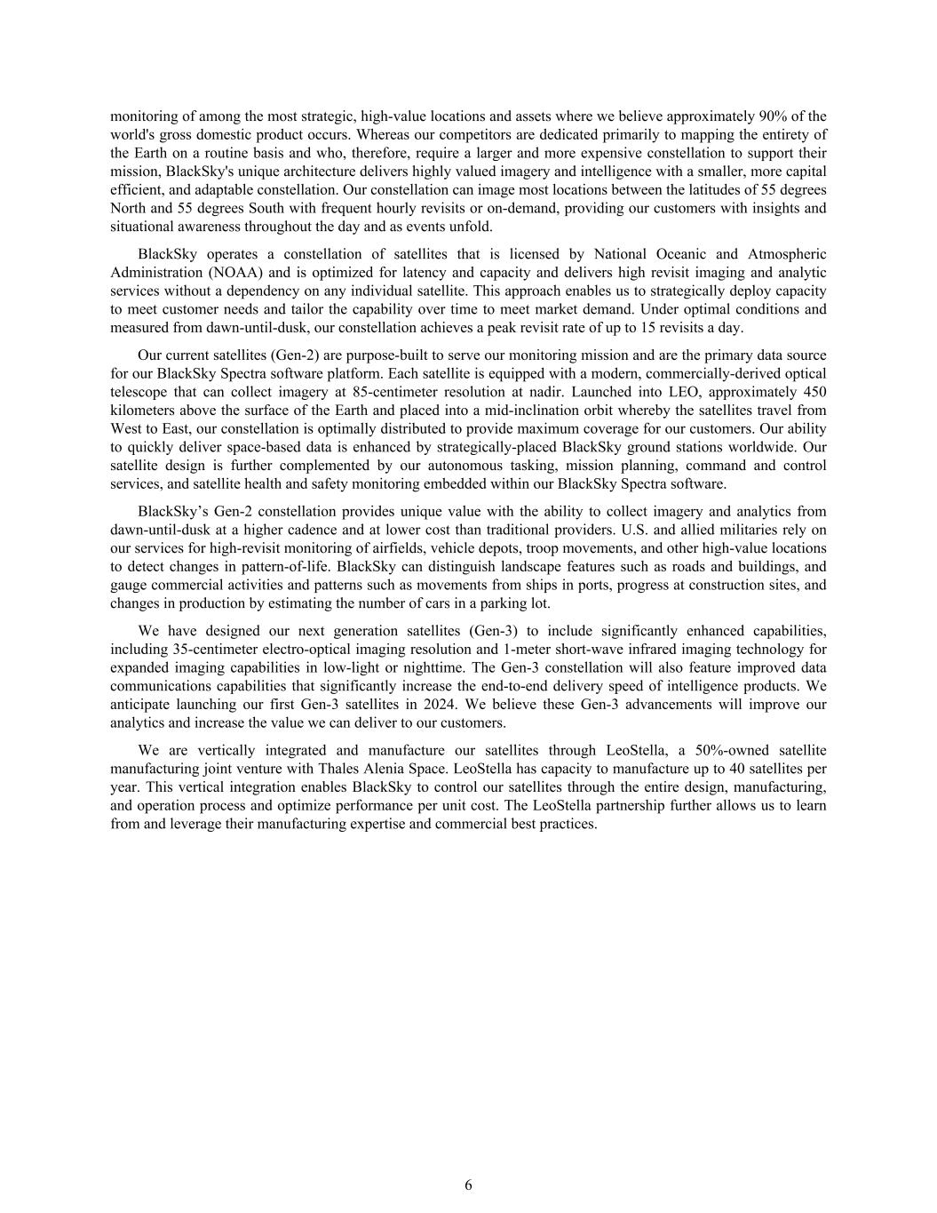 monitoring of among the most strategic, high-value locations and assets where we believe approximately 90% of the world's gross domestic product occurs. Whereas our competitors are dedicated primarily to mapping the entirety of the Earth on a routine basis and who, therefore, require a larger and more expensive constellation to support their mission, BlackSky's unique architecture delivers highly valued imagery and intelligence with a smaller, more capital efficient, and adaptable constellation. Our constellation can image most locations between the latitudes of 55 degrees North and 55 degrees South with frequent hourly revisits or on-demand, providing our customers with insights and situational awareness throughout the day and as events unfold. BlackSky operates a constellation of satellites that is licensed by National Oceanic and Atmospheric Administration (NOAA) and is optimized for latency and capacity and delivers high revisit imaging and analytic services without a dependency on any individual satellite. This approach enables us to strategically deploy capacity to meet customer needs and tailor the capability over time to meet market demand. Under optimal conditions and measured from dawn-until-dusk, our constellation achieves a peak revisit rate of up to 15 revisits a day. Our current satellites (Gen-2) are purpose-built to serve our monitoring mission and are the primary data source for our BlackSky Spectra software platform. Each satellite is equipped with a modern, commercially-derived optical telescope that can collect imagery at 85-centimeter resolution at nadir. Launched into LEO, approximately 450 kilometers above the surface of the Earth and placed into a mid-inclination orbit whereby the satellites travel from West to East, our constellation is optimally distributed to provide maximum coverage for our customers. Our ability to quickly deliver space-based data is enhanced by strategically-placed BlackSky ground stations worldwide. Our satellite design is further complemented by our autonomous tasking, mission planning, command and control services, and satellite health and safety monitoring embedded within our BlackSky Spectra software. BlackSky’s Gen-2 constellation provides unique value with the ability to collect imagery and analytics from dawn-until-dusk at a higher cadence and at lower cost than traditional providers. U.S. and allied militaries rely on our services for high-revisit monitoring of airfields, vehicle depots, troop movements, and other high-value locations to detect changes in pattern-of-life. BlackSky can distinguish landscape features such as roads and buildings, and gauge commercial activities and patterns such as movements from ships in ports, progress at construction sites, and changes in production by estimating the number of cars in a parking lot. We have designed our next generation satellites (Gen-3) to include significantly enhanced capabilities, including 35-centimeter electro-optical imaging resolution and 1-meter short-wave infrared imaging technology for expanded imaging capabilities in low-light or nighttime. The Gen-3 constellation will also feature improved data communications capabilities that significantly increase the end-to-end delivery speed of intelligence products. We anticipate launching our first Gen-3 satellites in 2024. We believe these Gen-3 advancements will improve our analytics and increase the value we can deliver to our customers. We are vertically integrated and manufacture our satellites through LeoStella, a 50%-owned satellite manufacturing joint venture with Thales Alenia Space. LeoStella has capacity to manufacture up to 40 satellites per year. This vertical integration enables BlackSky to control our satellites through the entire design, manufacturing, and operation process and optimize performance per unit cost. The LeoStella partnership further allows us to learn from and leverage their manufacturing expertise and commercial best practices. 6