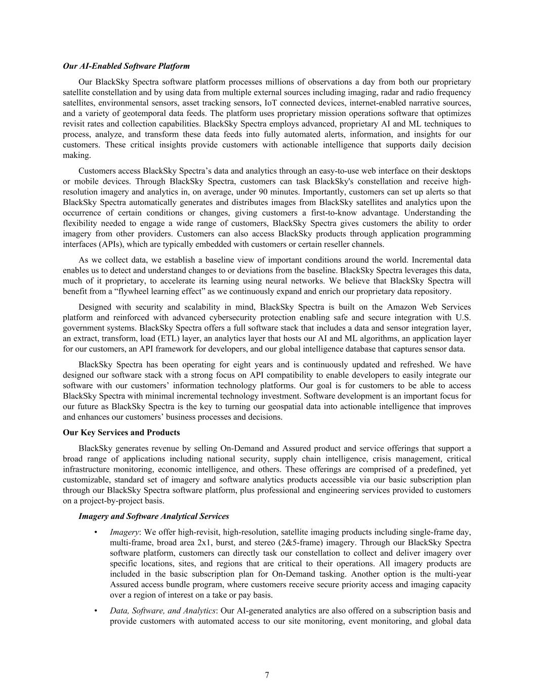 Our AI-Enabled Software Platform Our BlackSky Spectra software platform processes millions of observations a day from both our proprietary satellite constellation and by using data from multiple external sources including imaging, radar and radio frequency satellites, environmental sensors, asset tracking sensors, IoT connected devices, internet-enabled narrative sources, and a variety of geotemporal data feeds. The platform uses proprietary mission operations software that optimizes revisit rates and collection capabilities. BlackSky Spectra employs advanced, proprietary AI and ML techniques to process, analyze, and transform these data feeds into fully automated alerts, information, and insights for our customers. These critical insights provide customers with actionable intelligence that supports daily decision making. Customers access BlackSky Spectra’s data and analytics through an easy-to-use web interface on their desktops or mobile devices. Through BlackSky Spectra, customers can task BlackSky's constellation and receive high- resolution imagery and analytics in, on average, under 90 minutes. Importantly, customers can set up alerts so that BlackSky Spectra automatically generates and distributes images from BlackSky satellites and analytics upon the occurrence of certain conditions or changes, giving customers a first-to-know advantage. Understanding the flexibility needed to engage a wide range of customers, BlackSky Spectra gives customers the ability to order imagery from other providers. Customers can also access BlackSky products through application programming interfaces (APIs), which are typically embedded with customers or certain reseller channels. As we collect data, we establish a baseline view of important conditions around the world. Incremental data enables us to detect and understand changes to or deviations from the baseline. BlackSky Spectra leverages this data, much of it proprietary, to accelerate its learning using neural networks. We believe that BlackSky Spectra will benefit from a “flywheel learning effect” as we continuously expand and enrich our proprietary data repository. Designed with security and scalability in mind, BlackSky Spectra is built on the Amazon Web Services platform and reinforced with advanced cybersecurity protection enabling safe and secure integration with U.S. government systems. BlackSky Spectra offers a full software stack that includes a data and sensor integration layer, an extract, transform, load (ETL) layer, an analytics layer that hosts our AI and ML algorithms, an application layer for our customers, an API framework for developers, and our global intelligence database that captures sensor data. BlackSky Spectra has been operating for eight years and is continuously updated and refreshed. We have designed our software stack with a strong focus on API compatibility to enable developers to easily integrate our software with our customers’ information technology platforms. Our goal is for customers to be able to access BlackSky Spectra with minimal incremental technology investment. Software development is an important focus for our future as BlackSky Spectra is the key to turning our geospatial data into actionable intelligence that improves and enhances our customers’ business processes and decisions. Our Key Services and Products BlackSky generates revenue by selling On-Demand and Assured product and service offerings that support a broad range of applications including national security, supply chain intelligence, crisis management, critical infrastructure monitoring, economic intelligence, and others. These offerings are comprised of a predefined, yet customizable, standard set of imagery and software analytics products accessible via our basic subscription plan through our BlackSky Spectra software platform, plus professional and engineering services provided to customers on a project-by-project basis. Imagery and Software Analytical Services • Imagery: We offer high-revisit, high-resolution, satellite imaging products including single-frame day, multi-frame, broad area 2x1, burst, and stereo (2&5-frame) imagery. Through our BlackSky Spectra software platform, customers can directly task our constellation to collect and deliver imagery over specific locations, sites, and regions that are critical to their operations. All imagery products are included in the basic subscription plan for On-Demand tasking. Another option is the multi-year Assured access bundle program, where customers receive secure priority access and imaging capacity over a region of interest on a take or pay basis. • Data, Software, and Analytics: Our AI-generated analytics are also offered on a subscription basis and provide customers with automated access to our site monitoring, event monitoring, and global data 7