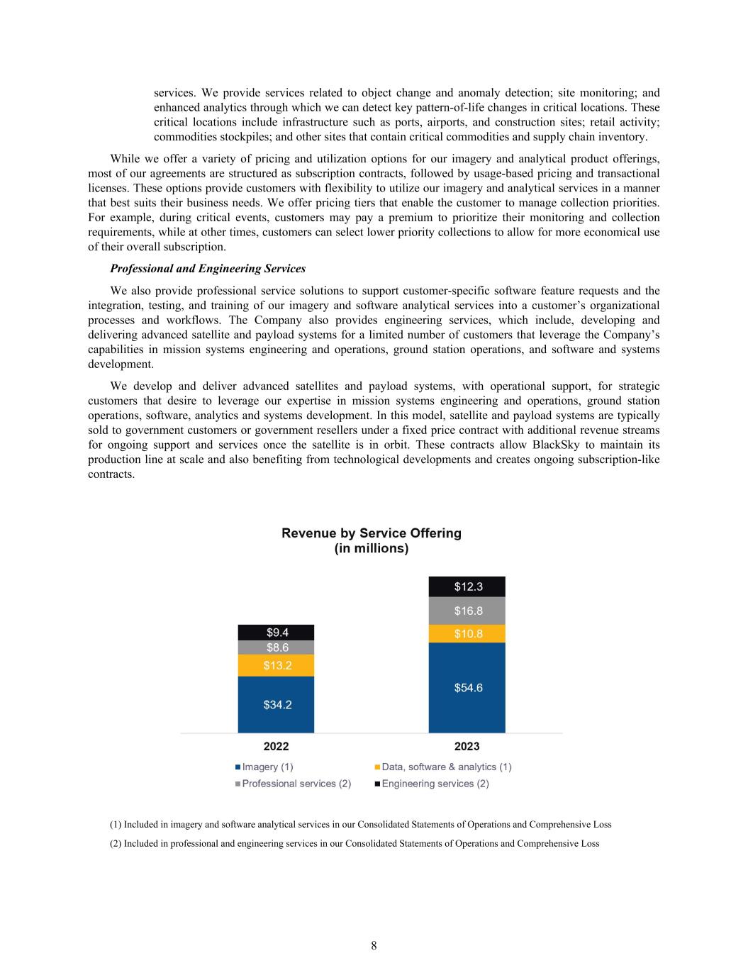 services. We provide services related to object change and anomaly detection; site monitoring; and enhanced analytics through which we can detect key pattern-of-life changes in critical locations. These critical locations include infrastructure such as ports, airports, and construction sites; retail activity; commodities stockpiles; and other sites that contain critical commodities and supply chain inventory. While we offer a variety of pricing and utilization options for our imagery and analytical product offerings, most of our agreements are structured as subscription contracts, followed by usage-based pricing and transactional licenses. These options provide customers with flexibility to utilize our imagery and analytical services in a manner that best suits their business needs. We offer pricing tiers that enable the customer to manage collection priorities. For example, during critical events, customers may pay a premium to prioritize their monitoring and collection requirements, while at other times, customers can select lower priority collections to allow for more economical use of their overall subscription. Professional and Engineering Services We also provide professional service solutions to support customer-specific software feature requests and the integration, testing, and training of our imagery and software analytical services into a customer’s organizational processes and workflows. The Company also provides engineering services, which include, developing and delivering advanced satellite and payload systems for a limited number of customers that leverage the Company’s capabilities in mission systems engineering and operations, ground station operations, and software and systems development. We develop and deliver advanced satellites and payload systems, with operational support, for strategic customers that desire to leverage our expertise in mission systems engineering and operations, ground station operations, software, analytics and systems development. In this model, satellite and payload systems are typically sold to government customers or government resellers under a fixed price contract with additional revenue streams for ongoing support and services once the satellite is in orbit. These contracts allow BlackSky to maintain its production line at scale and also benefiting from technological developments and creates ongoing subscription-like contracts. (1) Included in imagery and software analytical services in our Consolidated Statements of Operations and Comprehensive Loss (2) Included in professional and engineering services in our Consolidated Statements of Operations and Comprehensive Loss 8