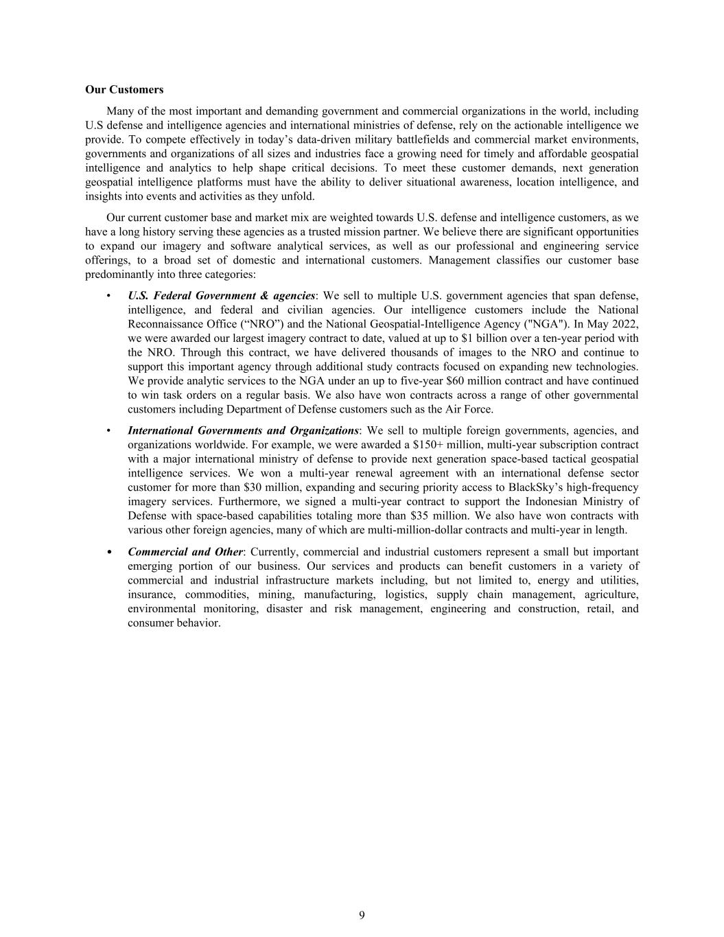 Our Customers Many of the most important and demanding government and commercial organizations in the world, including U.S defense and intelligence agencies and international ministries of defense, rely on the actionable intelligence we provide. To compete effectively in today’s data-driven military battlefields and commercial market environments, governments and organizations of all sizes and industries face a growing need for timely and affordable geospatial intelligence and analytics to help shape critical decisions. To meet these customer demands, next generation geospatial intelligence platforms must have the ability to deliver situational awareness, location intelligence, and insights into events and activities as they unfold. Our current customer base and market mix are weighted towards U.S. defense and intelligence customers, as we have a long history serving these agencies as a trusted mission partner. We believe there are significant opportunities to expand our imagery and software analytical services, as well as our professional and engineering service offerings, to a broad set of domestic and international customers. Management classifies our customer base predominantly into three categories: • U.S. Federal Government & agencies: We sell to multiple U.S. government agencies that span defense, intelligence, and federal and civilian agencies. Our intelligence customers include the National Reconnaissance Office (“NRO”) and the National Geospatial-Intelligence Agency ("NGA"). In May 2022, we were awarded our largest imagery contract to date, valued at up to $1 billion over a ten-year period with the NRO. Through this contract, we have delivered thousands of images to the NRO and continue to support this important agency through additional study contracts focused on expanding new technologies. We provide analytic services to the NGA under an up to five-year $60 million contract and have continued to win task orders on a regular basis. We also have won contracts across a range of other governmental customers including Department of Defense customers such as the Air Force. • International Governments and Organizations: We sell to multiple foreign governments, agencies, and organizations worldwide. For example, we were awarded a $150+ million, multi-year subscription contract with a major international ministry of defense to provide next generation space-based tactical geospatial intelligence services. We won a multi-year renewal agreement with an international defense sector customer for more than $30 million, expanding and securing priority access to BlackSky’s high-frequency imagery services. Furthermore, we signed a multi-year contract to support the Indonesian Ministry of Defense with space-based capabilities totaling more than $35 million. We also have won contracts with various other foreign agencies, many of which are multi-million-dollar contracts and multi-year in length. • Commercial and Other: Currently, commercial and industrial customers represent a small but important emerging portion of our business. Our services and products can benefit customers in a variety of commercial and industrial infrastructure markets including, but not limited to, energy and utilities, insurance, commodities, mining, manufacturing, logistics, supply chain management, agriculture, environmental monitoring, disaster and risk management, engineering and construction, retail, and consumer behavior. 9
