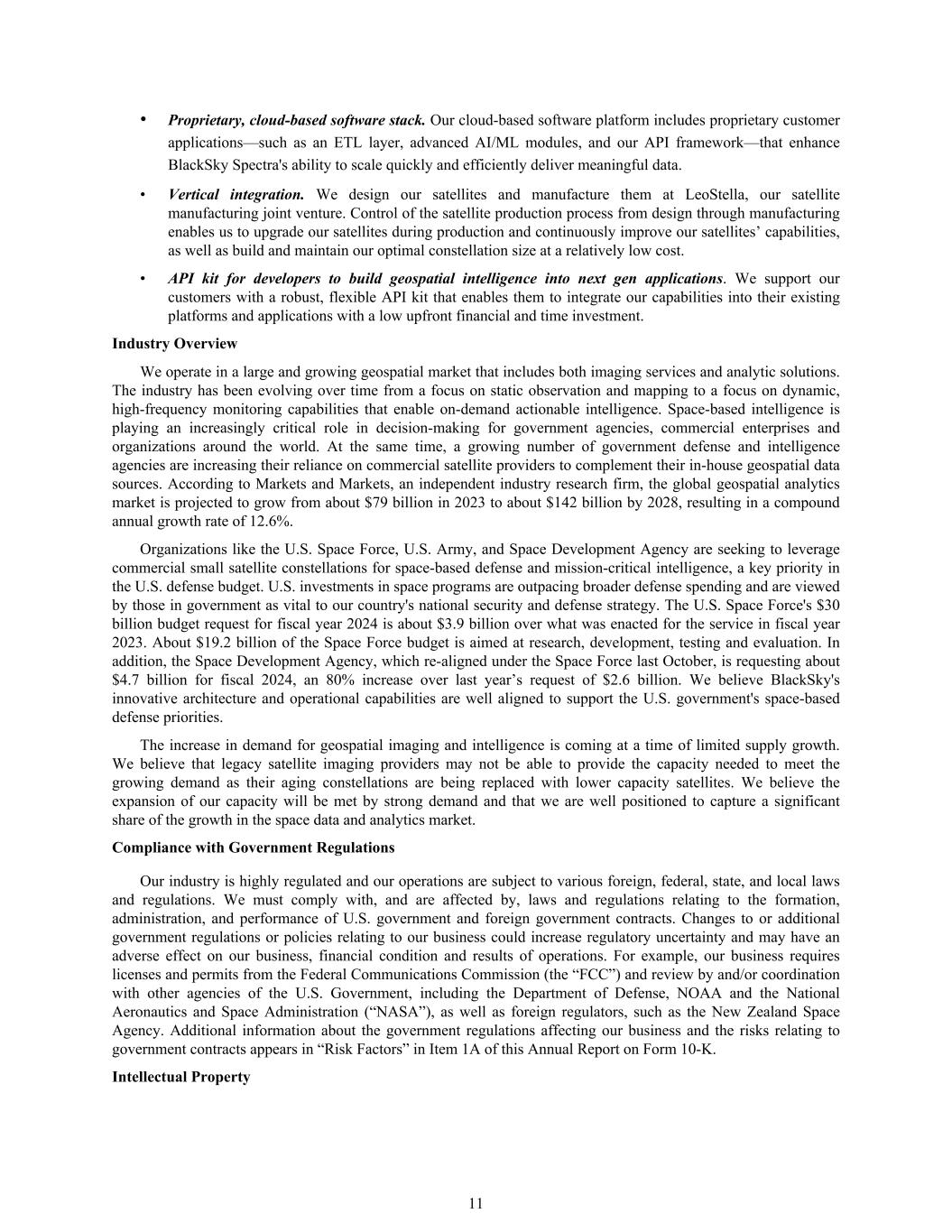 • Proprietary, cloud-based software stack. Our cloud-based software platform includes proprietary customer applications—such as an ETL layer, advanced AI/ML modules, and our API framework—that enhance BlackSky Spectra's ability to scale quickly and efficiently deliver meaningful data. • Vertical integration. We design our satellites and manufacture them at LeoStella, our satellite manufacturing joint venture. Control of the satellite production process from design through manufacturing enables us to upgrade our satellites during production and continuously improve our satellites’ capabilities, as well as build and maintain our optimal constellation size at a relatively low cost. • API kit for developers to build geospatial intelligence into next gen applications. We support our customers with a robust, flexible API kit that enables them to integrate our capabilities into their existing platforms and applications with a low upfront financial and time investment. Industry Overview We operate in a large and growing geospatial market that includes both imaging services and analytic solutions. The industry has been evolving over time from a focus on static observation and mapping to a focus on dynamic, high-frequency monitoring capabilities that enable on-demand actionable intelligence. Space-based intelligence is playing an increasingly critical role in decision-making for government agencies, commercial enterprises and organizations around the world. At the same time, a growing number of government defense and intelligence agencies are increasing their reliance on commercial satellite providers to complement their in-house geospatial data sources. According to Markets and Markets, an independent industry research firm, the global geospatial analytics market is projected to grow from about $79 billion in 2023 to about $142 billion by 2028, resulting in a compound annual growth rate of 12.6%. Organizations like the U.S. Space Force, U.S. Army, and Space Development Agency are seeking to leverage commercial small satellite constellations for space-based defense and mission-critical intelligence, a key priority in the U.S. defense budget. U.S. investments in space programs are outpacing broader defense spending and are viewed by those in government as vital to our country's national security and defense strategy. The U.S. Space Force's $30 billion budget request for fiscal year 2024 is about $3.9 billion over what was enacted for the service in fiscal year 2023. About $19.2 billion of the Space Force budget is aimed at research, development, testing and evaluation. In addition, the Space Development Agency, which re-aligned under the Space Force last October, is requesting about $4.7 billion for fiscal 2024, an 80% increase over last year’s request of $2.6 billion. We believe BlackSky's innovative architecture and operational capabilities are well aligned to support the U.S. government's space-based defense priorities. The increase in demand for geospatial imaging and intelligence is coming at a time of limited supply growth. We believe that legacy satellite imaging providers may not be able to provide the capacity needed to meet the growing demand as their aging constellations are being replaced with lower capacity satellites. We believe the expansion of our capacity will be met by strong demand and that we are well positioned to capture a significant share of the growth in the space data and analytics market. Compliance with Government Regulations Our industry is highly regulated and our operations are subject to various foreign, federal, state, and local laws and regulations. We must comply with, and are affected by, laws and regulations relating to the formation, administration, and performance of U.S. government and foreign government contracts. Changes to or additional government regulations or policies relating to our business could increase regulatory uncertainty and may have an adverse effect on our business, financial condition and results of operations. For example, our business requires licenses and permits from the Federal Communications Commission (the “FCC”) and review by and/or coordination with other agencies of the U.S. Government, including the Department of Defense, NOAA and the National Aeronautics and Space Administration (“NASA”), as well as foreign regulators, such as the New Zealand Space Agency. Additional information about the government regulations affecting our business and the risks relating to government contracts appears in “Risk Factors” in Item 1A of this Annual Report on Form 10-K. Intellectual Property 11