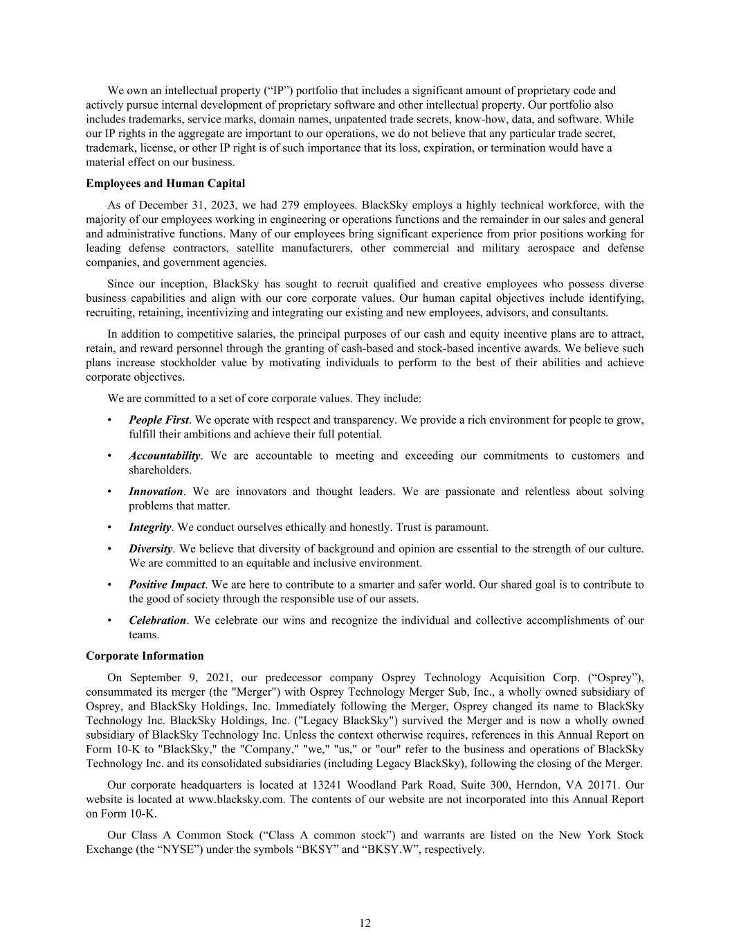 We own an intellectual property (“IP”) portfolio that includes a significant amount of proprietary code and actively pursue internal development of proprietary software and other intellectual property. Our portfolio also includes trademarks, service marks, domain names, unpatented trade secrets, know-how, data, and software. While our IP rights in the aggregate are important to our operations, we do not believe that any particular trade secret, trademark, license, or other IP right is of such importance that its loss, expiration, or termination would have a material effect on our business. Employees and Human Capital As of December 31, 2023, we had 279 employees. BlackSky employs a highly technical workforce, with the majority of our employees working in engineering or operations functions and the remainder in our sales and general and administrative functions. Many of our employees bring significant experience from prior positions working for leading defense contractors, satellite manufacturers, other commercial and military aerospace and defense companies, and government agencies. Since our inception, BlackSky has sought to recruit qualified and creative employees who possess diverse business capabilities and align with our core corporate values. Our human capital objectives include identifying, recruiting, retaining, incentivizing and integrating our existing and new employees, advisors, and consultants. In addition to competitive salaries, the principal purposes of our cash and equity incentive plans are to attract, retain, and reward personnel through the granting of cash-based and stock-based incentive awards. We believe such plans increase stockholder value by motivating individuals to perform to the best of their abilities and achieve corporate objectives. We are committed to a set of core corporate values. They include: • People First. We operate with respect and transparency. We provide a rich environment for people to grow, fulfill their ambitions and achieve their full potential. • Accountability. We are accountable to meeting and exceeding our commitments to customers and shareholders. • Innovation. We are innovators and thought leaders. We are passionate and relentless about solving problems that matter. • Integrity. We conduct ourselves ethically and honestly. Trust is paramount. • Diversity. We believe that diversity of background and opinion are essential to the strength of our culture. We are committed to an equitable and inclusive environment. • Positive Impact. We are here to contribute to a smarter and safer world. Our shared goal is to contribute to the good of society through the responsible use of our assets. • Celebration. We celebrate our wins and recognize the individual and collective accomplishments of our teams. Corporate Information On September 9, 2021, our predecessor company Osprey Technology Acquisition Corp. (“Osprey”), consummated its merger (the "Merger") with Osprey Technology Merger Sub, Inc., a wholly owned subsidiary of Osprey, and BlackSky Holdings, Inc. Immediately following the Merger, Osprey changed its name to BlackSky Technology Inc. BlackSky Holdings, Inc. ("Legacy BlackSky") survived the Merger and is now a wholly owned subsidiary of BlackSky Technology Inc. Unless the context otherwise requires, references in this Annual Report on Form 10-K to "BlackSky," the "Company," "we," "us," or "our" refer to the business and operations of BlackSky Technology Inc. and its consolidated subsidiaries (including Legacy BlackSky), following the closing of the Merger. Our corporate headquarters is located at 13241 Woodland Park Road, Suite 300, Herndon, VA 20171. Our website is located at www.blacksky.com. The contents of our website are not incorporated into this Annual Report on Form 10-K. Our Class A Common Stock (“Class A common stock”) and warrants are listed on the New York Stock Exchange (the “NYSE”) under the symbols “BKSY” and “BKSY.W”, respectively. 12