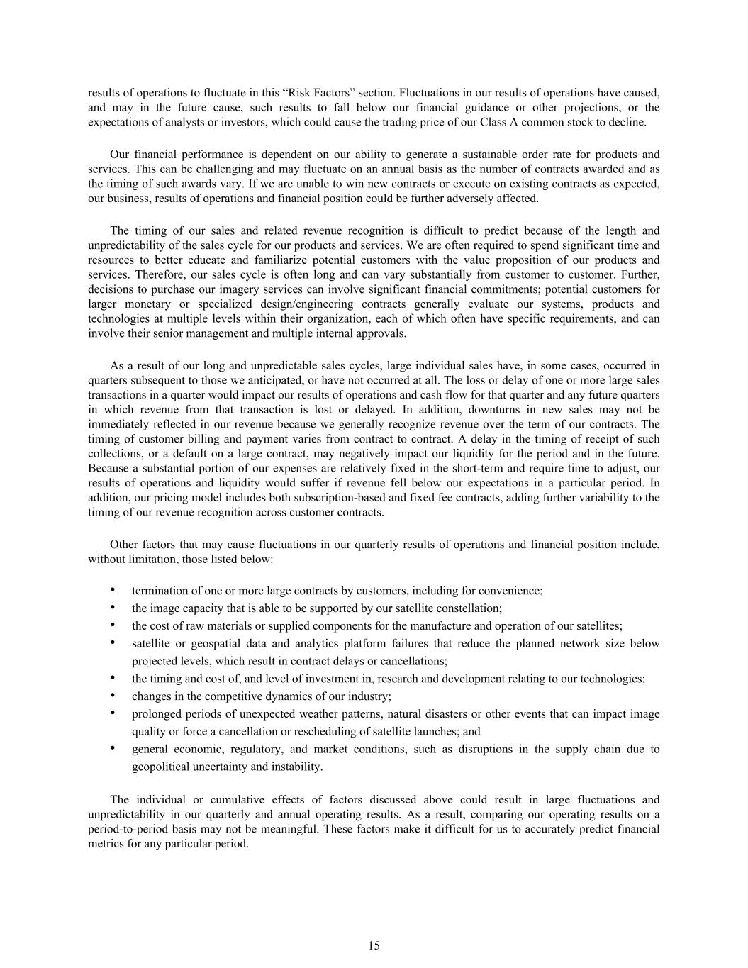 results of operations to fluctuate in this “Risk Factors” section. Fluctuations in our results of operations have caused, and may in the future cause, such results to fall below our financial guidance or other projections, or the expectations of analysts or investors, which could cause the trading price of our Class A common stock to decline. Our financial performance is dependent on our ability to generate a sustainable order rate for products and services. This can be challenging and may fluctuate on an annual basis as the number of contracts awarded and as the timing of such awards vary. If we are unable to win new contracts or execute on existing contracts as expected, our business, results of operations and financial position could be further adversely affected. The timing of our sales and related revenue recognition is difficult to predict because of the length and unpredictability of the sales cycle for our products and services. We are often required to spend significant time and resources to better educate and familiarize potential customers with the value proposition of our products and services. Therefore, our sales cycle is often long and can vary substantially from customer to customer. Further, decisions to purchase our imagery services can involve significant financial commitments; potential customers for larger monetary or specialized design/engineering contracts generally evaluate our systems, products and technologies at multiple levels within their organization, each of which often have specific requirements, and can involve their senior management and multiple internal approvals. As a result of our long and unpredictable sales cycles, large individual sales have, in some cases, occurred in quarters subsequent to those we anticipated, or have not occurred at all. The loss or delay of one or more large sales transactions in a quarter would impact our results of operations and cash flow for that quarter and any future quarters in which revenue from that transaction is lost or delayed. In addition, downturns in new sales may not be immediately reflected in our revenue because we generally recognize revenue over the term of our contracts. The timing of customer billing and payment varies from contract to contract. A delay in the timing of receipt of such collections, or a default on a large contract, may negatively impact our liquidity for the period and in the future. Because a substantial portion of our expenses are relatively fixed in the short-term and require time to adjust, our results of operations and liquidity would suffer if revenue fell below our expectations in a particular period. In addition, our pricing model includes both subscription-based and fixed fee contracts, adding further variability to the timing of our revenue recognition across customer contracts. Other factors that may cause fluctuations in our quarterly results of operations and financial position include, without limitation, those listed below: • termination of one or more large contracts by customers, including for convenience; • the image capacity that is able to be supported by our satellite constellation; • the cost of raw materials or supplied components for the manufacture and operation of our satellites; • satellite or geospatial data and analytics platform failures that reduce the planned network size below projected levels, which result in contract delays or cancellations; • the timing and cost of, and level of investment in, research and development relating to our technologies; • changes in the competitive dynamics of our industry; • prolonged periods of unexpected weather patterns, natural disasters or other events that can impact image quality or force a cancellation or rescheduling of satellite launches; and • general economic, regulatory, and market conditions, such as disruptions in the supply chain due to geopolitical uncertainty and instability. The individual or cumulative effects of factors discussed above could result in large fluctuations and unpredictability in our quarterly and annual operating results. As a result, comparing our operating results on a period-to-period basis may not be meaningful. These factors make it difficult for us to accurately predict financial metrics for any particular period. 15