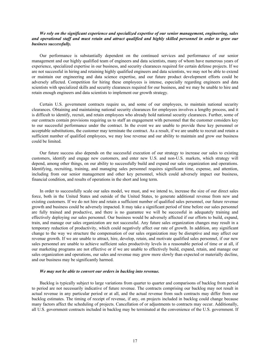 We rely on the significant experience and specialized expertise of our senior management, engineering, sales and operational staff and must retain and attract qualified and highly skilled personnel in order to grow our business successfully. Our performance is substantially dependent on the continued services and performance of our senior management and our highly qualified team of engineers and data scientists, many of whom have numerous years of experience, specialized expertise in our business, and security clearances required for certain defense projects. If we are not successful in hiring and retaining highly qualified engineers and data scientists, we may not be able to extend or maintain our engineering and data science expertise, and our future product development efforts could be adversely affected. Competition for hiring these employees is intense, especially regarding engineers and data scientists with specialized skills and security clearances required for our business, and we may be unable to hire and retain enough engineers and data scientists to implement our growth strategy. Certain U.S. government contracts require us, and some of our employees, to maintain national security clearances. Obtaining and maintaining national security clearances for employees involves a lengthy process, and it is difficult to identify, recruit, and retain employees who already hold national security clearances. Further, some of our contracts contain provisions requiring us to staff an engagement with personnel that the customer considers key to our successful performance under the contract. In the event we are unable to provide these key personnel or acceptable substitutions, the customer may terminate the contract. As a result, if we are unable to recruit and retain a sufficient number of qualified employees, we may lose revenue and our ability to maintain and grow our business could be limited. Our future success also depends on the successful execution of our strategy to increase our sales to existing customers, identify and engage new customers, and enter new U.S. and non-U.S. markets, which strategy will depend, among other things, on our ability to successfully build and expand our sales organization and operations. Identifying, recruiting, training, and managing sales personnel requires significant time, expense, and attention, including from our senior management and other key personnel, which could adversely impact our business, financial condition, and results of operations in the short and long term. In order to successfully scale our sales model, we must, and we intend to, increase the size of our direct sales force, both in the United States and outside of the United States, to generate additional revenue from new and existing customers. If we do not hire and retain a sufficient number of qualified sales personnel, our future revenue growth and business could be adversely impacted. It may take a significant period of time before our sales personnel are fully trained and productive, and there is no guarantee we will be successful in adequately training and effectively deploying our sales personnel. Our business would be adversely affected if our efforts to build, expand, train, and manage our sales organization are not successful. Any future sales organization changes may result in a temporary reduction of productivity, which could negatively affect our rate of growth. In addition, any significant change to the way we structure the compensation of our sales organization may be disruptive and may affect our revenue growth. If we are unable to attract, hire, develop, retain, and motivate qualified sales personnel, if our new sales personnel are unable to achieve sufficient sales productivity levels in a reasonable period of time or at all, if our marketing programs are not effective or if we are unable to effectively build, expand, retain, and manage our sales organization and operations, our sales and revenue may grow more slowly than expected or materially decline, and our business may be significantly harmed. We may not be able to convert our orders in backlog into revenue. Backlog is typically subject to large variations from quarter to quarter and comparisons of backlog from period to period are not necessarily indicative of future revenue. The contracts comprising our backlog may not result in actual revenue in any particular period or at all, and the actual revenue from such contracts may differ from our backlog estimates. The timing of receipt of revenue, if any, on projects included in backlog could change because many factors affect the scheduling of projects. Cancellation of or adjustments to contracts may occur. Additionally, all U.S. government contracts included in backlog may be terminated at the convenience of the U.S. government. If 17