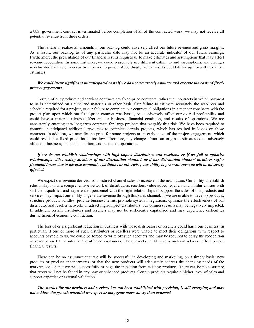 a U.S. government contract is terminated before completion of all of the contracted work, we may not receive all potential revenue from these orders. The failure to realize all amounts in our backlog could adversely affect our future revenue and gross margins. As a result, our backlog as of any particular date may not be an accurate indicator of our future earnings. Furthermore, the presentation of our financial results requires us to make estimates and assumptions that may affect revenue recognition. In some instances, we could reasonably use different estimates and assumptions, and changes in estimates are likely to occur from period to period. Accordingly, actual results could differ significantly from our estimates. We could incur significant unanticipated costs if we do not accurately estimate and execute the costs of fixed- price engagements. Certain of our products and services contracts are fixed-price contracts, rather than contracts in which payment to us is determined on a time and materials or other basis. Our failure to estimate accurately the resources and schedule required for a project, or our failure to complete our contractual obligations in a manner consistent with the project plan upon which our fixed-price contract was based, could adversely affect our overall profitability and could have a material adverse effect on our business, financial condition, and results of operations. We are consistently entering into long-term contracts for large projects that magnify this risk. We have been required to commit unanticipated additional resources to complete certain projects, which has resulted in losses on those contracts. In addition, we may fix the price for some projects at an early stage of the project engagement, which could result in a fixed price that is too low. Therefore, any changes from our original estimates could adversely affect our business, financial condition, and results of operations. If we do not establish relationships with high-impact distributors and resellers, or if we fail to optimize relationships with existing members of our distribution channel, or if our distribution channel members suffer financial losses due to adverse economic conditions or otherwise, our ability to generate revenue will be adversely affected. We expect our revenue derived from indirect channel sales to increase in the near future. Our ability to establish relationships with a comprehensive network of distributors, resellers, value-added resellers and similar entities with sufficient qualified and experienced personnel with the right relationships to support the sales of our products and services may impact our ability to generate revenue through this sales channel. If we are unable to develop products, structure products bundles, provide business terms, promote system integrations, optimize the effectiveness of our distributor and reseller network, or attract high-impact distributors, our business results may be negatively impacted. In addition, certain distributors and resellers may not be sufficiently capitalized and may experience difficulties during times of economic contraction. The loss of or a significant reduction in business with those distributors or resellers could harm our business. In particular, if one or more of such distributors or resellers were unable to meet their obligations with respect to accounts payable to us, we could be forced to write off such accounts and may be required to delay the recognition of revenue on future sales to the affected customers. These events could have a material adverse effect on our financial results. There can be no assurance that we will be successful in developing and marketing, on a timely basis, new products or product enhancements, or that the new products will adequately address the changing needs of the marketplace, or that we will successfully manage the transition from existing products. There can be no assurance that errors will not be found in any new or enhanced products. Certain products require a higher level of sales and support expertise or external validation. The market for our products and services has not been established with precision, is still emerging and may not achieve the growth potential we expect or may grow more slowly than expected. 18