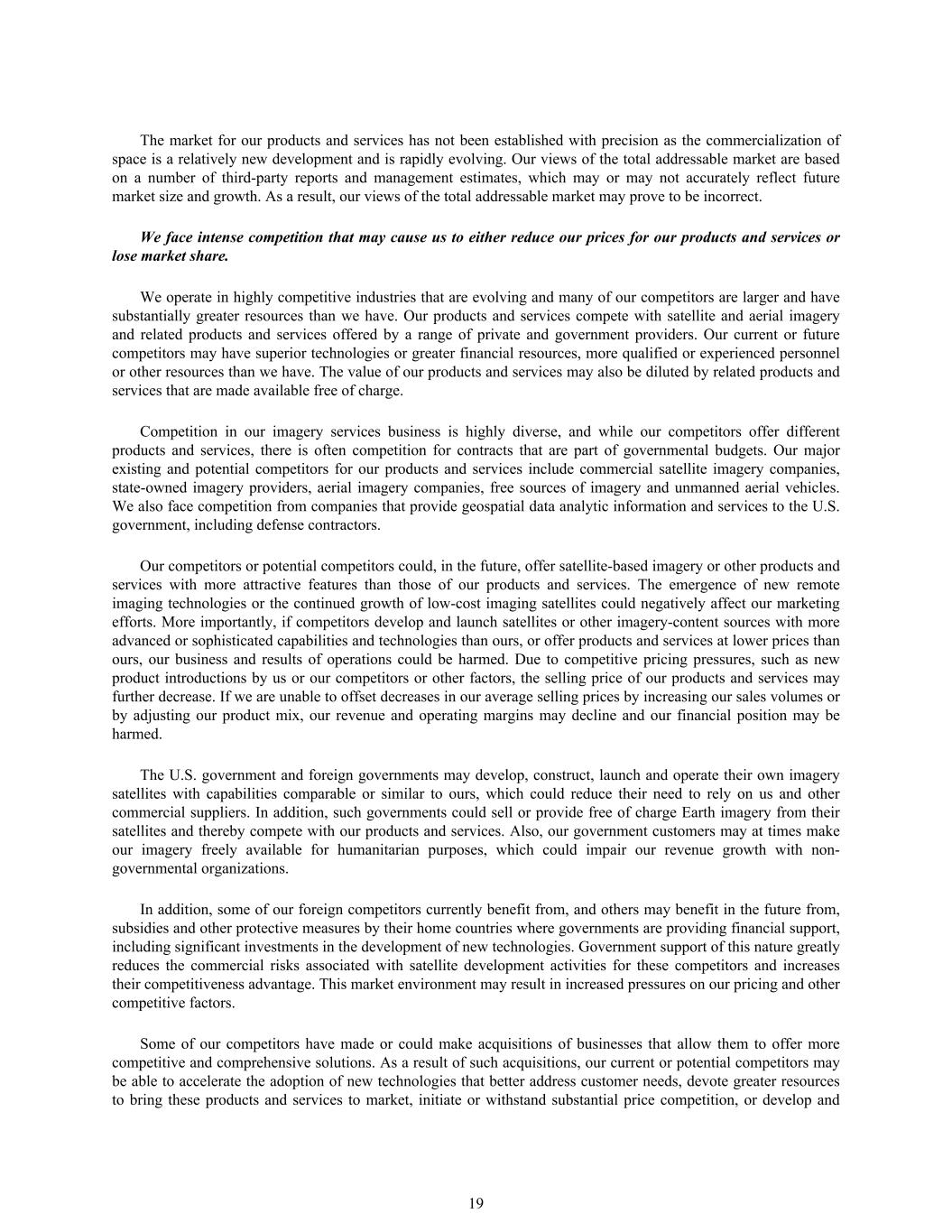 The market for our products and services has not been established with precision as the commercialization of space is a relatively new development and is rapidly evolving. Our views of the total addressable market are based on a number of third-party reports and management estimates, which may or may not accurately reflect future market size and growth. As a result, our views of the total addressable market may prove to be incorrect. We face intense competition that may cause us to either reduce our prices for our products and services or lose market share. We operate in highly competitive industries that are evolving and many of our competitors are larger and have substantially greater resources than we have. Our products and services compete with satellite and aerial imagery and related products and services offered by a range of private and government providers. Our current or future competitors may have superior technologies or greater financial resources, more qualified or experienced personnel or other resources than we have. The value of our products and services may also be diluted by related products and services that are made available free of charge. Competition in our imagery services business is highly diverse, and while our competitors offer different products and services, there is often competition for contracts that are part of governmental budgets. Our major existing and potential competitors for our products and services include commercial satellite imagery companies, state-owned imagery providers, aerial imagery companies, free sources of imagery and unmanned aerial vehicles. We also face competition from companies that provide geospatial data analytic information and services to the U.S. government, including defense contractors. Our competitors or potential competitors could, in the future, offer satellite-based imagery or other products and services with more attractive features than those of our products and services. The emergence of new remote imaging technologies or the continued growth of low-cost imaging satellites could negatively affect our marketing efforts. More importantly, if competitors develop and launch satellites or other imagery-content sources with more advanced or sophisticated capabilities and technologies than ours, or offer products and services at lower prices than ours, our business and results of operations could be harmed. Due to competitive pricing pressures, such as new product introductions by us or our competitors or other factors, the selling price of our products and services may further decrease. If we are unable to offset decreases in our average selling prices by increasing our sales volumes or by adjusting our product mix, our revenue and operating margins may decline and our financial position may be harmed. The U.S. government and foreign governments may develop, construct, launch and operate their own imagery satellites with capabilities comparable or similar to ours, which could reduce their need to rely on us and other commercial suppliers. In addition, such governments could sell or provide free of charge Earth imagery from their satellites and thereby compete with our products and services. Also, our government customers may at times make our imagery freely available for humanitarian purposes, which could impair our revenue growth with non- governmental organizations. In addition, some of our foreign competitors currently benefit from, and others may benefit in the future from, subsidies and other protective measures by their home countries where governments are providing financial support, including significant investments in the development of new technologies. Government support of this nature greatly reduces the commercial risks associated with satellite development activities for these competitors and increases their competitiveness advantage. This market environment may result in increased pressures on our pricing and other competitive factors. Some of our competitors have made or could make acquisitions of businesses that allow them to offer more competitive and comprehensive solutions. As a result of such acquisitions, our current or potential competitors may be able to accelerate the adoption of new technologies that better address customer needs, devote greater resources to bring these products and services to market, initiate or withstand substantial price competition, or develop and 19