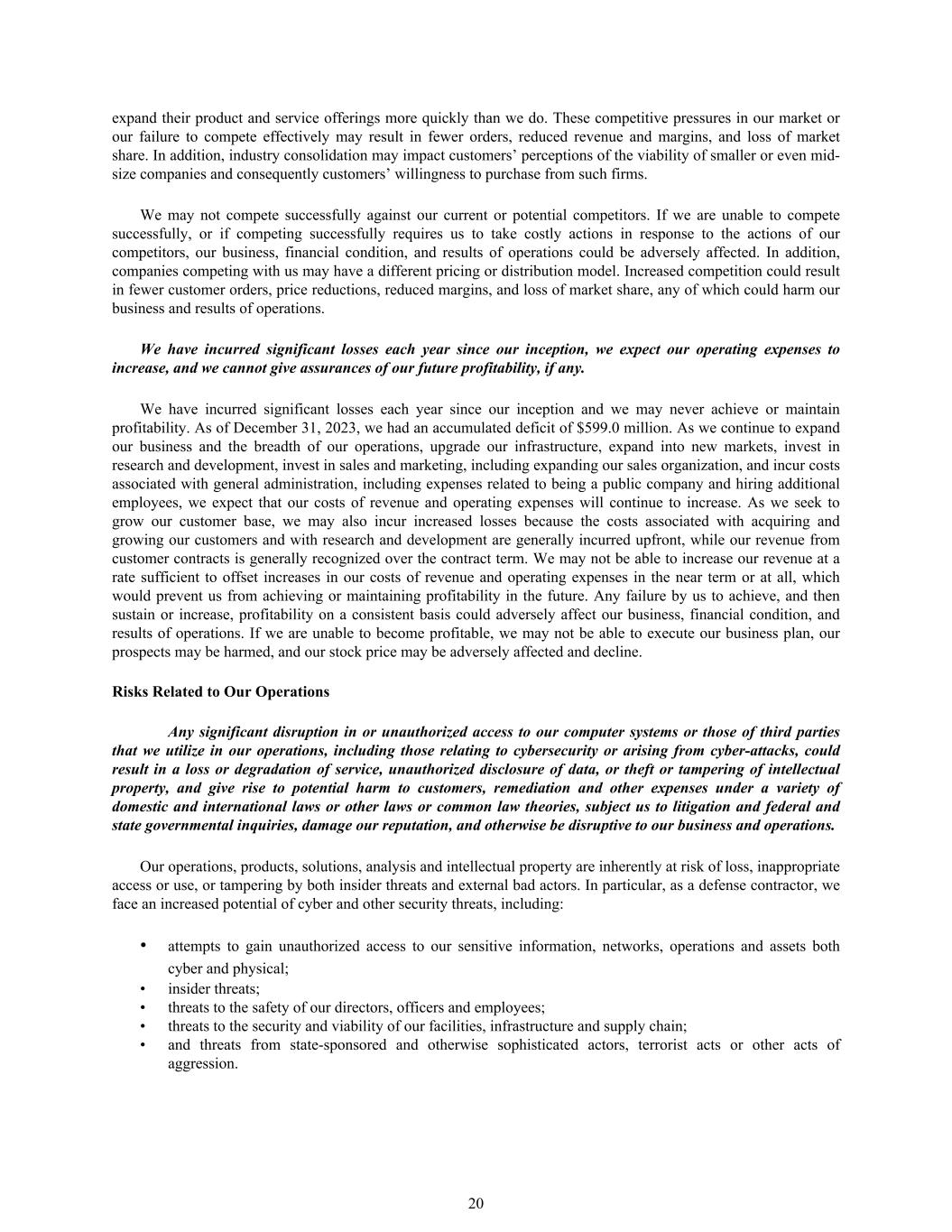 expand their product and service offerings more quickly than we do. These competitive pressures in our market or our failure to compete effectively may result in fewer orders, reduced revenue and margins, and loss of market share. In addition, industry consolidation may impact customers’ perceptions of the viability of smaller or even mid- size companies and consequently customers’ willingness to purchase from such firms. We may not compete successfully against our current or potential competitors. If we are unable to compete successfully, or if competing successfully requires us to take costly actions in response to the actions of our competitors, our business, financial condition, and results of operations could be adversely affected. In addition, companies competing with us may have a different pricing or distribution model. Increased competition could result in fewer customer orders, price reductions, reduced margins, and loss of market share, any of which could harm our business and results of operations. We have incurred significant losses each year since our inception, we expect our operating expenses to increase, and we cannot give assurances of our future profitability, if any. We have incurred significant losses each year since our inception and we may never achieve or maintain profitability. As of December 31, 2023, we had an accumulated deficit of $599.0 million. As we continue to expand our business and the breadth of our operations, upgrade our infrastructure, expand into new markets, invest in research and development, invest in sales and marketing, including expanding our sales organization, and incur costs associated with general administration, including expenses related to being a public company and hiring additional employees, we expect that our costs of revenue and operating expenses will continue to increase. As we seek to grow our customer base, we may also incur increased losses because the costs associated with acquiring and growing our customers and with research and development are generally incurred upfront, while our revenue from customer contracts is generally recognized over the contract term. We may not be able to increase our revenue at a rate sufficient to offset increases in our costs of revenue and operating expenses in the near term or at all, which would prevent us from achieving or maintaining profitability in the future. Any failure by us to achieve, and then sustain or increase, profitability on a consistent basis could adversely affect our business, financial condition, and results of operations. If we are unable to become profitable, we may not be able to execute our business plan, our prospects may be harmed, and our stock price may be adversely affected and decline. Risks Related to Our Operations Any significant disruption in or unauthorized access to our computer systems or those of third parties that we utilize in our operations, including those relating to cybersecurity or arising from cyber-attacks, could result in a loss or degradation of service, unauthorized disclosure of data, or theft or tampering of intellectual property, and give rise to potential harm to customers, remediation and other expenses under a variety of domestic and international laws or other laws or common law theories, subject us to litigation and federal and state governmental inquiries, damage our reputation, and otherwise be disruptive to our business and operations. Our operations, products, solutions, analysis and intellectual property are inherently at risk of loss, inappropriate access or use, or tampering by both insider threats and external bad actors. In particular, as a defense contractor, we face an increased potential of cyber and other security threats, including: • attempts to gain unauthorized access to our sensitive information, networks, operations and assets both cyber and physical; • insider threats; • threats to the safety of our directors, officers and employees; • threats to the security and viability of our facilities, infrastructure and supply chain; • and threats from state-sponsored and otherwise sophisticated actors, terrorist acts or other acts of aggression. 20