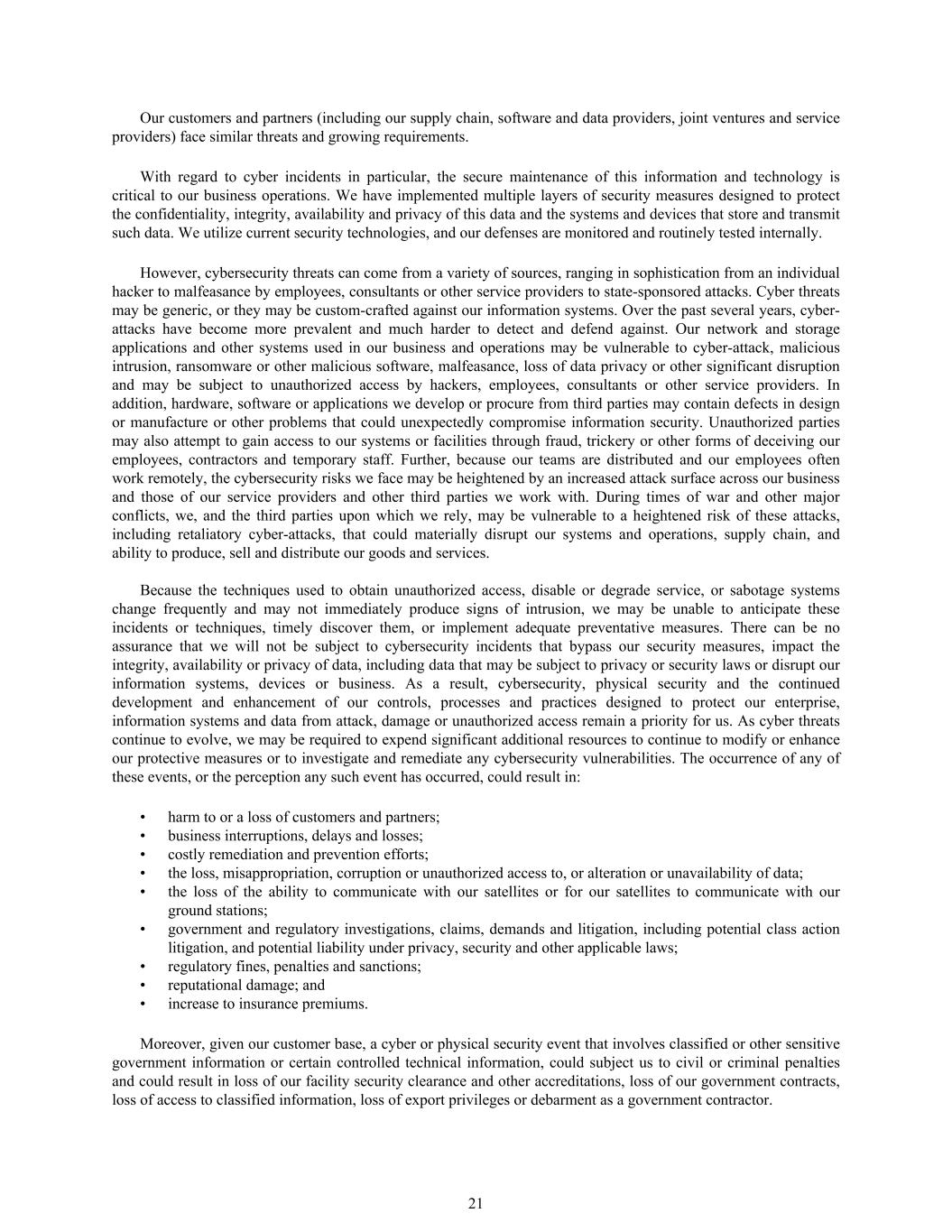 Our customers and partners (including our supply chain, software and data providers, joint ventures and service providers) face similar threats and growing requirements. With regard to cyber incidents in particular, the secure maintenance of this information and technology is critical to our business operations. We have implemented multiple layers of security measures designed to protect the confidentiality, integrity, availability and privacy of this data and the systems and devices that store and transmit such data. We utilize current security technologies, and our defenses are monitored and routinely tested internally. However, cybersecurity threats can come from a variety of sources, ranging in sophistication from an individual hacker to malfeasance by employees, consultants or other service providers to state-sponsored attacks. Cyber threats may be generic, or they may be custom-crafted against our information systems. Over the past several years, cyber- attacks have become more prevalent and much harder to detect and defend against. Our network and storage applications and other systems used in our business and operations may be vulnerable to cyber-attack, malicious intrusion, ransomware or other malicious software, malfeasance, loss of data privacy or other significant disruption and may be subject to unauthorized access by hackers, employees, consultants or other service providers. In addition, hardware, software or applications we develop or procure from third parties may contain defects in design or manufacture or other problems that could unexpectedly compromise information security. Unauthorized parties may also attempt to gain access to our systems or facilities through fraud, trickery or other forms of deceiving our employees, contractors and temporary staff. Further, because our teams are distributed and our employees often work remotely, the cybersecurity risks we face may be heightened by an increased attack surface across our business and those of our service providers and other third parties we work with. During times of war and other major conflicts, we, and the third parties upon which we rely, may be vulnerable to a heightened risk of these attacks, including retaliatory cyber-attacks, that could materially disrupt our systems and operations, supply chain, and ability to produce, sell and distribute our goods and services. Because the techniques used to obtain unauthorized access, disable or degrade service, or sabotage systems change frequently and may not immediately produce signs of intrusion, we may be unable to anticipate these incidents or techniques, timely discover them, or implement adequate preventative measures. There can be no assurance that we will not be subject to cybersecurity incidents that bypass our security measures, impact the integrity, availability or privacy of data, including data that may be subject to privacy or security laws or disrupt our information systems, devices or business. As a result, cybersecurity, physical security and the continued development and enhancement of our controls, processes and practices designed to protect our enterprise, information systems and data from attack, damage or unauthorized access remain a priority for us. As cyber threats continue to evolve, we may be required to expend significant additional resources to continue to modify or enhance our protective measures or to investigate and remediate any cybersecurity vulnerabilities. The occurrence of any of these events, or the perception any such event has occurred, could result in: • harm to or a loss of customers and partners; • business interruptions, delays and losses; • costly remediation and prevention efforts; • the loss, misappropriation, corruption or unauthorized access to, or alteration or unavailability of data; • the loss of the ability to communicate with our satellites or for our satellites to communicate with our ground stations; • government and regulatory investigations, claims, demands and litigation, including potential class action litigation, and potential liability under privacy, security and other applicable laws; • regulatory fines, penalties and sanctions; • reputational damage; and • increase to insurance premiums. Moreover, given our customer base, a cyber or physical security event that involves classified or other sensitive government information or certain controlled technical information, could subject us to civil or criminal penalties and could result in loss of our facility security clearance and other accreditations, loss of our government contracts, loss of access to classified information, loss of export privileges or debarment as a government contractor. 21