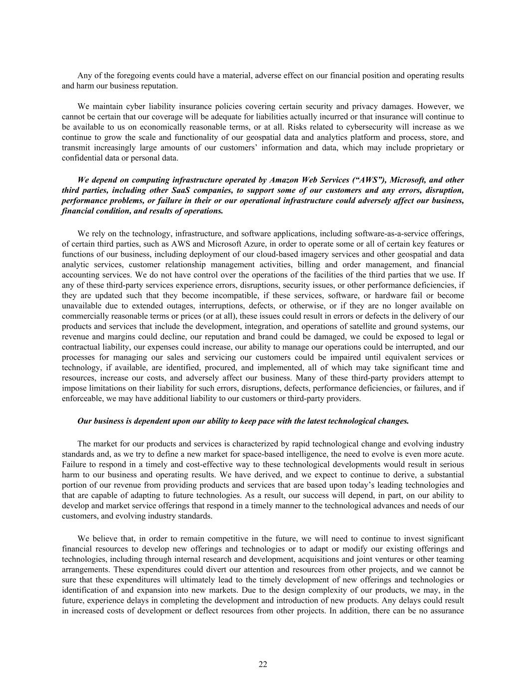 Any of the foregoing events could have a material, adverse effect on our financial position and operating results and harm our business reputation. We maintain cyber liability insurance policies covering certain security and privacy damages. However, we cannot be certain that our coverage will be adequate for liabilities actually incurred or that insurance will continue to be available to us on economically reasonable terms, or at all. Risks related to cybersecurity will increase as we continue to grow the scale and functionality of our geospatial data and analytics platform and process, store, and transmit increasingly large amounts of our customers’ information and data, which may include proprietary or confidential data or personal data. We depend on computing infrastructure operated by Amazon Web Services (“AWS”), Microsoft, and other third parties, including other SaaS companies, to support some of our customers and any errors, disruption, performance problems, or failure in their or our operational infrastructure could adversely affect our business, financial condition, and results of operations. We rely on the technology, infrastructure, and software applications, including software-as-a-service offerings, of certain third parties, such as AWS and Microsoft Azure, in order to operate some or all of certain key features or functions of our business, including deployment of our cloud-based imagery services and other geospatial and data analytic services, customer relationship management activities, billing and order management, and financial accounting services. We do not have control over the operations of the facilities of the third parties that we use. If any of these third-party services experience errors, disruptions, security issues, or other performance deficiencies, if they are updated such that they become incompatible, if these services, software, or hardware fail or become unavailable due to extended outages, interruptions, defects, or otherwise, or if they are no longer available on commercially reasonable terms or prices (or at all), these issues could result in errors or defects in the delivery of our products and services that include the development, integration, and operations of satellite and ground systems, our revenue and margins could decline, our reputation and brand could be damaged, we could be exposed to legal or contractual liability, our expenses could increase, our ability to manage our operations could be interrupted, and our processes for managing our sales and servicing our customers could be impaired until equivalent services or technology, if available, are identified, procured, and implemented, all of which may take significant time and resources, increase our costs, and adversely affect our business. Many of these third-party providers attempt to impose limitations on their liability for such errors, disruptions, defects, performance deficiencies, or failures, and if enforceable, we may have additional liability to our customers or third-party providers. Our business is dependent upon our ability to keep pace with the latest technological changes. The market for our products and services is characterized by rapid technological change and evolving industry standards and, as we try to define a new market for space-based intelligence, the need to evolve is even more acute. Failure to respond in a timely and cost-effective way to these technological developments would result in serious harm to our business and operating results. We have derived, and we expect to continue to derive, a substantial portion of our revenue from providing products and services that are based upon today’s leading technologies and that are capable of adapting to future technologies. As a result, our success will depend, in part, on our ability to develop and market service offerings that respond in a timely manner to the technological advances and needs of our customers, and evolving industry standards. We believe that, in order to remain competitive in the future, we will need to continue to invest significant financial resources to develop new offerings and technologies or to adapt or modify our existing offerings and technologies, including through internal research and development, acquisitions and joint ventures or other teaming arrangements. These expenditures could divert our attention and resources from other projects, and we cannot be sure that these expenditures will ultimately lead to the timely development of new offerings and technologies or identification of and expansion into new markets. Due to the design complexity of our products, we may, in the future, experience delays in completing the development and introduction of new products. Any delays could result in increased costs of development or deflect resources from other projects. In addition, there can be no assurance 22