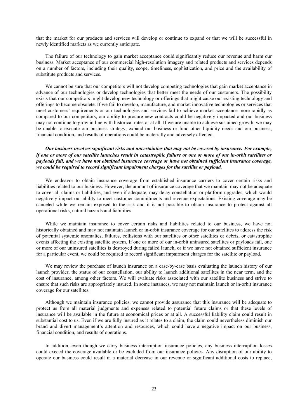 that the market for our products and services will develop or continue to expand or that we will be successful in newly identified markets as we currently anticipate. The failure of our technology to gain market acceptance could significantly reduce our revenue and harm our business. Market acceptance of our commercial high-resolution imagery and related products and services depends on a number of factors, including their quality, scope, timeliness, sophistication, and price and the availability of substitute products and services. We cannot be sure that our competitors will not develop competing technologies that gain market acceptance in advance of our technologies or develop technologies that better meet the needs of our customers. The possibility exists that our competitors might develop new technology or offerings that might cause our existing technology and offerings to become obsolete. If we fail to develop, manufacture, and market innovative technologies or services that meet customers’ requirements or our technologies and services fail to achieve market acceptance more rapidly as compared to our competitors, our ability to procure new contracts could be negatively impacted and our business may not continue to grow in line with historical rates or at all. If we are unable to achieve sustained growth, we may be unable to execute our business strategy, expand our business or fund other liquidity needs and our business, financial condition, and results of operations could be materially and adversely affected. Our business involves significant risks and uncertainties that may not be covered by insurance. For example, if one or more of our satellite launches result in catastrophic failure or one or more of our in-orbit satellites or payloads fail, and we have not obtained insurance coverage or have not obtained sufficient insurance coverage, we could be required to record significant impairment charges for the satellite or payload. We endeavor to obtain insurance coverage from established insurance carriers to cover certain risks and liabilities related to our business. However, the amount of insurance coverage that we maintain may not be adequate to cover all claims or liabilities, and even if adequate, may delay constellation or platform upgrades, which would negatively impact our ability to meet customer commitments and revenue expectations. Existing coverage may be canceled while we remain exposed to the risk and it is not possible to obtain insurance to protect against all operational risks, natural hazards and liabilities. While we maintain insurance to cover certain risks and liabilities related to our business, we have not historically obtained and may not maintain launch or in-orbit insurance coverage for our satellites to address the risk of potential systemic anomalies, failures, collisions with our satellites or other satellites or debris, or catastrophic events affecting the existing satellite system. If one or more of our in-orbit uninsured satellites or payloads fail, one or more of our uninsured satellites is destroyed during failed launch, or if we have not obtained sufficient insurance for a particular event, we could be required to record significant impairment charges for the satellite or payload. We may review the purchase of launch insurance on a case-by-case basis evaluating the launch history of our launch provider, the status of our constellation, our ability to launch additional satellites in the near term, and the cost of insurance, among other factors. We will evaluate risks associated with our satellite business and strive to ensure that such risks are appropriately insured. In some instances, we may not maintain launch or in-orbit insurance coverage for our satellites. Although we maintain insurance policies, we cannot provide assurance that this insurance will be adequate to protect us from all material judgments and expenses related to potential future claims or that these levels of insurance will be available in the future at economical prices or at all. A successful liability claim could result in substantial cost to us. Even if we are fully insured as it relates to a claim, the claim could nevertheless diminish our brand and divert management’s attention and resources, which could have a negative impact on our business, financial condition, and results of operations. In addition, even though we carry business interruption insurance policies, any business interruption losses could exceed the coverage available or be excluded from our insurance policies. Any disruption of our ability to operate our business could result in a material decrease in our revenue or significant additional costs to replace, 23