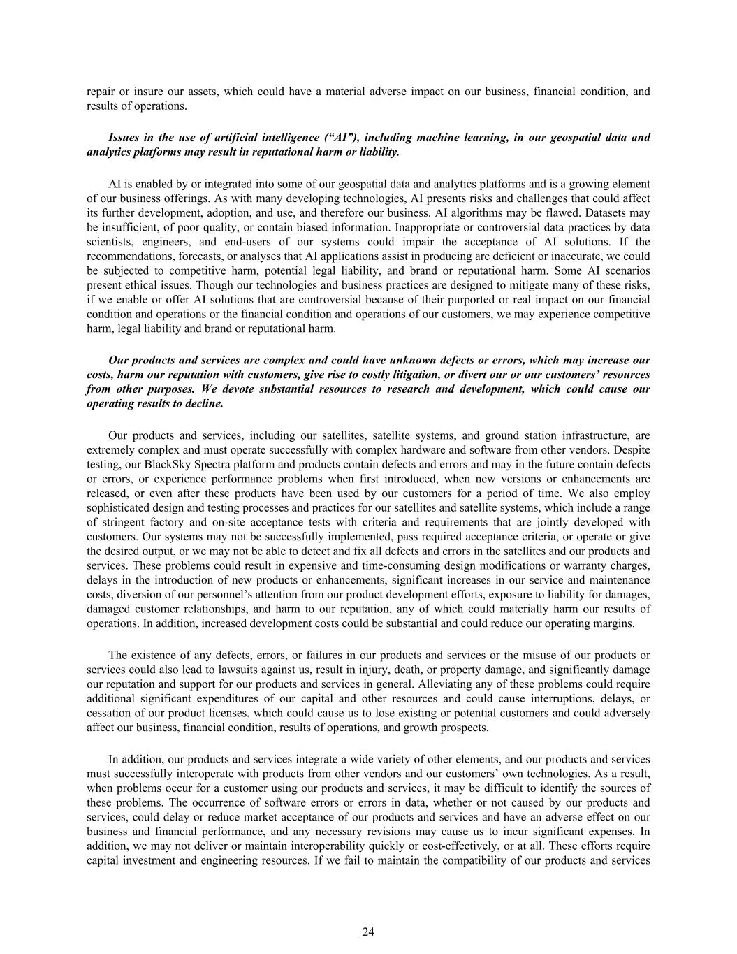 repair or insure our assets, which could have a material adverse impact on our business, financial condition, and results of operations. Issues in the use of artificial intelligence (“AI”), including machine learning, in our geospatial data and analytics platforms may result in reputational harm or liability. AI is enabled by or integrated into some of our geospatial data and analytics platforms and is a growing element of our business offerings. As with many developing technologies, AI presents risks and challenges that could affect its further development, adoption, and use, and therefore our business. AI algorithms may be flawed. Datasets may be insufficient, of poor quality, or contain biased information. Inappropriate or controversial data practices by data scientists, engineers, and end-users of our systems could impair the acceptance of AI solutions. If the recommendations, forecasts, or analyses that AI applications assist in producing are deficient or inaccurate, we could be subjected to competitive harm, potential legal liability, and brand or reputational harm. Some AI scenarios present ethical issues. Though our technologies and business practices are designed to mitigate many of these risks, if we enable or offer AI solutions that are controversial because of their purported or real impact on our financial condition and operations or the financial condition and operations of our customers, we may experience competitive harm, legal liability and brand or reputational harm. Our products and services are complex and could have unknown defects or errors, which may increase our costs, harm our reputation with customers, give rise to costly litigation, or divert our or our customers’ resources from other purposes. We devote substantial resources to research and development, which could cause our operating results to decline. Our products and services, including our satellites, satellite systems, and ground station infrastructure, are extremely complex and must operate successfully with complex hardware and software from other vendors. Despite testing, our BlackSky Spectra platform and products contain defects and errors and may in the future contain defects or errors, or experience performance problems when first introduced, when new versions or enhancements are released, or even after these products have been used by our customers for a period of time. We also employ sophisticated design and testing processes and practices for our satellites and satellite systems, which include a range of stringent factory and on-site acceptance tests with criteria and requirements that are jointly developed with customers. Our systems may not be successfully implemented, pass required acceptance criteria, or operate or give the desired output, or we may not be able to detect and fix all defects and errors in the satellites and our products and services. These problems could result in expensive and time-consuming design modifications or warranty charges, delays in the introduction of new products or enhancements, significant increases in our service and maintenance costs, diversion of our personnel’s attention from our product development efforts, exposure to liability for damages, damaged customer relationships, and harm to our reputation, any of which could materially harm our results of operations. In addition, increased development costs could be substantial and could reduce our operating margins. The existence of any defects, errors, or failures in our products and services or the misuse of our products or services could also lead to lawsuits against us, result in injury, death, or property damage, and significantly damage our reputation and support for our products and services in general. Alleviating any of these problems could require additional significant expenditures of our capital and other resources and could cause interruptions, delays, or cessation of our product licenses, which could cause us to lose existing or potential customers and could adversely affect our business, financial condition, results of operations, and growth prospects. In addition, our products and services integrate a wide variety of other elements, and our products and services must successfully interoperate with products from other vendors and our customers’ own technologies. As a result, when problems occur for a customer using our products and services, it may be difficult to identify the sources of these problems. The occurrence of software errors or errors in data, whether or not caused by our products and services, could delay or reduce market acceptance of our products and services and have an adverse effect on our business and financial performance, and any necessary revisions may cause us to incur significant expenses. In addition, we may not deliver or maintain interoperability quickly or cost-effectively, or at all. These efforts require capital investment and engineering resources. If we fail to maintain the compatibility of our products and services 24