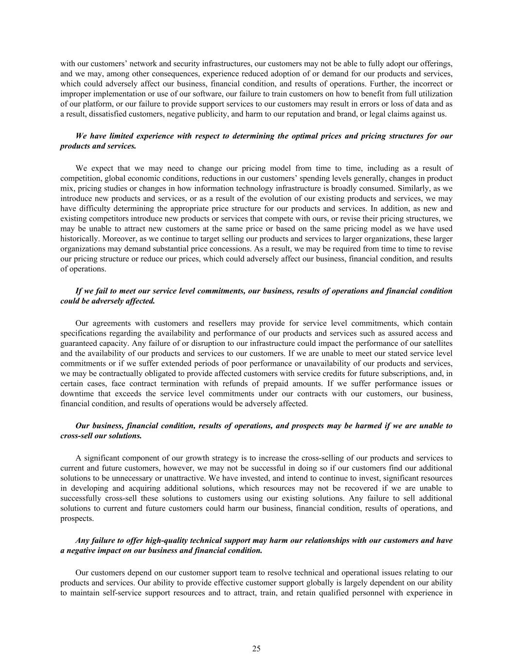 with our customers’ network and security infrastructures, our customers may not be able to fully adopt our offerings, and we may, among other consequences, experience reduced adoption of or demand for our products and services, which could adversely affect our business, financial condition, and results of operations. Further, the incorrect or improper implementation or use of our software, our failure to train customers on how to benefit from full utilization of our platform, or our failure to provide support services to our customers may result in errors or loss of data and as a result, dissatisfied customers, negative publicity, and harm to our reputation and brand, or legal claims against us. We have limited experience with respect to determining the optimal prices and pricing structures for our products and services. We expect that we may need to change our pricing model from time to time, including as a result of competition, global economic conditions, reductions in our customers’ spending levels generally, changes in product mix, pricing studies or changes in how information technology infrastructure is broadly consumed. Similarly, as we introduce new products and services, or as a result of the evolution of our existing products and services, we may have difficulty determining the appropriate price structure for our products and services. In addition, as new and existing competitors introduce new products or services that compete with ours, or revise their pricing structures, we may be unable to attract new customers at the same price or based on the same pricing model as we have used historically. Moreover, as we continue to target selling our products and services to larger organizations, these larger organizations may demand substantial price concessions. As a result, we may be required from time to time to revise our pricing structure or reduce our prices, which could adversely affect our business, financial condition, and results of operations. If we fail to meet our service level commitments, our business, results of operations and financial condition could be adversely affected. Our agreements with customers and resellers may provide for service level commitments, which contain specifications regarding the availability and performance of our products and services such as assured access and guaranteed capacity. Any failure of or disruption to our infrastructure could impact the performance of our satellites and the availability of our products and services to our customers. If we are unable to meet our stated service level commitments or if we suffer extended periods of poor performance or unavailability of our products and services, we may be contractually obligated to provide affected customers with service credits for future subscriptions, and, in certain cases, face contract termination with refunds of prepaid amounts. If we suffer performance issues or downtime that exceeds the service level commitments under our contracts with our customers, our business, financial condition, and results of operations would be adversely affected. Our business, financial condition, results of operations, and prospects may be harmed if we are unable to cross-sell our solutions. A significant component of our growth strategy is to increase the cross-selling of our products and services to current and future customers, however, we may not be successful in doing so if our customers find our additional solutions to be unnecessary or unattractive. We have invested, and intend to continue to invest, significant resources in developing and acquiring additional solutions, which resources may not be recovered if we are unable to successfully cross-sell these solutions to customers using our existing solutions. Any failure to sell additional solutions to current and future customers could harm our business, financial condition, results of operations, and prospects. Any failure to offer high-quality technical support may harm our relationships with our customers and have a negative impact on our business and financial condition. Our customers depend on our customer support team to resolve technical and operational issues relating to our products and services. Our ability to provide effective customer support globally is largely dependent on our ability to maintain self-service support resources and to attract, train, and retain qualified personnel with experience in 25
