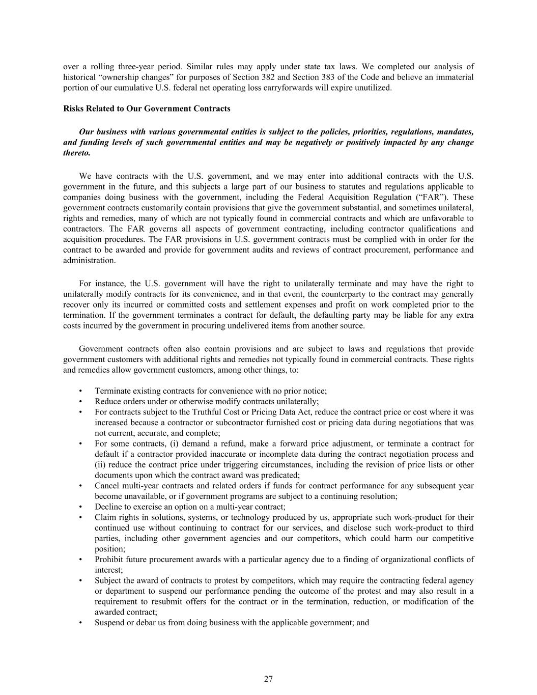 over a rolling three-year period. Similar rules may apply under state tax laws. We completed our analysis of historical “ownership changes” for purposes of Section 382 and Section 383 of the Code and believe an immaterial portion of our cumulative U.S. federal net operating loss carryforwards will expire unutilized. Risks Related to Our Government Contracts Our business with various governmental entities is subject to the policies, priorities, regulations, mandates, and funding levels of such governmental entities and may be negatively or positively impacted by any change thereto. We have contracts with the U.S. government, and we may enter into additional contracts with the U.S. government in the future, and this subjects a large part of our business to statutes and regulations applicable to companies doing business with the government, including the Federal Acquisition Regulation (“FAR”). These government contracts customarily contain provisions that give the government substantial, and sometimes unilateral, rights and remedies, many of which are not typically found in commercial contracts and which are unfavorable to contractors. The FAR governs all aspects of government contracting, including contractor qualifications and acquisition procedures. The FAR provisions in U.S. government contracts must be complied with in order for the contract to be awarded and provide for government audits and reviews of contract procurement, performance and administration. For instance, the U.S. government will have the right to unilaterally terminate and may have the right to unilaterally modify contracts for its convenience, and in that event, the counterparty to the contract may generally recover only its incurred or committed costs and settlement expenses and profit on work completed prior to the termination. If the government terminates a contract for default, the defaulting party may be liable for any extra costs incurred by the government in procuring undelivered items from another source. Government contracts often also contain provisions and are subject to laws and regulations that provide government customers with additional rights and remedies not typically found in commercial contracts. These rights and remedies allow government customers, among other things, to: • Terminate existing contracts for convenience with no prior notice; • Reduce orders under or otherwise modify contracts unilaterally; • For contracts subject to the Truthful Cost or Pricing Data Act, reduce the contract price or cost where it was increased because a contractor or subcontractor furnished cost or pricing data during negotiations that was not current, accurate, and complete; • For some contracts, (i) demand a refund, make a forward price adjustment, or terminate a contract for default if a contractor provided inaccurate or incomplete data during the contract negotiation process and (ii) reduce the contract price under triggering circumstances, including the revision of price lists or other documents upon which the contract award was predicated; • Cancel multi-year contracts and related orders if funds for contract performance for any subsequent year become unavailable, or if government programs are subject to a continuing resolution; • Decline to exercise an option on a multi-year contract; • Claim rights in solutions, systems, or technology produced by us, appropriate such work-product for their continued use without continuing to contract for our services, and disclose such work-product to third parties, including other government agencies and our competitors, which could harm our competitive position; • Prohibit future procurement awards with a particular agency due to a finding of organizational conflicts of interest; • Subject the award of contracts to protest by competitors, which may require the contracting federal agency or department to suspend our performance pending the outcome of the protest and may also result in a requirement to resubmit offers for the contract or in the termination, reduction, or modification of the awarded contract; • Suspend or debar us from doing business with the applicable government; and 27