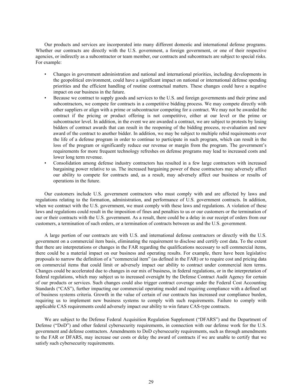 Our products and services are incorporated into many different domestic and international defense programs. Whether our contracts are directly with the U.S. government, a foreign government, or one of their respective agencies, or indirectly as a subcontractor or team member, our contracts and subcontracts are subject to special risks. For example: • Changes in government administration and national and international priorities, including developments in the geopolitical environment, could have a significant impact on national or international defense spending priorities and the efficient handling of routine contractual matters. These changes could have a negative impact on our business in the future. • Because we contract to supply goods and services to the U.S. and foreign governments and their prime and subcontractors, we compete for contracts in a competitive bidding process. We may compete directly with other suppliers or align with a prime or subcontractor competing for a contract. We may not be awarded the contract if the pricing or product offering is not competitive, either at our level or the prime or subcontractor level. In addition, in the event we are awarded a contract, we are subject to protests by losing bidders of contract awards that can result in the reopening of the bidding process, re-evaluation and new award of the contract to another bidder. In addition, we may be subject to multiple rebid requirements over the life of a defense program in order to continue to participate in such program, which can result in the loss of the program or significantly reduce our revenue or margin from the program. The government’s requirements for more frequent technology refreshes on defense programs may lead to increased costs and lower long term revenue. • Consolidation among defense industry contractors has resulted in a few large contractors with increased bargaining power relative to us. The increased bargaining power of these contractors may adversely affect our ability to compete for contracts and, as a result, may adversely affect our business or results of operations in the future. Our customers include U.S. government contractors who must comply with and are affected by laws and regulations relating to the formation, administration, and performance of U.S. government contracts. In addition, when we contract with the U.S. government, we must comply with these laws and regulations. A violation of these laws and regulations could result in the imposition of fines and penalties to us or our customers or the termination of our or their contracts with the U.S. government. As a result, there could be a delay in our receipt of orders from our customers, a termination of such orders, or a termination of contracts between us and the U.S. government. A large portion of our contracts are with U.S. and international defense contractors or directly with the U.S. government on a commercial item basis, eliminating the requirement to disclose and certify cost data. To the extent that there are interpretations or changes in the FAR regarding the qualifications necessary to sell commercial items, there could be a material impact on our business and operating results. For example, there have been legislative proposals to narrow the definition of a “commercial item” (as defined in the FAR) or to require cost and pricing data on commercial items that could limit or adversely impact our ability to contract under commercial item terms. Changes could be accelerated due to changes in our mix of business, in federal regulations, or in the interpretation of federal regulations, which may subject us to increased oversight by the Defense Contract Audit Agency for certain of our products or services. Such changes could also trigger contract coverage under the Federal Cost Accounting Standards (“CAS”), further impacting our commercial operating model and requiring compliance with a defined set of business systems criteria. Growth in the value of certain of our contracts has increased our compliance burden, requiring us to implement new business systems to comply with such requirements. Failure to comply with applicable CAS requirements could adversely impact our ability to win future CAS-type contracts. We are subject to the Defense Federal Acquisition Regulation Supplement (“DFARS”) and the Department of Defense (“DoD”) and other federal cybersecurity requirements, in connection with our defense work for the U.S. government and defense contractors. Amendments to DoD cybersecurity requirements, such as through amendments to the FAR or DFARS, may increase our costs or delay the award of contracts if we are unable to certify that we satisfy such cybersecurity requirements. 29