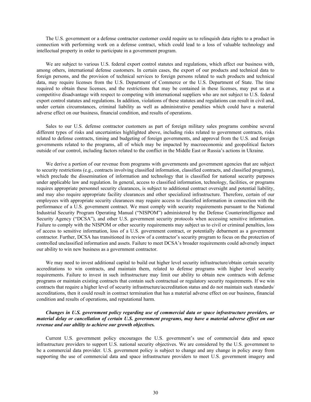 The U.S. government or a defense contractor customer could require us to relinquish data rights to a product in connection with performing work on a defense contract, which could lead to a loss of valuable technology and intellectual property in order to participate in a government program. We are subject to various U.S. federal export control statutes and regulations, which affect our business with, among others, international defense customers. In certain cases, the export of our products and technical data to foreign persons, and the provision of technical services to foreign persons related to such products and technical data, may require licenses from the U.S. Department of Commerce or the U.S. Department of State. The time required to obtain these licenses, and the restrictions that may be contained in these licenses, may put us at a competitive disadvantage with respect to competing with international suppliers who are not subject to U.S. federal export control statutes and regulations. In addition, violations of these statutes and regulations can result in civil and, under certain circumstances, criminal liability as well as administrative penalties which could have a material adverse effect on our business, financial condition, and results of operations. Sales to our U.S. defense contractor customers as part of foreign military sales programs combine several different types of risks and uncertainties highlighted above, including risks related to government contracts, risks related to defense contracts, timing and budgeting of foreign governments, and approval from the U.S. and foreign governments related to the programs, all of which may be impacted by macroeconomic and geopolitical factors outside of our control, including factors related to the conflict in the Middle East or Russia’s actions in Ukraine. We derive a portion of our revenue from programs with governments and government agencies that are subject to security restrictions (e.g., contracts involving classified information, classified contracts, and classified programs), which preclude the dissemination of information and technology that is classified for national security purposes under applicable law and regulation. In general, access to classified information, technology, facilities, or programs requires appropriate personnel security clearances, is subject to additional contract oversight and potential liability, and may also require appropriate facility clearances and other specialized infrastructure. Therefore, certain of our employees with appropriate security clearances may require access to classified information in connection with the performance of a U.S. government contract. We must comply with security requirements pursuant to the National Industrial Security Program Operating Manual (“NISPOM”) administered by the Defense Counterintelligence and Security Agency (“DCSA”), and other U.S. government security protocols when accessing sensitive information. Failure to comply with the NISPOM or other security requirements may subject us to civil or criminal penalties, loss of access to sensitive information, loss of a U.S. government contract, or potentially debarment as a government contractor. Further, DCSA has transitioned its review of a contractor’s security program to focus on the protection of controlled unclassified information and assets. Failure to meet DCSA’s broader requirements could adversely impact our ability to win new business as a government contractor. We may need to invest additional capital to build out higher level security infrastructure/obtain certain security accreditations to win contracts, and maintain them, related to defense programs with higher level security requirements. Failure to invest in such infrastructure may limit our ability to obtain new contracts with defense programs or maintain existing contracts that contain such contractual or regulatory security requirements. If we win contracts that require a higher level of security infrastructure/accreditation status and do not maintain such standards/ accreditations, then it could result in contract termination that has a material adverse effect on our business, financial condition and results of operations, and reputational harm. Changes in U.S. government policy regarding use of commercial data or space infrastructure providers, or material delay or cancellation of certain U.S. government programs, may have a material adverse effect on our revenue and our ability to achieve our growth objectives. Current U.S. government policy encourages the U.S. government’s use of commercial data and space infrastructure providers to support U.S. national security objectives. We are considered by the U.S. government to be a commercial data provider. U.S. government policy is subject to change and any change in policy away from supporting the use of commercial data and space infrastructure providers to meet U.S. government imagery and 30