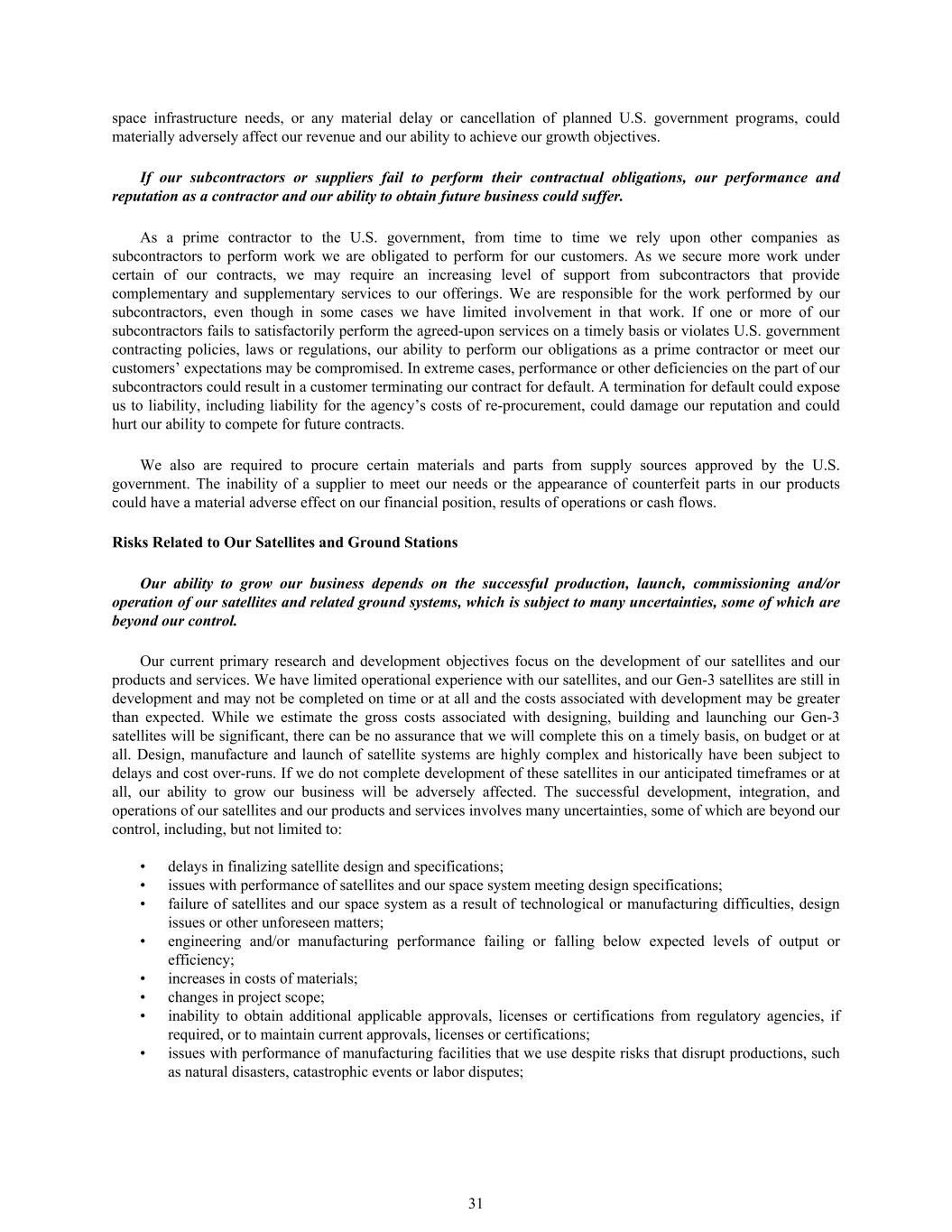space infrastructure needs, or any material delay or cancellation of planned U.S. government programs, could materially adversely affect our revenue and our ability to achieve our growth objectives. If our subcontractors or suppliers fail to perform their contractual obligations, our performance and reputation as a contractor and our ability to obtain future business could suffer. As a prime contractor to the U.S. government, from time to time we rely upon other companies as subcontractors to perform work we are obligated to perform for our customers. As we secure more work under certain of our contracts, we may require an increasing level of support from subcontractors that provide complementary and supplementary services to our offerings. We are responsible for the work performed by our subcontractors, even though in some cases we have limited involvement in that work. If one or more of our subcontractors fails to satisfactorily perform the agreed-upon services on a timely basis or violates U.S. government contracting policies, laws or regulations, our ability to perform our obligations as a prime contractor or meet our customers’ expectations may be compromised. In extreme cases, performance or other deficiencies on the part of our subcontractors could result in a customer terminating our contract for default. A termination for default could expose us to liability, including liability for the agency’s costs of re-procurement, could damage our reputation and could hurt our ability to compete for future contracts. We also are required to procure certain materials and parts from supply sources approved by the U.S. government. The inability of a supplier to meet our needs or the appearance of counterfeit parts in our products could have a material adverse effect on our financial position, results of operations or cash flows. Risks Related to Our Satellites and Ground Stations Our ability to grow our business depends on the successful production, launch, commissioning and/or operation of our satellites and related ground systems, which is subject to many uncertainties, some of which are beyond our control. Our current primary research and development objectives focus on the development of our satellites and our products and services. We have limited operational experience with our satellites, and our Gen-3 satellites are still in development and may not be completed on time or at all and the costs associated with development may be greater than expected. While we estimate the gross costs associated with designing, building and launching our Gen-3 satellites will be significant, there can be no assurance that we will complete this on a timely basis, on budget or at all. Design, manufacture and launch of satellite systems are highly complex and historically have been subject to delays and cost over-runs. If we do not complete development of these satellites in our anticipated timeframes or at all, our ability to grow our business will be adversely affected. The successful development, integration, and operations of our satellites and our products and services involves many uncertainties, some of which are beyond our control, including, but not limited to: • delays in finalizing satellite design and specifications; • issues with performance of satellites and our space system meeting design specifications; • failure of satellites and our space system as a result of technological or manufacturing difficulties, design issues or other unforeseen matters; • engineering and/or manufacturing performance failing or falling below expected levels of output or efficiency; • increases in costs of materials; • changes in project scope; • inability to obtain additional applicable approvals, licenses or certifications from regulatory agencies, if required, or to maintain current approvals, licenses or certifications; • issues with performance of manufacturing facilities that we use despite risks that disrupt productions, such as natural disasters, catastrophic events or labor disputes; 31