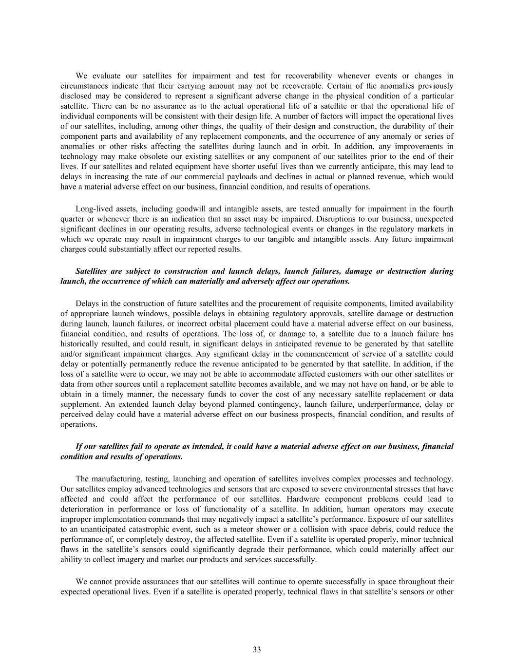 We evaluate our satellites for impairment and test for recoverability whenever events or changes in circumstances indicate that their carrying amount may not be recoverable. Certain of the anomalies previously disclosed may be considered to represent a significant adverse change in the physical condition of a particular satellite. There can be no assurance as to the actual operational life of a satellite or that the operational life of individual components will be consistent with their design life. A number of factors will impact the operational lives of our satellites, including, among other things, the quality of their design and construction, the durability of their component parts and availability of any replacement components, and the occurrence of any anomaly or series of anomalies or other risks affecting the satellites during launch and in orbit. In addition, any improvements in technology may make obsolete our existing satellites or any component of our satellites prior to the end of their lives. If our satellites and related equipment have shorter useful lives than we currently anticipate, this may lead to delays in increasing the rate of our commercial payloads and declines in actual or planned revenue, which would have a material adverse effect on our business, financial condition, and results of operations. Long-lived assets, including goodwill and intangible assets, are tested annually for impairment in the fourth quarter or whenever there is an indication that an asset may be impaired. Disruptions to our business, unexpected significant declines in our operating results, adverse technological events or changes in the regulatory markets in which we operate may result in impairment charges to our tangible and intangible assets. Any future impairment charges could substantially affect our reported results. Satellites are subject to construction and launch delays, launch failures, damage or destruction during launch, the occurrence of which can materially and adversely affect our operations. Delays in the construction of future satellites and the procurement of requisite components, limited availability of appropriate launch windows, possible delays in obtaining regulatory approvals, satellite damage or destruction during launch, launch failures, or incorrect orbital placement could have a material adverse effect on our business, financial condition, and results of operations. The loss of, or damage to, a satellite due to a launch failure has historically resulted, and could result, in significant delays in anticipated revenue to be generated by that satellite and/or significant impairment charges. Any significant delay in the commencement of service of a satellite could delay or potentially permanently reduce the revenue anticipated to be generated by that satellite. In addition, if the loss of a satellite were to occur, we may not be able to accommodate affected customers with our other satellites or data from other sources until a replacement satellite becomes available, and we may not have on hand, or be able to obtain in a timely manner, the necessary funds to cover the cost of any necessary satellite replacement or data supplement. An extended launch delay beyond planned contingency, launch failure, underperformance, delay or perceived delay could have a material adverse effect on our business prospects, financial condition, and results of operations. If our satellites fail to operate as intended, it could have a material adverse effect on our business, financial condition and results of operations. The manufacturing, testing, launching and operation of satellites involves complex processes and technology. Our satellites employ advanced technologies and sensors that are exposed to severe environmental stresses that have affected and could affect the performance of our satellites. Hardware component problems could lead to deterioration in performance or loss of functionality of a satellite. In addition, human operators may execute improper implementation commands that may negatively impact a satellite’s performance. Exposure of our satellites to an unanticipated catastrophic event, such as a meteor shower or a collision with space debris, could reduce the performance of, or completely destroy, the affected satellite. Even if a satellite is operated properly, minor technical flaws in the satellite’s sensors could significantly degrade their performance, which could materially affect our ability to collect imagery and market our products and services successfully. We cannot provide assurances that our satellites will continue to operate successfully in space throughout their expected operational lives. Even if a satellite is operated properly, technical flaws in that satellite’s sensors or other 33