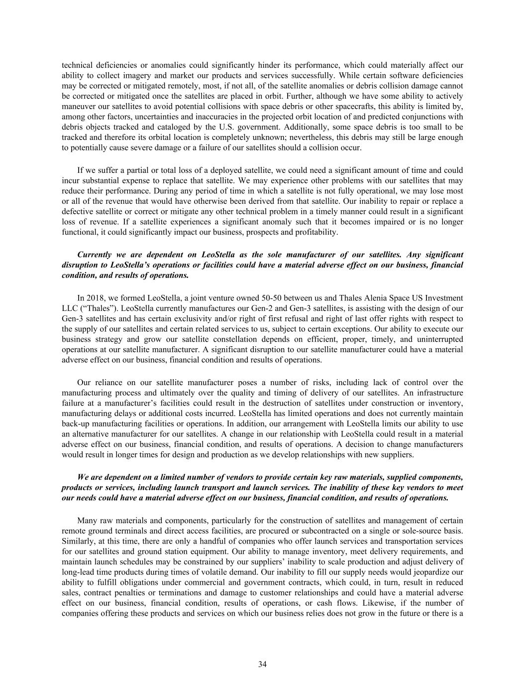 technical deficiencies or anomalies could significantly hinder its performance, which could materially affect our ability to collect imagery and market our products and services successfully. While certain software deficiencies may be corrected or mitigated remotely, most, if not all, of the satellite anomalies or debris collision damage cannot be corrected or mitigated once the satellites are placed in orbit. Further, although we have some ability to actively maneuver our satellites to avoid potential collisions with space debris or other spacecrafts, this ability is limited by, among other factors, uncertainties and inaccuracies in the projected orbit location of and predicted conjunctions with debris objects tracked and cataloged by the U.S. government. Additionally, some space debris is too small to be tracked and therefore its orbital location is completely unknown; nevertheless, this debris may still be large enough to potentially cause severe damage or a failure of our satellites should a collision occur. If we suffer a partial or total loss of a deployed satellite, we could need a significant amount of time and could incur substantial expense to replace that satellite. We may experience other problems with our satellites that may reduce their performance. During any period of time in which a satellite is not fully operational, we may lose most or all of the revenue that would have otherwise been derived from that satellite. Our inability to repair or replace a defective satellite or correct or mitigate any other technical problem in a timely manner could result in a significant loss of revenue. If a satellite experiences a significant anomaly such that it becomes impaired or is no longer functional, it could significantly impact our business, prospects and profitability. Currently we are dependent on LeoStella as the sole manufacturer of our satellites. Any significant disruption to LeoStella’s operations or facilities could have a material adverse effect on our business, financial condition, and results of operations. In 2018, we formed LeoStella, a joint venture owned 50-50 between us and Thales Alenia Space US Investment LLC (“Thales”). LeoStella currently manufactures our Gen-2 and Gen-3 satellites, is assisting with the design of our Gen-3 satellites and has certain exclusivity and/or right of first refusal and right of last offer rights with respect to the supply of our satellites and certain related services to us, subject to certain exceptions. Our ability to execute our business strategy and grow our satellite constellation depends on efficient, proper, timely, and uninterrupted operations at our satellite manufacturer. A significant disruption to our satellite manufacturer could have a material adverse effect on our business, financial condition and results of operations. Our reliance on our satellite manufacturer poses a number of risks, including lack of control over the manufacturing process and ultimately over the quality and timing of delivery of our satellites. An infrastructure failure at a manufacturer’s facilities could result in the destruction of satellites under construction or inventory, manufacturing delays or additional costs incurred. LeoStella has limited operations and does not currently maintain back-up manufacturing facilities or operations. In addition, our arrangement with LeoStella limits our ability to use an alternative manufacturer for our satellites. A change in our relationship with LeoStella could result in a material adverse effect on our business, financial condition, and results of operations. A decision to change manufacturers would result in longer times for design and production as we develop relationships with new suppliers. We are dependent on a limited number of vendors to provide certain key raw materials, supplied components, products or services, including launch transport and launch services. The inability of these key vendors to meet our needs could have a material adverse effect on our business, financial condition, and results of operations. Many raw materials and components, particularly for the construction of satellites and management of certain remote ground terminals and direct access facilities, are procured or subcontracted on a single or sole-source basis. Similarly, at this time, there are only a handful of companies who offer launch services and transportation services for our satellites and ground station equipment. Our ability to manage inventory, meet delivery requirements, and maintain launch schedules may be constrained by our suppliers’ inability to scale production and adjust delivery of long-lead time products during times of volatile demand. Our inability to fill our supply needs would jeopardize our ability to fulfill obligations under commercial and government contracts, which could, in turn, result in reduced sales, contract penalties or terminations and damage to customer relationships and could have a material adverse effect on our business, financial condition, results of operations, or cash flows. Likewise, if the number of companies offering these products and services on which our business relies does not grow in the future or there is a 34