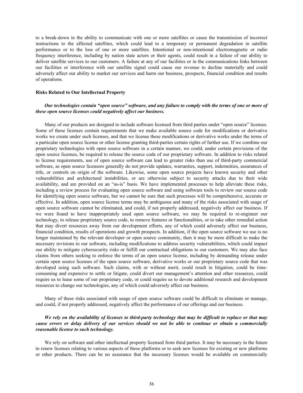 to a break-down in the ability to communicate with one or more satellites or cause the transmission of incorrect instructions to the affected satellites, which could lead to a temporary or permanent degradation in satellite performance or to the loss of one or more satellites. Intentional or non-intentional electromagnetic or radio frequency interference, including by nation state actors or their agents, could result in a failure of our ability to deliver satellite services to our customers. A failure at any of our facilities or in the communications links between our facilities or interference with our satellite signal could cause our revenue to decline materially and could adversely affect our ability to market our services and harm our business, prospects, financial condition and results of operations. Risks Related to Our Intellectual Property Our technologies contain “open source” software, and any failure to comply with the terms of one or more of these open source licenses could negatively affect our business. Many of our products are designed to include software licensed from third parties under “open source” licenses. Some of these licenses contain requirements that we make available source code for modifications or derivative works we create under such licenses, and that we license these modifications or derivative works under the terms of a particular open source license or other license granting third-parties certain rights of further use. If we combine our proprietary technologies with open source software in a certain manner, we could, under certain provisions of the open source licenses, be required to release the source code of our proprietary software. In addition to risks related to license requirements, use of open source software can lead to greater risks than use of third-party commercial software, as open source licensors generally do not provide updates, warranties, support, indemnities, assurances of title, or controls on origin of the software. Likewise, some open source projects have known security and other vulnerabilities and architectural instabilities, or are otherwise subject to security attacks due to their wide availability, and are provided on an “as-is” basis. We have implemented processes to help alleviate these risks, including a review process for evaluating open source software and using software tools to review our source code for identifying open source software, but we cannot be sure that such processes will be comprehensive, accurate or effective. In addition, open source license terms may be ambiguous and many of the risks associated with usage of open source software cannot be eliminated, and could, if not properly addressed, negatively affect our business. If we were found to have inappropriately used open source software, we may be required to re-engineer our technology, to release proprietary source code, to remove features or functionalities, or to take other remedial action that may divert resources away from our development efforts, any of which could adversely affect our business, financial condition, results of operations and growth prospects. In addition, if the open source software we use is no longer maintained by the relevant developer or open source community, then it may be more difficult to make the necessary revisions to our software, including modifications to address security vulnerabilities, which could impact our ability to mitigate cybersecurity risks or fulfill our contractual obligations to our customers. We may also face claims from others seeking to enforce the terms of an open source license, including by demanding release under certain open source licenses of the open source software, derivative works or our proprietary source code that was developed using such software. Such claims, with or without merit, could result in litigation, could be time- consuming and expensive to settle or litigate, could divert our management’s attention and other resources, could require us to lease some of our proprietary code, or could require us to devote additional research and development resources to change our technologies, any of which could adversely affect our business. Many of these risks associated with usage of open source software could be difficult to eliminate or manage, and could, if not properly addressed, negatively affect the performance of our offerings and our business. We rely on the availability of licenses to third-party technology that may be difficult to replace or that may cause errors or delay delivery of our services should we not be able to continue or obtain a commercially reasonable license to such technology. We rely on software and other intellectual property licensed from third parties. It may be necessary in the future to renew licenses relating to various aspects of these platforms or to seek new licenses for existing or new platforms or other products. There can be no assurance that the necessary licenses would be available on commercially 36