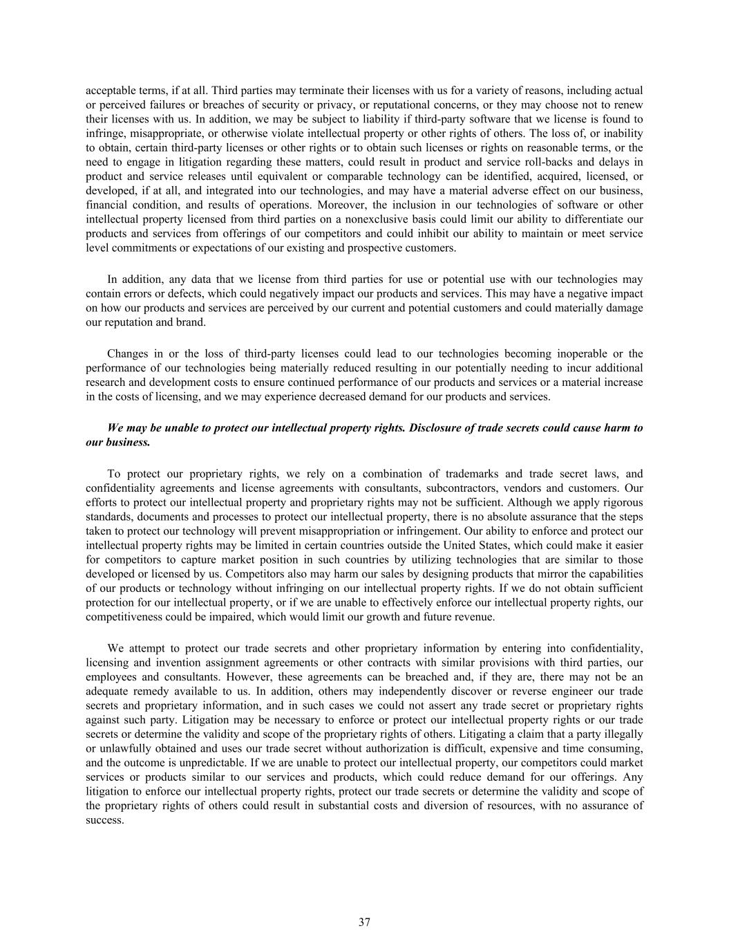 acceptable terms, if at all. Third parties may terminate their licenses with us for a variety of reasons, including actual or perceived failures or breaches of security or privacy, or reputational concerns, or they may choose not to renew their licenses with us. In addition, we may be subject to liability if third-party software that we license is found to infringe, misappropriate, or otherwise violate intellectual property or other rights of others. The loss of, or inability to obtain, certain third-party licenses or other rights or to obtain such licenses or rights on reasonable terms, or the need to engage in litigation regarding these matters, could result in product and service roll-backs and delays in product and service releases until equivalent or comparable technology can be identified, acquired, licensed, or developed, if at all, and integrated into our technologies, and may have a material adverse effect on our business, financial condition, and results of operations. Moreover, the inclusion in our technologies of software or other intellectual property licensed from third parties on a nonexclusive basis could limit our ability to differentiate our products and services from offerings of our competitors and could inhibit our ability to maintain or meet service level commitments or expectations of our existing and prospective customers. In addition, any data that we license from third parties for use or potential use with our technologies may contain errors or defects, which could negatively impact our products and services. This may have a negative impact on how our products and services are perceived by our current and potential customers and could materially damage our reputation and brand. Changes in or the loss of third-party licenses could lead to our technologies becoming inoperable or the performance of our technologies being materially reduced resulting in our potentially needing to incur additional research and development costs to ensure continued performance of our products and services or a material increase in the costs of licensing, and we may experience decreased demand for our products and services. We may be unable to protect our intellectual property rights. Disclosure of trade secrets could cause harm to our business. To protect our proprietary rights, we rely on a combination of trademarks and trade secret laws, and confidentiality agreements and license agreements with consultants, subcontractors, vendors and customers. Our efforts to protect our intellectual property and proprietary rights may not be sufficient. Although we apply rigorous standards, documents and processes to protect our intellectual property, there is no absolute assurance that the steps taken to protect our technology will prevent misappropriation or infringement. Our ability to enforce and protect our intellectual property rights may be limited in certain countries outside the United States, which could make it easier for competitors to capture market position in such countries by utilizing technologies that are similar to those developed or licensed by us. Competitors also may harm our sales by designing products that mirror the capabilities of our products or technology without infringing on our intellectual property rights. If we do not obtain sufficient protection for our intellectual property, or if we are unable to effectively enforce our intellectual property rights, our competitiveness could be impaired, which would limit our growth and future revenue. We attempt to protect our trade secrets and other proprietary information by entering into confidentiality, licensing and invention assignment agreements or other contracts with similar provisions with third parties, our employees and consultants. However, these agreements can be breached and, if they are, there may not be an adequate remedy available to us. In addition, others may independently discover or reverse engineer our trade secrets and proprietary information, and in such cases we could not assert any trade secret or proprietary rights against such party. Litigation may be necessary to enforce or protect our intellectual property rights or our trade secrets or determine the validity and scope of the proprietary rights of others. Litigating a claim that a party illegally or unlawfully obtained and uses our trade secret without authorization is difficult, expensive and time consuming, and the outcome is unpredictable. If we are unable to protect our intellectual property, our competitors could market services or products similar to our services and products, which could reduce demand for our offerings. Any litigation to enforce our intellectual property rights, protect our trade secrets or determine the validity and scope of the proprietary rights of others could result in substantial costs and diversion of resources, with no assurance of success. 37