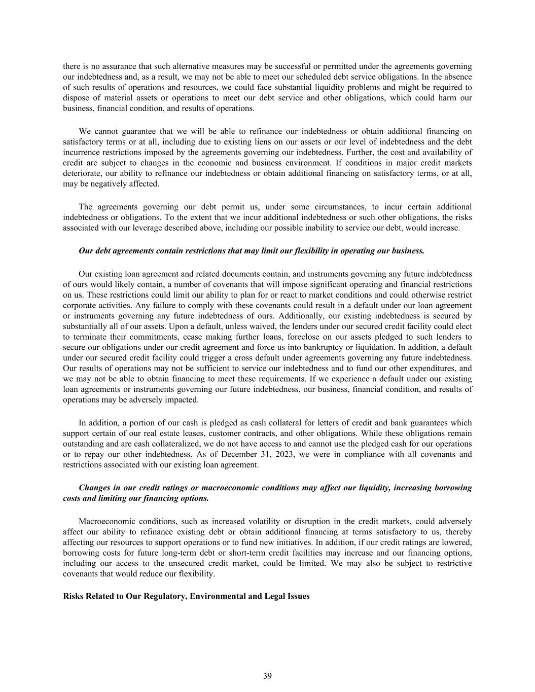 there is no assurance that such alternative measures may be successful or permitted under the agreements governing our indebtedness and, as a result, we may not be able to meet our scheduled debt service obligations. In the absence of such results of operations and resources, we could face substantial liquidity problems and might be required to dispose of material assets or operations to meet our debt service and other obligations, which could harm our business, financial condition, and results of operations. We cannot guarantee that we will be able to refinance our indebtedness or obtain additional financing on satisfactory terms or at all, including due to existing liens on our assets or our level of indebtedness and the debt incurrence restrictions imposed by the agreements governing our indebtedness. Further, the cost and availability of credit are subject to changes in the economic and business environment. If conditions in major credit markets deteriorate, our ability to refinance our indebtedness or obtain additional financing on satisfactory terms, or at all, may be negatively affected. The agreements governing our debt permit us, under some circumstances, to incur certain additional indebtedness or obligations. To the extent that we incur additional indebtedness or such other obligations, the risks associated with our leverage described above, including our possible inability to service our debt, would increase. Our debt agreements contain restrictions that may limit our flexibility in operating our business. Our existing loan agreement and related documents contain, and instruments governing any future indebtedness of ours would likely contain, a number of covenants that will impose significant operating and financial restrictions on us. These restrictions could limit our ability to plan for or react to market conditions and could otherwise restrict corporate activities. Any failure to comply with these covenants could result in a default under our loan agreement or instruments governing any future indebtedness of ours. Additionally, our existing indebtedness is secured by substantially all of our assets. Upon a default, unless waived, the lenders under our secured credit facility could elect to terminate their commitments, cease making further loans, foreclose on our assets pledged to such lenders to secure our obligations under our credit agreement and force us into bankruptcy or liquidation. In addition, a default under our secured credit facility could trigger a cross default under agreements governing any future indebtedness. Our results of operations may not be sufficient to service our indebtedness and to fund our other expenditures, and we may not be able to obtain financing to meet these requirements. If we experience a default under our existing loan agreements or instruments governing our future indebtedness, our business, financial condition, and results of operations may be adversely impacted. In addition, a portion of our cash is pledged as cash collateral for letters of credit and bank guarantees which support certain of our real estate leases, customer contracts, and other obligations. While these obligations remain outstanding and are cash collateralized, we do not have access to and cannot use the pledged cash for our operations or to repay our other indebtedness. As of December 31, 2023, we were in compliance with all covenants and restrictions associated with our existing loan agreement. Changes in our credit ratings or macroeconomic conditions may affect our liquidity, increasing borrowing costs and limiting our financing options. Macroeconomic conditions, such as increased volatility or disruption in the credit markets, could adversely affect our ability to refinance existing debt or obtain additional financing at terms satisfactory to us, thereby affecting our resources to support operations or to fund new initiatives. In addition, if our credit ratings are lowered, borrowing costs for future long-term debt or short-term credit facilities may increase and our financing options, including our access to the unsecured credit market, could be limited. We may also be subject to restrictive covenants that would reduce our flexibility. Risks Related to Our Regulatory, Environmental and Legal Issues 39