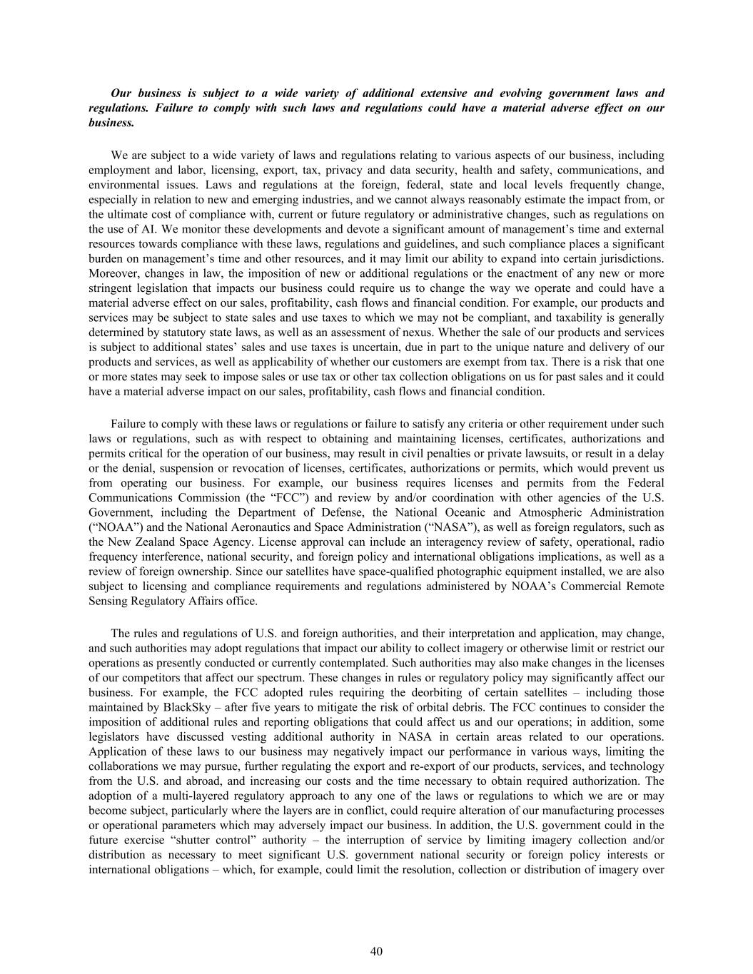 Our business is subject to a wide variety of additional extensive and evolving government laws and regulations. Failure to comply with such laws and regulations could have a material adverse effect on our business. We are subject to a wide variety of laws and regulations relating to various aspects of our business, including employment and labor, licensing, export, tax, privacy and data security, health and safety, communications, and environmental issues. Laws and regulations at the foreign, federal, state and local levels frequently change, especially in relation to new and emerging industries, and we cannot always reasonably estimate the impact from, or the ultimate cost of compliance with, current or future regulatory or administrative changes, such as regulations on the use of AI. We monitor these developments and devote a significant amount of management’s time and external resources towards compliance with these laws, regulations and guidelines, and such compliance places a significant burden on management’s time and other resources, and it may limit our ability to expand into certain jurisdictions. Moreover, changes in law, the imposition of new or additional regulations or the enactment of any new or more stringent legislation that impacts our business could require us to change the way we operate and could have a material adverse effect on our sales, profitability, cash flows and financial condition. For example, our products and services may be subject to state sales and use taxes to which we may not be compliant, and taxability is generally determined by statutory state laws, as well as an assessment of nexus. Whether the sale of our products and services is subject to additional states’ sales and use taxes is uncertain, due in part to the unique nature and delivery of our products and services, as well as applicability of whether our customers are exempt from tax. There is a risk that one or more states may seek to impose sales or use tax or other tax collection obligations on us for past sales and it could have a material adverse impact on our sales, profitability, cash flows and financial condition. Failure to comply with these laws or regulations or failure to satisfy any criteria or other requirement under such laws or regulations, such as with respect to obtaining and maintaining licenses, certificates, authorizations and permits critical for the operation of our business, may result in civil penalties or private lawsuits, or result in a delay or the denial, suspension or revocation of licenses, certificates, authorizations or permits, which would prevent us from operating our business. For example, our business requires licenses and permits from the Federal Communications Commission (the “FCC”) and review by and/or coordination with other agencies of the U.S. Government, including the Department of Defense, the National Oceanic and Atmospheric Administration (“NOAA”) and the National Aeronautics and Space Administration (“NASA”), as well as foreign regulators, such as the New Zealand Space Agency. License approval can include an interagency review of safety, operational, radio frequency interference, national security, and foreign policy and international obligations implications, as well as a review of foreign ownership. Since our satellites have space-qualified photographic equipment installed, we are also subject to licensing and compliance requirements and regulations administered by NOAA’s Commercial Remote Sensing Regulatory Affairs office. The rules and regulations of U.S. and foreign authorities, and their interpretation and application, may change, and such authorities may adopt regulations that impact our ability to collect imagery or otherwise limit or restrict our operations as presently conducted or currently contemplated. Such authorities may also make changes in the licenses of our competitors that affect our spectrum. These changes in rules or regulatory policy may significantly affect our business. For example, the FCC adopted rules requiring the deorbiting of certain satellites – including those maintained by BlackSky – after five years to mitigate the risk of orbital debris. The FCC continues to consider the imposition of additional rules and reporting obligations that could affect us and our operations; in addition, some legislators have discussed vesting additional authority in NASA in certain areas related to our operations. Application of these laws to our business may negatively impact our performance in various ways, limiting the collaborations we may pursue, further regulating the export and re-export of our products, services, and technology from the U.S. and abroad, and increasing our costs and the time necessary to obtain required authorization. The adoption of a multi-layered regulatory approach to any one of the laws or regulations to which we are or may become subject, particularly where the layers are in conflict, could require alteration of our manufacturing processes or operational parameters which may adversely impact our business. In addition, the U.S. government could in the future exercise “shutter control” authority – the interruption of service by limiting imagery collection and/or distribution as necessary to meet significant U.S. government national security or foreign policy interests or international obligations – which, for example, could limit the resolution, collection or distribution of imagery over 40