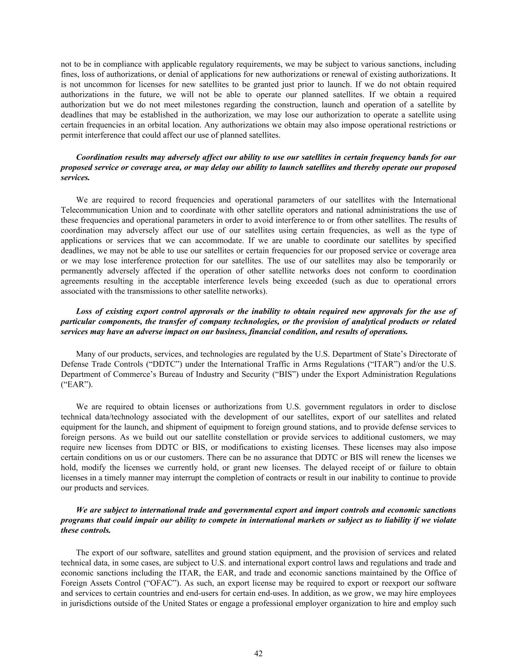 not to be in compliance with applicable regulatory requirements, we may be subject to various sanctions, including fines, loss of authorizations, or denial of applications for new authorizations or renewal of existing authorizations. It is not uncommon for licenses for new satellites to be granted just prior to launch. If we do not obtain required authorizations in the future, we will not be able to operate our planned satellites. If we obtain a required authorization but we do not meet milestones regarding the construction, launch and operation of a satellite by deadlines that may be established in the authorization, we may lose our authorization to operate a satellite using certain frequencies in an orbital location. Any authorizations we obtain may also impose operational restrictions or permit interference that could affect our use of planned satellites. Coordination results may adversely affect our ability to use our satellites in certain frequency bands for our proposed service or coverage area, or may delay our ability to launch satellites and thereby operate our proposed services. We are required to record frequencies and operational parameters of our satellites with the International Telecommunication Union and to coordinate with other satellite operators and national administrations the use of these frequencies and operational parameters in order to avoid interference to or from other satellites. The results of coordination may adversely affect our use of our satellites using certain frequencies, as well as the type of applications or services that we can accommodate. If we are unable to coordinate our satellites by specified deadlines, we may not be able to use our satellites or certain frequencies for our proposed service or coverage area or we may lose interference protection for our satellites. The use of our satellites may also be temporarily or permanently adversely affected if the operation of other satellite networks does not conform to coordination agreements resulting in the acceptable interference levels being exceeded (such as due to operational errors associated with the transmissions to other satellite networks). Loss of existing export control approvals or the inability to obtain required new approvals for the use of particular components, the transfer of company technologies, or the provision of analytical products or related services may have an adverse impact on our business, financial condition, and results of operations. Many of our products, services, and technologies are regulated by the U.S. Department of State’s Directorate of Defense Trade Controls (“DDTC”) under the International Traffic in Arms Regulations (“ITAR”) and/or the U.S. Department of Commerce’s Bureau of Industry and Security (“BIS”) under the Export Administration Regulations (“EAR”). We are required to obtain licenses or authorizations from U.S. government regulators in order to disclose technical data/technology associated with the development of our satellites, export of our satellites and related equipment for the launch, and shipment of equipment to foreign ground stations, and to provide defense services to foreign persons. As we build out our satellite constellation or provide services to additional customers, we may require new licenses from DDTC or BIS, or modifications to existing licenses. These licenses may also impose certain conditions on us or our customers. There can be no assurance that DDTC or BIS will renew the licenses we hold, modify the licenses we currently hold, or grant new licenses. The delayed receipt of or failure to obtain licenses in a timely manner may interrupt the completion of contracts or result in our inability to continue to provide our products and services. We are subject to international trade and governmental export and import controls and economic sanctions programs that could impair our ability to compete in international markets or subject us to liability if we violate these controls. The export of our software, satellites and ground station equipment, and the provision of services and related technical data, in some cases, are subject to U.S. and international export control laws and regulations and trade and economic sanctions including the ITAR, the EAR, and trade and economic sanctions maintained by the Office of Foreign Assets Control (“OFAC”). As such, an export license may be required to export or reexport our software and services to certain countries and end-users for certain end-uses. In addition, as we grow, we may hire employees in jurisdictions outside of the United States or engage a professional employer organization to hire and employ such 42