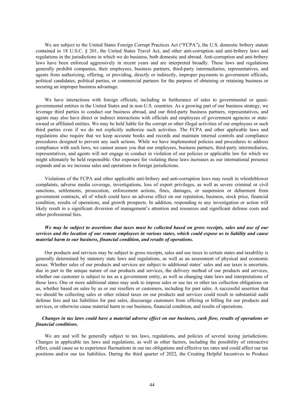 We are subject to the United States Foreign Corrupt Practices Act (“FCPA”), the U.S. domestic bribery statute contained in 18 U.S.C. § 201, the United States Travel Act, and other anti-corruption and anti-bribery laws and regulations in the jurisdictions in which we do business, both domestic and abroad. Anti-corruption and anti-bribery laws have been enforced aggressively in recent years and are interpreted broadly. These laws and regulations generally prohibit companies, their employees, business partners, third-party intermediaries, representatives, and agents from authorizing, offering, or providing, directly or indirectly, improper payments to government officials, political candidates, political parties, or commercial partners for the purpose of obtaining or retaining business or securing an improper business advantage. We have interactions with foreign officials, including in furtherance of sales to governmental or quasi- governmental entities in the United States and in non-U.S. countries. As a growing part of our business strategy, we leverage third parties to conduct our business abroad, and our third-party business partners, representatives, and agents may also have direct or indirect interactions with officials and employees of government agencies or state- owned or affiliated entities. We may be held liable for the corrupt or other illegal activities of our employees or such third parties even if we do not explicitly authorize such activities. The FCPA and other applicable laws and regulations also require that we keep accurate books and records and maintain internal controls and compliance procedures designed to prevent any such actions. While we have implemented policies and procedures to address compliance with such laws, we cannot assure you that our employees, business partners, third-party intermediaries, representatives, and agents will not engage in conduct in violation of our policies or applicable law for which we might ultimately be held responsible. Our exposure for violating these laws increases as our international presence expands and as we increase sales and operations in foreign jurisdictions. Violations of the FCPA and other applicable anti-bribery and anti-corruption laws may result in whistleblower complaints, adverse media coverage, investigations, loss of export privileges, as well as severe criminal or civil sanctions, settlements, prosecution, enforcement actions, fines, damages, or suspension or debarment from government contracts, all of which could have an adverse effect on our reputation, business, stock price, financial condition, results of operations, and growth prospects. In addition, responding to any investigation or action will likely result in a significant diversion of management’s attention and resources and significant defense costs and other professional fees. We may be subject to assertions that taxes must be collected based on gross receipts, sales and use of our services and the location of our remote employees in various states, which could expose us to liability and cause material harm to our business, financial condition, and results of operations. Our products and services may be subject to gross receipts, sales and use taxes in certain states and taxability is generally determined by statutory state laws and regulations, as well as an assessment of physical and economic nexus. Whether sales of our products and services are subject to additional states’ sales and use taxes is uncertain, due in part to the unique nature of our products and services, the delivery method of our products and services, whether our customer is subject to tax as a government entity, as well as changing state laws and interpretations of those laws. One or more additional states may seek to impose sales or use tax or other tax collection obligations on us, whether based on sales by us or our resellers or customers, including for past sales. A successful assertion that we should be collecting sales or other related taxes on our products and services could result in substantial audit defense fees and tax liabilities for past sales, discourage customers from offering or billing for our products and services, or otherwise cause material harm to our business, financial condition, and results of operations. Changes in tax laws could have a material adverse effect on our business, cash flow, results of operations or financial conditions. We are and will be generally subject to tax laws, regulations, and policies of several taxing jurisdictions. Changes in applicable tax laws and regulations, as well as other factors, including the possibility of retroactive effect, could cause us to experience fluctuations in our tax obligations and effective tax rates and could affect our tax positions and/or our tax liabilities. During the third quarter of 2022, the Creating Helpful Incentives to Produce 44