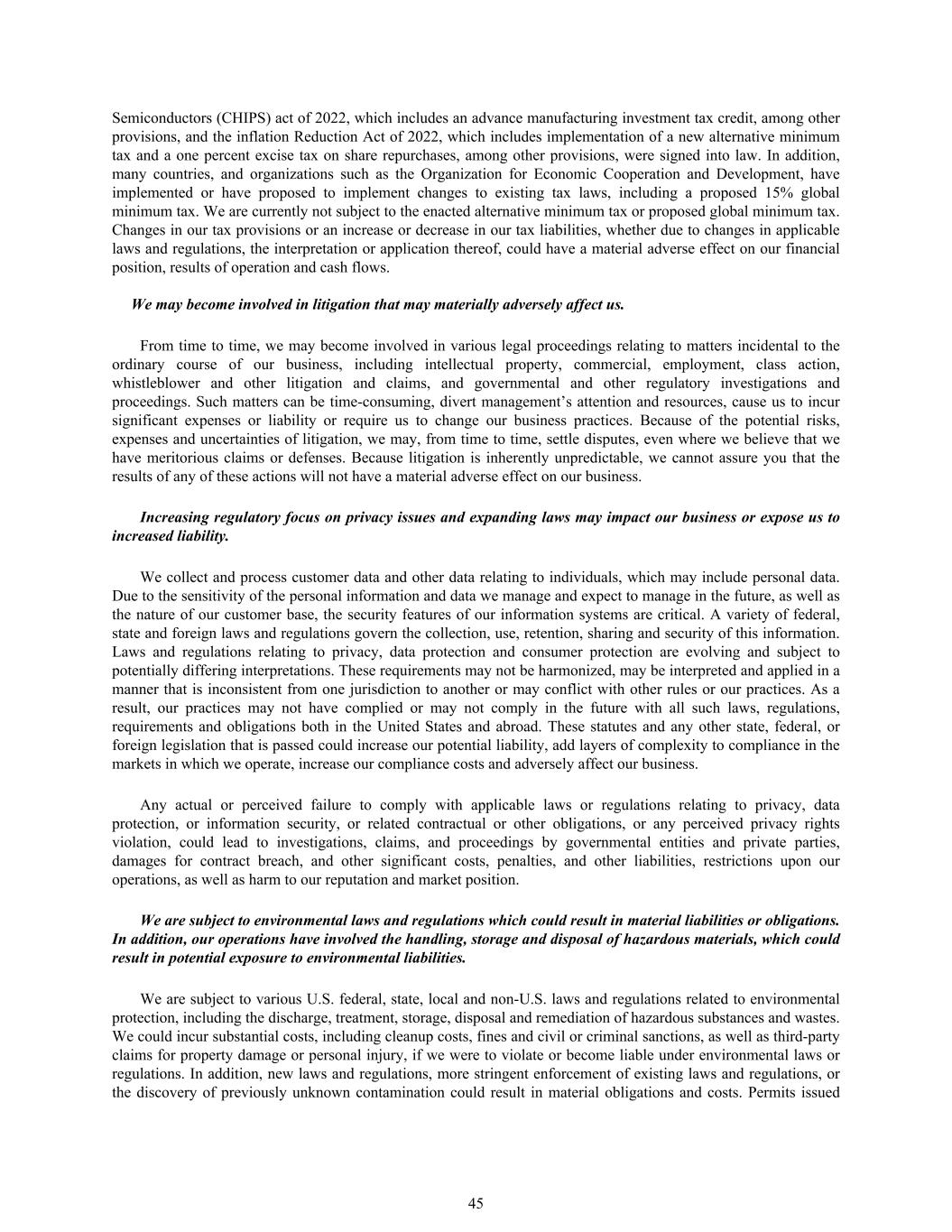Semiconductors (CHIPS) act of 2022, which includes an advance manufacturing investment tax credit, among other provisions, and the inflation Reduction Act of 2022, which includes implementation of a new alternative minimum tax and a one percent excise tax on share repurchases, among other provisions, were signed into law. In addition, many countries, and organizations such as the Organization for Economic Cooperation and Development, have implemented or have proposed to implement changes to existing tax laws, including a proposed 15% global minimum tax. We are currently not subject to the enacted alternative minimum tax or proposed global minimum tax. Changes in our tax provisions or an increase or decrease in our tax liabilities, whether due to changes in applicable laws and regulations, the interpretation or application thereof, could have a material adverse effect on our financial position, results of operation and cash flows. We may become involved in litigation that may materially adversely affect us. From time to time, we may become involved in various legal proceedings relating to matters incidental to the ordinary course of our business, including intellectual property, commercial, employment, class action, whistleblower and other litigation and claims, and governmental and other regulatory investigations and proceedings. Such matters can be time-consuming, divert management’s attention and resources, cause us to incur significant expenses or liability or require us to change our business practices. Because of the potential risks, expenses and uncertainties of litigation, we may, from time to time, settle disputes, even where we believe that we have meritorious claims or defenses. Because litigation is inherently unpredictable, we cannot assure you that the results of any of these actions will not have a material adverse effect on our business. Increasing regulatory focus on privacy issues and expanding laws may impact our business or expose us to increased liability. We collect and process customer data and other data relating to individuals, which may include personal data. Due to the sensitivity of the personal information and data we manage and expect to manage in the future, as well as the nature of our customer base, the security features of our information systems are critical. A variety of federal, state and foreign laws and regulations govern the collection, use, retention, sharing and security of this information. Laws and regulations relating to privacy, data protection and consumer protection are evolving and subject to potentially differing interpretations. These requirements may not be harmonized, may be interpreted and applied in a manner that is inconsistent from one jurisdiction to another or may conflict with other rules or our practices. As a result, our practices may not have complied or may not comply in the future with all such laws, regulations, requirements and obligations both in the United States and abroad. These statutes and any other state, federal, or foreign legislation that is passed could increase our potential liability, add layers of complexity to compliance in the markets in which we operate, increase our compliance costs and adversely affect our business. Any actual or perceived failure to comply with applicable laws or regulations relating to privacy, data protection, or information security, or related contractual or other obligations, or any perceived privacy rights violation, could lead to investigations, claims, and proceedings by governmental entities and private parties, damages for contract breach, and other significant costs, penalties, and other liabilities, restrictions upon our operations, as well as harm to our reputation and market position. We are subject to environmental laws and regulations which could result in material liabilities or obligations. In addition, our operations have involved the handling, storage and disposal of hazardous materials, which could result in potential exposure to environmental liabilities. We are subject to various U.S. federal, state, local and non-U.S. laws and regulations related to environmental protection, including the discharge, treatment, storage, disposal and remediation of hazardous substances and wastes. We could incur substantial costs, including cleanup costs, fines and civil or criminal sanctions, as well as third-party claims for property damage or personal injury, if we were to violate or become liable under environmental laws or regulations. In addition, new laws and regulations, more stringent enforcement of existing laws and regulations, or the discovery of previously unknown contamination could result in material obligations and costs. Permits issued 45