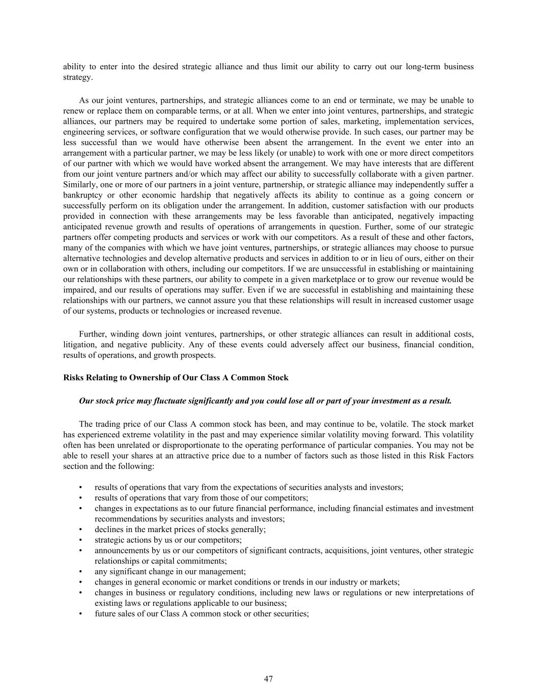 ability to enter into the desired strategic alliance and thus limit our ability to carry out our long-term business strategy. As our joint ventures, partnerships, and strategic alliances come to an end or terminate, we may be unable to renew or replace them on comparable terms, or at all. When we enter into joint ventures, partnerships, and strategic alliances, our partners may be required to undertake some portion of sales, marketing, implementation services, engineering services, or software configuration that we would otherwise provide. In such cases, our partner may be less successful than we would have otherwise been absent the arrangement. In the event we enter into an arrangement with a particular partner, we may be less likely (or unable) to work with one or more direct competitors of our partner with which we would have worked absent the arrangement. We may have interests that are different from our joint venture partners and/or which may affect our ability to successfully collaborate with a given partner. Similarly, one or more of our partners in a joint venture, partnership, or strategic alliance may independently suffer a bankruptcy or other economic hardship that negatively affects its ability to continue as a going concern or successfully perform on its obligation under the arrangement. In addition, customer satisfaction with our products provided in connection with these arrangements may be less favorable than anticipated, negatively impacting anticipated revenue growth and results of operations of arrangements in question. Further, some of our strategic partners offer competing products and services or work with our competitors. As a result of these and other factors, many of the companies with which we have joint ventures, partnerships, or strategic alliances may choose to pursue alternative technologies and develop alternative products and services in addition to or in lieu of ours, either on their own or in collaboration with others, including our competitors. If we are unsuccessful in establishing or maintaining our relationships with these partners, our ability to compete in a given marketplace or to grow our revenue would be impaired, and our results of operations may suffer. Even if we are successful in establishing and maintaining these relationships with our partners, we cannot assure you that these relationships will result in increased customer usage of our systems, products or technologies or increased revenue. Further, winding down joint ventures, partnerships, or other strategic alliances can result in additional costs, litigation, and negative publicity. Any of these events could adversely affect our business, financial condition, results of operations, and growth prospects. Risks Relating to Ownership of Our Class A Common Stock Our stock price may fluctuate significantly and you could lose all or part of your investment as a result. The trading price of our Class A common stock has been, and may continue to be, volatile. The stock market has experienced extreme volatility in the past and may experience similar volatility moving forward. This volatility often has been unrelated or disproportionate to the operating performance of particular companies. You may not be able to resell your shares at an attractive price due to a number of factors such as those listed in this Risk Factors section and the following: • results of operations that vary from the expectations of securities analysts and investors; • results of operations that vary from those of our competitors; • changes in expectations as to our future financial performance, including financial estimates and investment recommendations by securities analysts and investors; • declines in the market prices of stocks generally; • strategic actions by us or our competitors; • announcements by us or our competitors of significant contracts, acquisitions, joint ventures, other strategic relationships or capital commitments; • any significant change in our management; • changes in general economic or market conditions or trends in our industry or markets; • changes in business or regulatory conditions, including new laws or regulations or new interpretations of existing laws or regulations applicable to our business; • future sales of our Class A common stock or other securities; 47
