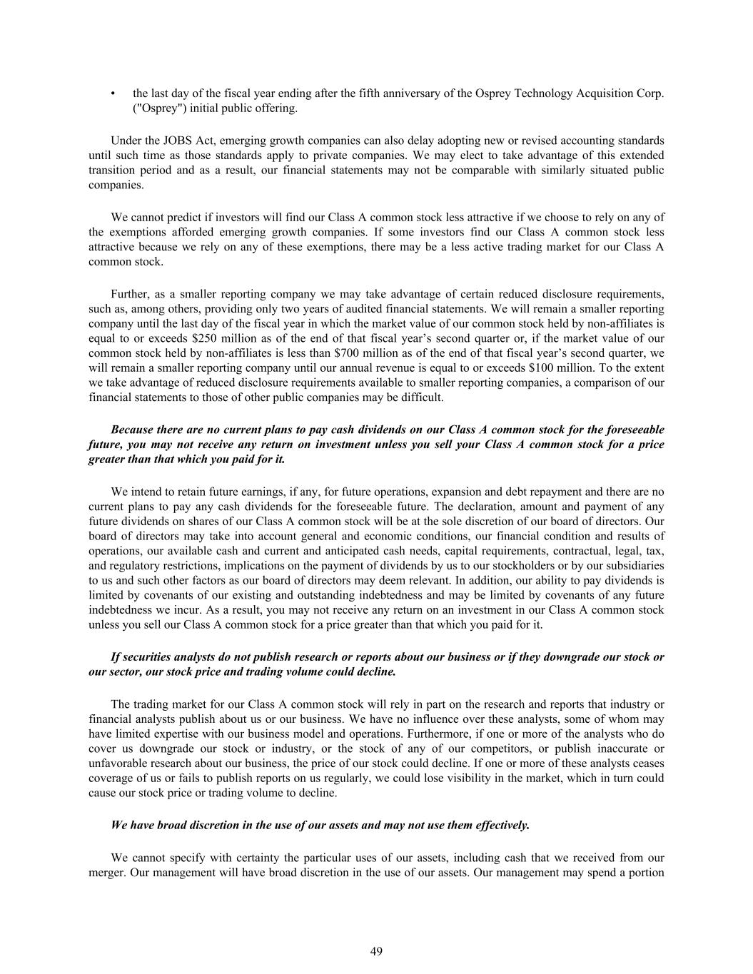 • the last day of the fiscal year ending after the fifth anniversary of the Osprey Technology Acquisition Corp. ("Osprey") initial public offering. Under the JOBS Act, emerging growth companies can also delay adopting new or revised accounting standards until such time as those standards apply to private companies. We may elect to take advantage of this extended transition period and as a result, our financial statements may not be comparable with similarly situated public companies. We cannot predict if investors will find our Class A common stock less attractive if we choose to rely on any of the exemptions afforded emerging growth companies. If some investors find our Class A common stock less attractive because we rely on any of these exemptions, there may be a less active trading market for our Class A common stock. Further, as a smaller reporting company we may take advantage of certain reduced disclosure requirements, such as, among others, providing only two years of audited financial statements. We will remain a smaller reporting company until the last day of the fiscal year in which the market value of our common stock held by non-affiliates is equal to or exceeds $250 million as of the end of that fiscal year’s second quarter or, if the market value of our common stock held by non-affiliates is less than $700 million as of the end of that fiscal year’s second quarter, we will remain a smaller reporting company until our annual revenue is equal to or exceeds $100 million. To the extent we take advantage of reduced disclosure requirements available to smaller reporting companies, a comparison of our financial statements to those of other public companies may be difficult. Because there are no current plans to pay cash dividends on our Class A common stock for the foreseeable future, you may not receive any return on investment unless you sell your Class A common stock for a price greater than that which you paid for it. We intend to retain future earnings, if any, for future operations, expansion and debt repayment and there are no current plans to pay any cash dividends for the foreseeable future. The declaration, amount and payment of any future dividends on shares of our Class A common stock will be at the sole discretion of our board of directors. Our board of directors may take into account general and economic conditions, our financial condition and results of operations, our available cash and current and anticipated cash needs, capital requirements, contractual, legal, tax, and regulatory restrictions, implications on the payment of dividends by us to our stockholders or by our subsidiaries to us and such other factors as our board of directors may deem relevant. In addition, our ability to pay dividends is limited by covenants of our existing and outstanding indebtedness and may be limited by covenants of any future indebtedness we incur. As a result, you may not receive any return on an investment in our Class A common stock unless you sell our Class A common stock for a price greater than that which you paid for it. If securities analysts do not publish research or reports about our business or if they downgrade our stock or our sector, our stock price and trading volume could decline. The trading market for our Class A common stock will rely in part on the research and reports that industry or financial analysts publish about us or our business. We have no influence over these analysts, some of whom may have limited expertise with our business model and operations. Furthermore, if one or more of the analysts who do cover us downgrade our stock or industry, or the stock of any of our competitors, or publish inaccurate or unfavorable research about our business, the price of our stock could decline. If one or more of these analysts ceases coverage of us or fails to publish reports on us regularly, we could lose visibility in the market, which in turn could cause our stock price or trading volume to decline. We have broad discretion in the use of our assets and may not use them effectively. We cannot specify with certainty the particular uses of our assets, including cash that we received from our merger. Our management will have broad discretion in the use of our assets. Our management may spend a portion 49