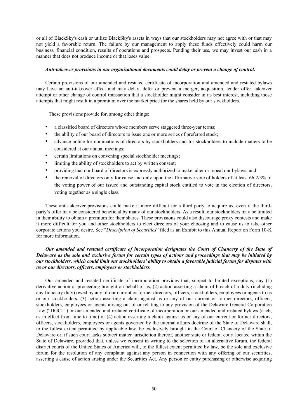 or all of BlackSky's cash or utilize BlackSky's assets in ways that our stockholders may not agree with or that may not yield a favorable return. The failure by our management to apply these funds effectively could harm our business, financial condition, results of operations and prospects. Pending their use, we may invest our cash in a manner that does not produce income or that loses value. Anti-takeover provisions in our organizational documents could delay or prevent a change of control. Certain provisions of our amended and restated certificate of incorporation and amended and restated bylaws may have an anti-takeover effect and may delay, defer or prevent a merger, acquisition, tender offer, takeover attempt or other change of control transaction that a stockholder might consider in its best interest, including those attempts that might result in a premium over the market price for the shares held by our stockholders. These provisions provide for, among other things: • a classified board of directors whose members serve staggered three-year terms; • the ability of our board of directors to issue one or more series of preferred stock; • advance notice for nominations of directors by stockholders and for stockholders to include matters to be considered at our annual meetings; • certain limitations on convening special stockholder meetings; • limiting the ability of stockholders to act by written consent; • providing that our board of directors is expressly authorized to make, alter or repeal our bylaws; and • the removal of directors only for cause and only upon the affirmative vote of holders of at least 66 2/3% of the voting power of our issued and outstanding capital stock entitled to vote in the election of directors, voting together as a single class. These anti-takeover provisions could make it more difficult for a third party to acquire us, even if the third- party’s offer may be considered beneficial by many of our stockholders. As a result, our stockholders may be limited in their ability to obtain a premium for their shares. These provisions could also discourage proxy contests and make it more difficult for you and other stockholders to elect directors of your choosing and to cause us to take other corporate actions you desire. See “Description of Securities” filed as an Exhibit to this Annual Report on Form 10-K for more information. Our amended and restated certificate of incorporation designates the Court of Chancery of the State of Delaware as the sole and exclusive forum for certain types of actions and proceedings that may be initiated by our stockholders, which could limit our stockholders’ ability to obtain a favorable judicial forum for disputes with us or our directors, officers, employees or stockholders. Our amended and restated certificate of incorporation provides that, subject to limited exceptions, any (1) derivative action or proceeding brought on behalf of us, (2) action asserting a claim of breach of a duty (including any fiduciary duty) owed by any of our current or former directors, officers, stockholders, employees or agents to us or our stockholders, (3) action asserting a claim against us or any of our current or former directors, officers, stockholders, employees or agents arising out of or relating to any provision of the Delaware General Corporation Law (“DGCL”) or our amended and restated certificate of incorporation or our amended and restated bylaws (each, as in effect from time to time) or (4) action asserting a claim against us or any of our current or former directors, officers, stockholders, employees or agents governed by the internal affairs doctrine of the State of Delaware shall, to the fullest extent permitted by applicable law, be exclusively brought in the Court of Chancery of the State of Delaware or, if such court lacks subject matter jurisdiction thereof, another state or federal court located within the State of Delaware, provided that, unless we consent in writing to the selection of an alternative forum, the federal district courts of the United States of America will, to the fullest extent permitted by law, be the sole and exclusive forum for the resolution of any complaint against any person in connection with any offering of our securities, asserting a cause of action arising under the Securities Act. Any person or entity purchasing or otherwise acquiring 50
