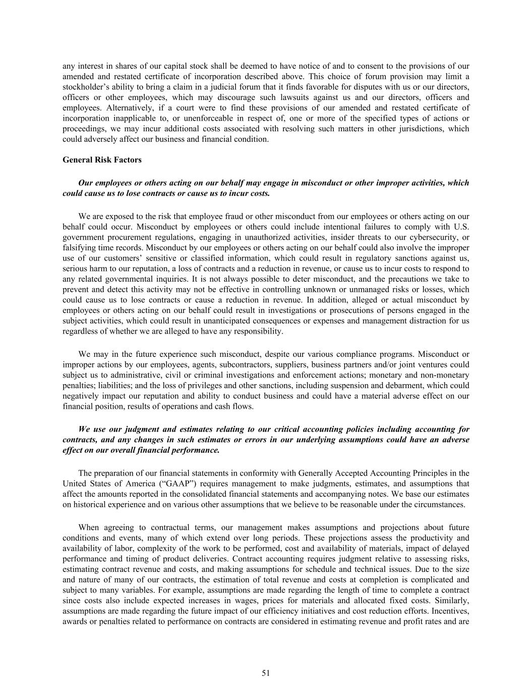 any interest in shares of our capital stock shall be deemed to have notice of and to consent to the provisions of our amended and restated certificate of incorporation described above. This choice of forum provision may limit a stockholder’s ability to bring a claim in a judicial forum that it finds favorable for disputes with us or our directors, officers or other employees, which may discourage such lawsuits against us and our directors, officers and employees. Alternatively, if a court were to find these provisions of our amended and restated certificate of incorporation inapplicable to, or unenforceable in respect of, one or more of the specified types of actions or proceedings, we may incur additional costs associated with resolving such matters in other jurisdictions, which could adversely affect our business and financial condition. General Risk Factors Our employees or others acting on our behalf may engage in misconduct or other improper activities, which could cause us to lose contracts or cause us to incur costs. We are exposed to the risk that employee fraud or other misconduct from our employees or others acting on our behalf could occur. Misconduct by employees or others could include intentional failures to comply with U.S. government procurement regulations, engaging in unauthorized activities, insider threats to our cybersecurity, or falsifying time records. Misconduct by our employees or others acting on our behalf could also involve the improper use of our customers’ sensitive or classified information, which could result in regulatory sanctions against us, serious harm to our reputation, a loss of contracts and a reduction in revenue, or cause us to incur costs to respond to any related governmental inquiries. It is not always possible to deter misconduct, and the precautions we take to prevent and detect this activity may not be effective in controlling unknown or unmanaged risks or losses, which could cause us to lose contracts or cause a reduction in revenue. In addition, alleged or actual misconduct by employees or others acting on our behalf could result in investigations or prosecutions of persons engaged in the subject activities, which could result in unanticipated consequences or expenses and management distraction for us regardless of whether we are alleged to have any responsibility. We may in the future experience such misconduct, despite our various compliance programs. Misconduct or improper actions by our employees, agents, subcontractors, suppliers, business partners and/or joint ventures could subject us to administrative, civil or criminal investigations and enforcement actions; monetary and non-monetary penalties; liabilities; and the loss of privileges and other sanctions, including suspension and debarment, which could negatively impact our reputation and ability to conduct business and could have a material adverse effect on our financial position, results of operations and cash flows. We use our judgment and estimates relating to our critical accounting policies including accounting for contracts, and any changes in such estimates or errors in our underlying assumptions could have an adverse effect on our overall financial performance. The preparation of our financial statements in conformity with Generally Accepted Accounting Principles in the United States of America (“GAAP”) requires management to make judgments, estimates, and assumptions that affect the amounts reported in the consolidated financial statements and accompanying notes. We base our estimates on historical experience and on various other assumptions that we believe to be reasonable under the circumstances. When agreeing to contractual terms, our management makes assumptions and projections about future conditions and events, many of which extend over long periods. These projections assess the productivity and availability of labor, complexity of the work to be performed, cost and availability of materials, impact of delayed performance and timing of product deliveries. Contract accounting requires judgment relative to assessing risks, estimating contract revenue and costs, and making assumptions for schedule and technical issues. Due to the size and nature of many of our contracts, the estimation of total revenue and costs at completion is complicated and subject to many variables. For example, assumptions are made regarding the length of time to complete a contract since costs also include expected increases in wages, prices for materials and allocated fixed costs. Similarly, assumptions are made regarding the future impact of our efficiency initiatives and cost reduction efforts. Incentives, awards or penalties related to performance on contracts are considered in estimating revenue and profit rates and are 51